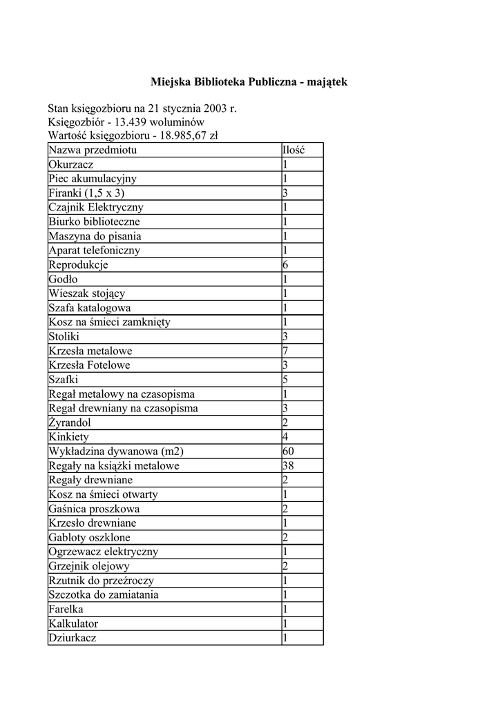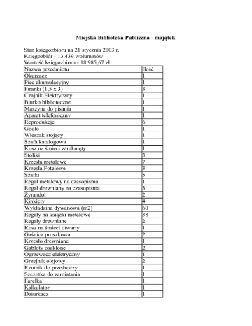 Miejska Biblioteka Publiczna - majątek Stan księgozbioru na 21 stycznia 2003 r. Księgozbiór - 13.439 woluminów Wartość księgozbioru - 18.985,67 zł Nazwa przedmiotu Okurzacz Piec akumulacyjny Firanki (1,5 x 3) Czajnik Elektryczny Biurko biblioteczne Maszyna do pisania Aparat telefoniczny Reprodukcje Godło Wieszak stojący Szafa katalogowa Kosz na śmieci zamknięty Stoliki Krzesła metalowe Krzesła Fotelowe Szafki Regał metalowy na czasopisma Regał drewniany na czasopisma Żyrandol Kinkiety Wykładzina dywanowa (m2) Regały na książki metalowe Regały drewniane Kosz na śmieci otwarty Gaśnica proszkowa Krzesło drewniane Gabloty oszklone Ogrzewacz elektryczny Grzejnik olejowy Rzutnik do przeźroczy Szczotka do zamiatania Farelka Kalkulator Dziurkacz Ilość 1 1 3 1 1 1 1 6 1 1 1 1 3 7 3 5 1 3 2 4 60 38 2 1 2 1 2 1 2 1 1 1 1 1 Radio Komputer Drukarka Skaner 1 1 1 1