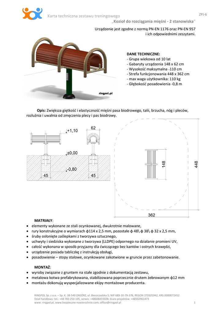 ZPJ-6 Karta techniczna zestawu treningowego „Kozioł do rozciągania mięśni - 2 stanowiska” Urządzenie jest zgodne z normą PN-EN 1176 oraz PN-EN 957 i ich odpowiednimi zeszytami. DANE TECHNICZNE: - Grupa wiekowa od 10 lat - Gabaryty urządzenia 148 x 62 cm - Wysokość maksymalna ~110 cm - Strefa funkcjonowania 448 x 362 cm - max waga użytkownika: 110 kg - Głębokość posadowienia -0,8 m Opis: Zwiększa giętkość i elastyczność mięśni pasa biodrowego, talii, brzucha, nóg i pleców, rozluźnia i uwalnia od zmęczenia plecy i pas biodrowy.        MATRIAŁY: elementy wykonane ze stali ocynkowanej, dwukrotnie malowane, rury konstrukcyjne o wymiarach φ114 x 2,5 mm, pozostałe φ 48\ φ 38\ φ 32 x 2,5 mm, śruby osłonięte zaślepkami z tworzywa sztucznego, uchwyty i siedziska wykonane z tworzywa (LLDPE) odpornego na działanie promieni UV, całość wykonana w sposób przyjazny dla ćwiczącego bez kantów i ostrych krawędzi, urządzenie posiada tabliczkę z instrukcją obsługi, posadowienie – stopy stalowe, ocynkowane zakotwione w gruncie przez zabetonowanie. MONTAŻ:  wyroby związane z gruntem na stałe zgodnie z dokumentacją zestawu,  metalowa kotwa prefabrykowana, stabilizowana poprzecznie drutem żebrowanym φ12 mm  montażu dokonują wyspecjalizowane ekipy montażowe producenta. RINGPOL Sp. z o.o. – Sp. K. 38-540 ZAGÓRZ, ul. Bieszczadzka 5; NIP 689-10-79-376, REGON 370325942, KRS 0000072452 Dział handlowy: tel.: +48 783 250 105, serwis: +48608455028; biuro projektów: +48502961473 www. ringpol.pl, www.bezpieczne-nawierzchnie.com; [email protected] 1