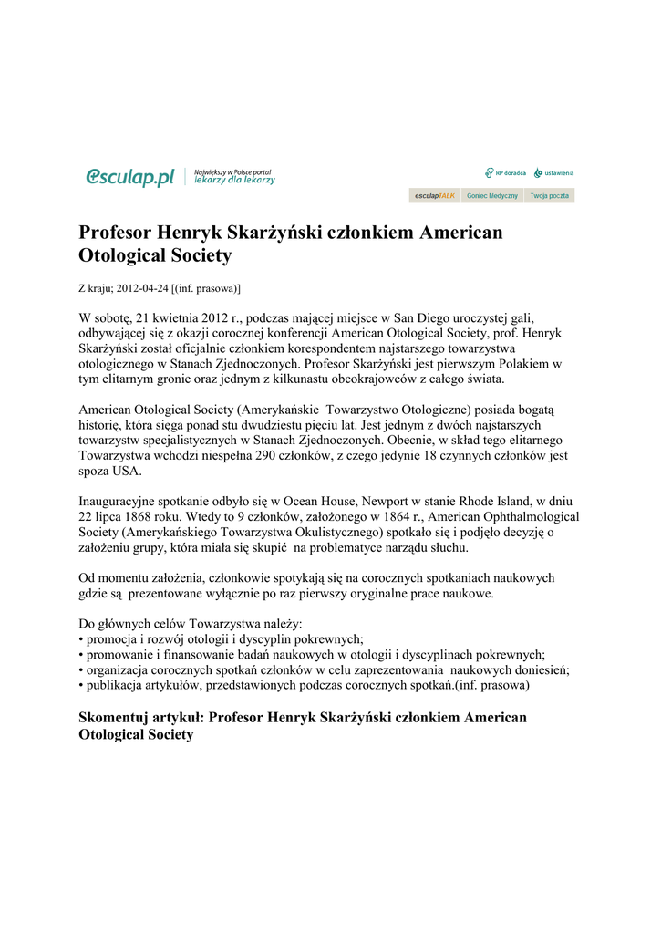 Profesor Henryk Skarżyński członkiem American Otological Society Z kraju; 2012-04-24 [(inf. prasowa)] W sobotę, 21 kwietnia 2012 r., podczas mającej miejsce w San Diego uroczystej gali, odbywającej się z okazji corocznej konferencji American Otological Society, prof. Henryk Skarżyński został oficjalnie członkiem korespondentem najstarszego towarzystwa otologicznego w Stanach Zjednoczonych. Profesor Skarżyński jest pierwszym Polakiem w tym elitarnym gronie oraz jednym z kilkunastu obcokrajowców z całego świata. American Otological Society (Amerykańskie Towarzystwo Otologiczne) posiada bogatą historię, która sięga ponad stu dwudziestu pięciu lat. Jest jednym z dwóch najstarszych towarzystw specjalistycznych w Stanach Zjednoczonych. Obecnie, w skład tego elitarnego Towarzystwa wchodzi niespełna 290 członków, z czego jedynie 18 czynnych członków jest spoza USA. Inauguracyjne spotkanie odbyło się w Ocean House, Newport w stanie Rhode Island, w dniu 22 lipca 1868 roku. Wtedy to 9 członków, założonego w 1864 r., American Ophthalmological Society (Amerykańskiego Towarzystwa Okulistycznego) spotkało się i podjęło decyzję o założeniu grupy, która miała się skupić na problematyce narządu słuchu. Od momentu założenia, członkowie spotykają się na corocznych spotkaniach naukowych gdzie są prezentowane wyłącznie po raz pierwszy oryginalne prace naukowe. Do głównych celów Towarzystwa należy: • promocja i rozwój otologii i dyscyplin pokrewnych; • promowanie i finansowanie badań naukowych w otologii i dyscyplinach pokrewnych; • organizacja corocznych spotkań członków w celu zaprezentowania naukowych doniesień; • publikacja artykułów, przedstawionych podczas corocznych spotkań.(inf. prasowa) Skomentuj artykuł: Profesor Henryk Skarżyński członkiem American Otological Society