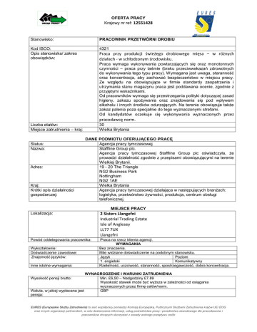 OFERTA PRACY Krajowy nr ref: 12551428 Stanowisko: PRACOWNIK PRZETWÓRNI DROBIU Kod ISCO: Opis stanowiska/ zakres obowiązków: 4321 Praca przy produkcji świeżego drobiowego mięsa – w różnych działach - w schłodzonym środowisku. Praca wymaga wykonywania powtarzających się oraz monotonnych czynności – praca przy taśmie (braku przeciwwskazań zdrowotnych do wykonywania tego typu pracy). Wymagana jest uwaga, staranność oraz koncentracja, aby zachować bezpieczeństwo w miejscu pracy. Ze względu na obowiązujące w firmie standardy zaopatrzenia i utrzymania stanu magazynu praca jest poddawana ocenie, zgodnie z przyjętymi wskaźnikami. Od pracowników wymaga się przestrzegania polityki dotyczącej zasad higieny, zakazu spożywania oraz znajdowania się pod wpływem alkoholu i innych środków odurzających. Na terenie obowiązuje także zakaz palenia poza specjalnie do tego wyznaczonymi strefami. Od kandydatów oczekuje się wykonywania wyznaczonych przez pracodawcę norm. Liczba etatów: Miejsce zatrudnienia – kraj: Status: Nazwa: Adres: Kraj: Krótki opis działalności gospodarczej: 30 Wielka Brytania DANE PODMIOTU OFERUJĄCEGO PRACĘ Agencja pracy tymczasowej Staffline Group plc. Agencja pracy tymczasowej Staffline Group plc oświadczyła, że prowadzi działalność zgodnie z przepisami obowiązującymi na terenie Wielkiej Brytanii. 19 - 20 The Triangle NG2 Business Park Nottingham NG2 1AE Wielka Brytania Agencja pracy tymczasowej działająca w następujących branżach: logistyka, przetwórstwo żywności, produkcja, centrum obsługi telefonicznej. MIEJSCE PRACY Lokalizacja: 2 Sisters Llangefni Industrial Trading Estate Isle of Anglesey LL77 7UX Llangefni Powód oddelegowania pracownika: Praca na rzecz klienta agencji. WYMAGANIA Bez znaczenia. Mile widziane doświadczenie na podobnym stanowisku. Język Poziom 1. angielski Komunikatywny Rzetelność, uczciwość, staranność, spostrzegawczość, dobra koncentracja. Wykształcenie: Doświadczenie zawodowe: Znajomość języków: Inne istotne wymagania: WYNAGRODZENIE I WARUNKI ZATRUDNIENIA Min. £6,50 – Nadgodziny £7.89 Wysokość stawek może być wyższa w zależności od osiągania wyznaczonych przez firmę celów/norm. Waluta, w jakiej wypłacana jest GBP pensja: Wysokość pensji brutto: EURES (Europejskie Służby Zatrudnienia) to sieć współpracy pomiędzy Komisją Europejską, Publicznymi Służbami Zatrudnienia krajów UE/ EOG oraz innych organizacji partnerskich, w celu dostarczania informacji, usług pośrednictwa pracy i poradnictwa zawodowego dla pracodawców i pracowników chcących skorzystać z zasady wolnego przepływu osób Rodzaj stawki wynagrodzenia: Dodatkowe świadczenia (zakwaterowanie, wyżywienie, koszty związane ze zmianą miejsca zamieszkania, koszty podróży itp.): Nazwa firmy, z którą zostanie podpisana umowa: Rodzaj umowy: Wymiar czasu pracy Czas trwania umowy: (nieokreślony/ określony) Liczba godzin tygodniowo: Zmiany i praca w dni wolne: Data rozpoczęcia: Inne informacje: Wymagane dokumenty (list motywacyjny, CV itp.): Język, w którym muszą być sporządzone przedkładane dokumenty: Do kogo należy wysłać dokumenty: (do pracodawcy/ doradcy EURES) Gdzie należy wysłać dokumenty: (adres, adres e-mail, nr faksu z kodem kraju itp.) Dane teleadresowe doradcy EURES lub przedstawiciela pracodawcy: godzinowa Pracodawca nie organizuje transportu oraz zakwaterowania, nie pokrywa kosztów w tym zakresie. Pracodawca na prośbę kandydata może pomóc w znalezieniu zakwaterowania. Pracodawca zapewnia szkolenie ok. 2-3 dni, płatne przez pracodawcę oraz ubranie robocze. Kandydaci są proszeni o zaopatrzenie się w buty robocze z metalowymi podnoskami – koszt zakupu obuwia leży pod stronie kandydata. Staffline Group plc. Umowa na czas określony z agencją pracy tymczasowej. Pełen etat. 12 tygodni z możliwością przedłużenia. Pracodawca poszukuje kandydatów do pracy na dłuższy okres czasu. Gwarantowana minimalna liczba godzin pracy - 40 godzin tygodniowo. Praca w trybie zmianowym Tak szybko jak to będzie możliwe. Pracodawca oferuje szkolenie 2-3 dni, płatne przez pracodawcę oraz ubranie robocze. Kandydaci są proszeni o zaopatrzenie się w buty z metalowymi podnoskami – koszt zakupu leży pod stronie kandydata. SPOSÓB SKŁADANIA WNIOSKU CV Języku angielskim lub polskim Kandydaci proszeni są o przesłanie CV do doradcy EURES z Wojewódzkiego Urzędu Pracy w Białymstoku Harmonogram rozmów kwalifikacyjnych: 18 lutego – Katowice 25 lutego - Opole 26 lutego – Wrocław 17-18 marca - Białystok Do doradcy EURES, email: [email protected] – w tytule emaila proszę wpisać - Wielka Brytania - pracownik przetwórni drobiu” oraz wskazać miejsca odbycia ewentualnej rozmowy kwalifikacyjnej, np. Białystok Tel. 85 74 97 235 Koordynator oferty – WUP w Rzeszowie: doradca EURES Wojciech Woś tel. 17 850 92 23, [email protected] DODATKOWE INFORMACJE Rozmowy kwalifikacyjne z wybranymi osobami odbędą się w języku angielskim. *Zastrzegamy możliwość odwołania rozmów kwalifikacyjnych lub zmiany terminów. Data publikacji: Termin przedkładania podań o pracę / zakończenia ważności oferty: WAŻNOŚĆ 19.01.2015 Do odwołania Uprzejmie informujemy, że skontaktujemy się wyłącznie z wybranymi kandydatami. UWAGA: 1. Umowa z zagranicznym pracodawcą zostanie zawarta zgodnie z prawem kraju zatrudnienia. Oznacza to, że wszystkie roszczenia odnośnie do warunków, które obejmuje umowa, można kierować wyłącznie do odpowiedniego sądu w kraju zatrudnienia. Publiczne służby zatrudnienia (EURES) nie mogą pośredniczyć ani reprezentować pracownika w sądzie kraju zatrudnienia w przypadku sporu z pracodawcą. 2. Publiczne służby zatrudnienia (EURES) dokładają wszelkich starań, aby zapewnić rzetelność i wiarygodność ofert pracy zgłoszonych w lokalnym urzędzie pracy. Należy wyjaśnić, że oferta pracy została zgłoszona przez stronę trzecią i 