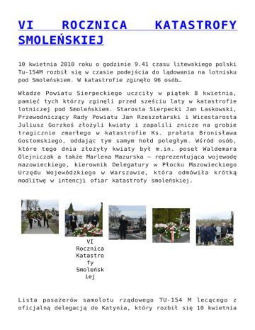 VI ROCZNICA SMOLEŃSKIEJ KATASTROFY 10 kwietnia 2010 roku o godzinie 9.41 czasu litewskiego polski Tu-154M rozbił się w czasie podejścia do lądowania na lotnisku pod Smoleńskiem. W katastrofie zginęło 96 osób… Władze Powiatu Sierpeckiego uczciły w piątek 8 kwietnia, pamięć tych którzy zginęli przed sześciu laty w katastrofie lotniczej pod Smoleńskiem. Starosta Sierpecki Jan Laskowski, Przewodniczący Rady Powiatu Jan Rzeszotarski i Wicestarosta Juliusz Gorzkoś złożyli kwiaty i zapalili znicze na grobie tragicznie zmarłego w katastrofie Ks. prałata Bronisława Gostomskiego, oddając tym samym hołd poległym. Wśród osób, które tego dnia złożyły kwiaty był m.in. poseł Waldemara Olejniczak a także Marlena Mazurska – reprezentująca wojewodę mazowieckiego, kierownik Delegatury w Płocku Mazowieckiego Urzędu Wojewódzkiego w Warszawie, która odmówiła krótką modlitwę w intencji ofiar katastrofy smoleńskiej. VI Rocznica Katastro fy Smoleńsk iej Lista pasażerów samolotu rządowego TU-154 M lecącego z oficjalną delegacją do Katynia, który rozbił się 10 kwietnia 2010 roku podchodząc do lądowania pod Smoleńskiem: Lech Kaczyński, Prezydent RP, Maria Kaczyńska, małżonka Prezydenta RP, Ryszard Kaczorowski, Krzysztof Putra, Krystyna Bochenek,Jerzy Szmajdziński, Władysław Stasiak, Aleksander Szczygło, Paweł Wypych, Stanisław Jerzy Komorowski, Tomasz Merta, Maciej Płażyński, Mariusz Kazana, Gen. Franciszek Gągor, Mariusz Handzlik, Andrzej Kremer, Andrzej Przewoźnik, Piotr Nurowski, Janusz Kochanowski, Sławomir Skrzypek, Janusz Kurtyka, Janusz Krupski, Grzegorz Dolniak, Leszek Deptuła, Grażyna Gęsicka, Przemysław Gosiewski, Zbigniew Wassermann, Sebastian Karpiniuk, Izabela Jaruga-Nowacka, Aleksandra Natalli-Świat, Arkadiusz Rybicki, Jolanta Szymanek-Deresz, Wiesław Woda, Edward Wojtas, Janina Fetlińska, Stanisław Zając, Biskup polowy gen. dyw. Tadeusz Płoski, Abp Miron Chodakowski, Ks. płk Adam Pilch, Ks. ppłk Jan Osiński, Ks. prałat Bronisław Gostomski, Ks. Józef Joniec, Ks. infułat Zdzisław Król, Ks. Andrzej Kwaśnik, Ks. Roman Indrzejczyk, Gen. broni Bronisław Kwiatkowski, Gen. Andrzej Błasik, Gen. Tadeusz Buk, Gen. Włodzimierz Potasiński, Wiceadmirał Andrzej Karweta, Gen. Kazimierz Gilarski, Tadeusz Lutoborski, Stefan Melak, Stanisław Mikke, Bronisława Orawiec-Loeffler, Katarzyna Piskorska, Andrzej Sariusz-Skąpski, Wojciech Seweryn, Leszek Solski, syn kpt. Kazimierza Solskiego, Teresa WalewskaPrzyjałkowska, Gabriela Zych, Ewa Bąkowska, Anna Maria Borowska, Bartosz Borowski, Edward Duchnowski, Bożena Mamontowicz-Łojek, Aleksander Fedorowicz, Joanna AgackaIndecka, Czesław Cywiński, Ppłk. Zbigniew Dębski, ps. „ZbychPrawdzic”, Katarzyna Doraczyńska, Dariusz Jankowski, Gen. bryg. Stanisław Komornicki, Wojciech Lubiński, Barbara Mamińska, Janina Natusiewicz-Mirer, Ks. Ryszard Rumianek, Izabela Tomaszewska, Anna Walentynowicz, Janusz Zakrzeński, Podpułkownik Jarosław Florczak, Starszy chorąży Artur Francuz, Porucznik Paweł Janeczek, Chorąży Paweł Krajewski, Podporucznik Piotr Nosek, Chorąży Jacek Surówka, Chorąży Marek Uleryk, Kapitan Dariusz Michałowski, Młodszy chorąży Agnieszka Pogródka-Węcławek, Kapitan Arkadiusz Protasiuk, Major Robert Grzywna, Por. Artur Ziętek, Chorąży Andrzej Michalak, Barbara Maciejczyk, Natalia Januszko, Justyna Moniuszko.