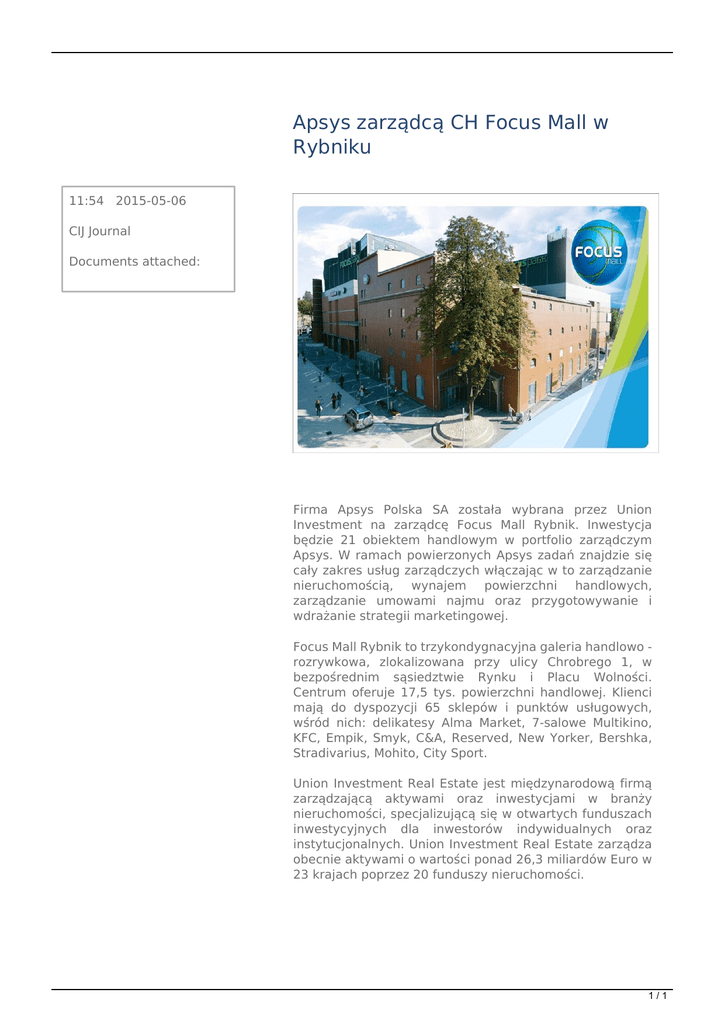 Apsys zarządcą CH Focus Mall w Rybniku 11:54 2015-05-06 CIJ Journal Documents attached: Firma Apsys Polska SA została wybrana przez Union Investment na zarządcę Focus Mall Rybnik. Inwestycja będzie 21 obiektem handlowym w portfolio zarządczym Apsys. W ramach powierzonych Apsys zadań znajdzie się cały zakres usług zarządczych włączając w to zarządzanie nieruchomością, wynajem powierzchni handlowych, zarządzanie umowami najmu oraz przygotowywanie i wdrażanie strategii marketingowej. Focus Mall Rybnik to trzykondygnacyjna galeria handlowo rozrywkowa, zlokalizowana przy ulicy Chrobrego 1, w bezpośrednim sąsiedztwie Rynku i Placu Wolności. Centrum oferuje 17,5 tys. powierzchni handlowej. Klienci mają do dyspozycji 65 sklepów i punktów usługowych, wśród nich: delikatesy Alma Market, 7-salowe Multikino, KFC, Empik, Smyk, C&A, Reserved, New Yorker, Bershka, Stradivarius, Mohito, City Sport. Union Investment Real Estate jest międzynarodową firmą zarządzającą aktywami oraz inwestycjami w branży nieruchomości, specjalizującą się w otwartych funduszach inwestycyjnych dla inwestorów indywidualnych oraz instytucjonalnych. Union Investment Real Estate zarządza obecnie aktywami o wartości ponad 26,3 miliardów Euro w 23 krajach poprzez 20 funduszy nieruchomości. 1/1