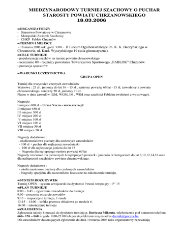 MIEDZYNARODOWY TURNIEJ SZACHOWY O PUCHAR STAROSTY POWIATU CHRZANOWSKIEGO 18.03.2006 • ORGANIZATORZY - Starostwo Powiatowe w Chrzanowie - Małopolski Związek Szachowy - CHKP Fablok Chrzanów • TERMIN I MIEJSCE - 18 marca 2006 rok, godz. 9.00 – II Liceum Ogólnokształcące im. K. K. Baczyńskiego w Chrzanowie, ul. Kard. Wyszyńskiego 19 (sala gimnastyczna). • CELE TURNIEJU - popularyzacja szachów na terenie powiatu chrzanowskiego - uczczenie 80 - rocznicy powstania Towarzystwa Sportowego „FABLOK” Chrzanów. - promocja sponsorów • WARUNKI UCZESTNICTWA GRUPA OPEN Turniej dla wszystkich chętnych zawodników Wpisowe : 25 zł , juniorzy do lat 16 – 15 zł , seniorzy powyŜej 60 lat - 15 zł, zawodnicy z powiatu chrzanowskiego: seniorzy 20 zł, juniorzy 10 zł. Płatne w dniu zawodów (GM, WGM, IM , WIM oraz szachiści Fabloku zwolnieni z wpisowego). Nagrody: I miejsce 600 zł – Firma Vecro - www.vecro.pl II miejsce 450 zł III miejsce 300 zł IV miejsce 200 zł V miejsce 100 zł VI miejsce 100 zł VII miejsce 50 zł VIII miejsce 50 zł Nagrody dodatkowe : - okolicznościowe puchary dla czołowych zawodników - 100 zł + puchar dla najlepszej zawodniczki - 100 zł dla najlepszego juniora do lat 18 - Nagroda dla najlepszego seniora powyŜej 60 lat Nagrody rzeczowe dla pierwszych 6 najlepszych juniorek i juniorów w kategoriach do lat 8,10,12,14,16 oraz dla najlepszych szachistów powiatu chrzanowskiego. Nagrody dodatkowe : - okolicznościowe puchary dla czołowych zawodników - Nagrody specjalne dla uczestników losowane na zakończeniu turnieju. • SYSTEM ROZGRYWEK Turniej OPEN – system szwajcarski na dystansie 9 rund, tempo gry – P’ 15 • PLAN TURNIEJU 8:00 – 8:45 – zgłoszenia zawodników do turnieju 9.00 - uroczyste otwarcie zawodów 9:15 – rozpoczęcie turnieju, 1 runda 13:15 – 14:00 – krótka przerwa obiadowa po rundzie 6. 16:00 – zakończenie turnieju • ZGŁOSZENIA Zgłoszenia naleŜy kierować do dyrektora turnieju p. Dariusza Mikruta, telefonicznie pod numerem telefonu 668– 176 – 060 w godz. 9.00-22.00 lub pocztą elektroniczną na adres [email protected] Dla zawodników dokonujących zgłoszenia do dnia 10 marca 2006 roku organizatorzy zapewniają sprzęt do gry. W miejscu zawodów zorganizowany zostaje całodzienny bufet. Strona turnieju – www.chessincracow.com • UWAGI MoŜna otrzymać tylko jedną nagrodę. Juniorzy mogą otrzymać dwie nagrody, jedna w kategorii seniorów i rzeczowa w kategorii juniorów. Szczegółowe informacje i wyjaśnienia dotyczące przebiegu turnieju zostaną podane przed rozpoczęciem zawodów. Ostateczna interpretacja komunikatu naleŜy do organizatora.