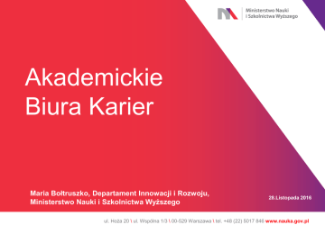 Akademickie Biura Karier Maria Bołtruszko, Departament Innowacji i Rozwoju, Ministerstwo Nauki i Szkolnictwa Wyższego 28.Listopada 2016 ul. Hoża 20 \ ul. Wspólna 1/3 \ 00-529 Warszawa \ tel. +48 (22) 5017 846 www.nauka.gov.pl 1. AKADEMICKIE BIURA KARIER (ABK) w polskich szkołach wyższych Aktualnie na 428 polskich uczelniach funkcjonuje 340 akademickich biur karier. Prowadzenie ABK jest standardem w przypadku uczelni publicznych, ale wyjątkami - jest 7 uczelni artystycznych, posiadających niewielką liczbę studentów. (Raport - Działalność akademickich biur karier w roku akademickim 2014/2015) www.nauka.gov.pl 2. Krótka historia rozwoju biur karier - w latach 2001-2005 powstało, 69 (na 200 ankietowanych ABK) w tym 20 w roku 2003 r. Ten przyrost wynikał przede wszystkim z realizacji w latach 20022005 rządowego Programu Aktywizacji Zawodowej Absolwentów „Pierwsza Praca”, w ramach którego dofinansowano 73 projekty uwzględniające utworzenie nowych ABK. - w ciągu kolejnych pięciu lat tj. 2005-2010 powstało 55 ABK. - w latach 2010-2016 najwięcej biur karier powstało w 2012 r. (16). spośród ankietowanych ABK 3 powstały w 2015 r. www.nauka.gov.pl 3. Struktury organizacyjne ABK Biura karier są wydzielonymi jednostkami organizacyjnymi w 84% uczelni. W pozostałych przypadkach dominuje umiejscowienie biura karier w jednostkach zajmujących się promocją uczelni, kształceniem i sprawami studenckimi lub są w dziekanatach wydziałów. Szczególnym przypadkiem organizacyjnym jest Biuro Karier Politechniki Koszalińskiej działające w ramach Stowarzyszenia Studentów i Absolwentów Politechniki Koszalińskiej "Millennium". www.nauka.gov.pl 4. Zadania realizowane przez biura karier Pięć najczęściej realizowanych przez biura karier zadań: I. Informowanie o ofertach pracy, praktyk i staży oraz wolontariatu: 98,5% II. Poradnictwo zawodowe: 88% : III. Prowadzenie badań losów absolwentów: 84,5% IV. Warsztaty lub szkolenia z zakresu metod poszukiwania pracy i przygotowania do procesu rekrutacji: 83,5% V. Warsztaty i szkolenia z umiejętności miękkich (tzw. umiejętności „transferowalnych”): 77% www.nauka.gov.pl 5. Poradnictwo zawodowe w ABK (1) Poradnictwo zawodowe jest kluczowym obszarem działalności biur karier. : Usługi z tego zakresu świadczy 88% ABK i odsetek jest identyczny w przypadku uczelni publicznych i niepublicznych. ABK częściej podejmują się poradnictwa indywidualnego (82%) niż poradnictwa grupowego (65%). www.nauka.gov.pl 5. Poradnictwo zawodowe w ABK (2) Wśród technik wykorzystywanych w indywidualnym poradnictwie zawodowym dominują konsultacje dokumentów aplikacyjnych (75%), wywiad (73%) oraz symulacja rozmowy kwalifikacyjnej (61%). Prawie połowa biur: karier stosuje testy kompetencyjne (49%), choć popularność tej techniki jest znacznie większa w przypadku uczelni publicznych (56,5%), niż uczelni niepublicznych (40,2%). Coaching i mentoring są praktykowane odpowiednio przez 40% i 13,5% ABK. Kompleksowość oferty w zakresie indywidualnego poradnictwa zawodowego, rozumiana jako różnorodność wykorzystywanych technik, wzrasta wraz z liczbą studentów na danej uczelni. www.nauka.gov.pl 5. Poradnictwo zawodowe w ABK (3) (przykład) Projekt „GPS Kariery - Twój Indywidualny Plan Działań” Projekt GPS Kariery, realizowany przez Biuro Karier i Promocji Zawodowej Uniwersytetu Ekonomicznego we Wrocławiu, wypracował narzędzie, dzięki któremu studenci mogą stworzyć : własne portfolio zawodowe. Jest to cykl trzech spotkań, podczas których student może zdiagnozować własny potencjał, dzięki szerokiej gamie testów predyspozycji zawodowych. Projekt nastawiony jest także na to, aby rozwijać u studentów umiejętność zarządzania sobą w czasie i planowania działań. Doradcy wykorzystują w projekcie takie narzędzia jak The Coaching Maps, test PerformanSe Dial Echo, czy test MultiSelect. www.nauka.gov.pl 5. Poradnictwo zawodowe w ABK (4) W przypadku grupowego poradnictwa zawodowego, najpopularniejszymi technikami są symulacja rozmowy kwalifikacyjnej oraz konsultacje dokumentów : aplikacyjnych (po 51,5%). Uczelnie publiczne częściej niż niepubliczne podejmują się grupowych konsultacji dokumentów aplikacyjnych (odpowiednio 59,3% i 42,4%) i stosowania testów kompetencyjnych (41,7% i 25%). Odsetek ABK stosujących poszczególne techniki na ogół wzrasta wraz z liczbą studentów studiujących na danej uczelni. www.nauka.gov.pl 5. Poradnictwo zawodowe w ABK (5) 45% ABK oferuje ponadto poradnictwo zawodowe on-line. : Im większa liczba studentów na danej uczelni, tym bardziej popularna jest ta metoda www.nauka.gov.pl 6. Inne rodzaje poradnictwa (1) Aż 76,5% ABK oferuje usługi z zakresu poradnictwa edukacyjnego, rozumianego jako doradztwo dla studentów lub kandydatów na studia w zakresie możliwości : dalszego kształcenia – wyboru studiów kolejnego stopnia, czy specjalności – w kontekście wymagań rynku pracy. Aktywniejsze w tym zakresie są uczelnie niepubliczne, z których 83,7% deklaruje uwzględnienie tego aspektu w swojej ofercie. www.nauka.gov.pl 6. Inne rodzaje poradnictwa (2) ABK nieco rzadziej podejmują się, samodzielnie lub zapraszając specjalistów z zewnątrz, konsultacji lub poradnictwa w zakresie przedsiębiorczości : i samozatrudnienia. 66% ABK prowadzi taką działalność w odniesieniu do zakładania i prowadzenia działalności gospodarczej, natomiast 56,5% w zakresie odkrywania i pobudzania potencjału przedsiębiorczego i/lub kreowania pomysłu na biznes. www.nauka.gov.pl 6. Inne rodzaje poradnictwa (3) 14% ABK wskazuje w odpowiedziach, że realizuje jeszcze inne rodzaje poradnictwa m.in. : o poradnictwo psychologiczne, w tym poradnictwo psychologiczne: w kontekście zawodowym; o poradnictwo w zakresie podjęcia działalności wolontariackiej; o poradnictwo personalne; o poradnictwo w zakresie rynku sztuki; o poradnictwo dla migrantów; o poradnictwo w języku angielskim