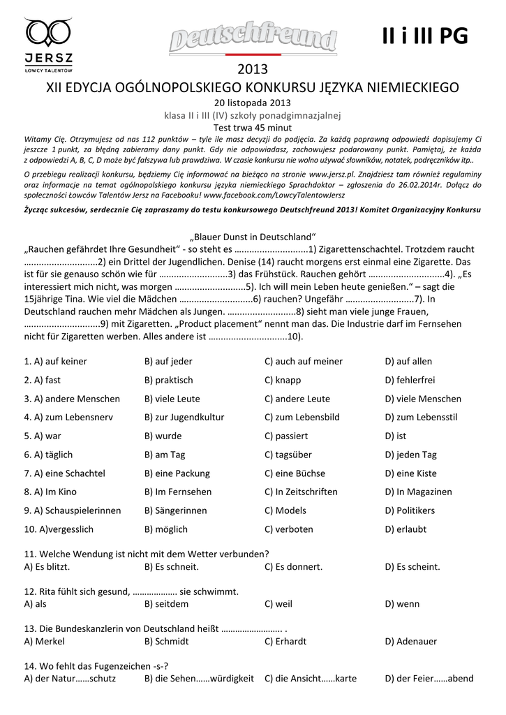 II i III PG 2013 XII EDYCJA OGÓLNOPOLSKIEGO KONKURSU JĘZYKA NIEMIECKIEGO 20 listopada 2013 klasa II i III (IV) szkoły ponadgimnazjalnej Test trwa 45 minut Witamy Cię. Otrzymujesz od nas 112 punktów – tyle ile masz decyzji do podjęcia. Za każdą poprawną odpowiedź dopisujemy Ci jeszcze 1 punkt, za błędną zabieramy dany punkt. Gdy nie odpowiadasz, zachowujesz podarowany punkt. Pamiętaj, że każda z odpowiedzi A, B, C, D może być fałszywa lub prawdziwa. W czasie konkursu nie wolno używać słowników, notatek, podręczników itp.. O przebiegu realizacji konkursu, będziemy Cię informować na bieżąco na stronie www.jersz.pl. Znajdziesz tam również regulaminy oraz informacje na temat ogólnopolskiego konkursu języka niemieckiego Sprachdoktor – zgłoszenia do 26.02.2014r. Dołącz do społeczności Łowców Talentów Jersz na Facebooku! www.facebook.com/LowcyTalentowJersz Życząc sukcesów, serdecznie Cię zapraszamy do testu konkursowego Deutschfreund 2013! Komitet Organizacyjny Konkursu „Blauer Dunst in Deutschland“ „Rauchen gefährdet Ihre Gesundheit“ - so steht es …..........................1) Zigarettenschachtel. Trotzdem raucht …..........................2) ein Drittel der Jugendlichen. Denise (14) raucht morgens erst einmal eine Zigarette. Das ist für sie genauso schön wie für …........................3) das Frühstück. Rauchen gehört …...........................4). „Es interessiert mich nicht, was morgen ….........................5). Ich will mein Leben heute genießen.“ – sagt die 15jährige Tina. Wie viel die Mädchen …..........................6) rauchen? Ungefähr …........................7). In Deutschland rauchen mehr Mädchen als Jungen. …........................8) sieht man viele junge Frauen, …...........................9) mit Zigaretten. „Product placement“ nennt man das. Die Industrie darf im Fernsehen nicht für Zigaretten werben. Alles andere ist …............................10). 1. A) auf keiner B) auf jeder C) auch auf meiner D) auf allen 2. A) fast B) praktisch C) knapp D) fehlerfrei 3. A) andere Menschen B) viele Leute C) andere Leute D) viele Menschen 4. A) zum Lebensnerv B) zur Jugendkultur C) zum Lebensbild D) zum Lebensstil 5. A) war B) wurde C) passiert D) ist 6. A) täglich B) am Tag C) tagsüber D) jeden Tag 7. A) eine Schachtel B) eine Packung C) eine Büchse D) eine Kiste 8. A) Im Kino B) Im Fernsehen C) In Zeitschriften D) In Magazinen 9. A) Schauspielerinnen B) Sängerinnen C) Models D) Politikers 10. A)vergesslich B) möglich C) verboten D) erlaubt 11. Welche Wendung ist nicht mit dem Wetter verbunden? A) Es blitzt. B) Es schneit. C) Es donnert. D) Es scheint. 12. Rita fühlt sich gesund, ………………. sie schwimmt. A) als B) seitdem D) wenn C) weil 13. Die Bundeskanzlerin von Deutschland heißt …………………….. . A) Merkel B) Schmidt C) Erhardt D) Adenauer 14. Wo fehlt das Fugenzeichen -s-? A) der Natur……schutz B) die Sehen……würdigkeit D) der Feier……abend C) die Ansicht……karte 15. Wo hat sich ein orthografischer Fehler versteckt? A) Dienstagabend B) dienstagsabends C) morgen abend D) heute mittag 16. Den Nationalfeiertag feiern die Deutschen …………………………… . A) am 1. Juli B) am 3. Oktober C) am 9. November D) am 17. Juni 17. …………… Schwarzwald und ……………… Bodensee kannst du dich gut erholen. A) In, an der B) Im, an der C) In, am D) Im, am 18. Was ist kein Tisch? A) Esstisch C) Computertisch D) Nachttisch C) wirst D) willst B) Nachtisch 19. Wann ……………… du gestern eingeschlafen? A) bist B) hast 20. Das jung………. Ehepaar mietet eine klein………… Wohnung mit einer separat…………….. Küche. A) -e, -e, -e B) -es, -e, -es C) -en, -en, -en D) -e, -e, -en 21. Die Lektüre …………….. bis Freitag ……………… . A) muss ………….. gelesen werden C) soll …………….. gelesen werden B) muss ………….. lesen werden D) soll …………….. gelesen worden 22. Die Rektion: Wo passt „von“? A) hören B) träumen C) erzählen D) halten 23. Ergänze richtig die Wendung: „Das geht mir auf ………………. .“ A) den Kopf B) den Charakter C) die Füße D) die Nerven 24. Wir können nicht mit der ……………………….. zahlen. A) Eintrittskarte B) Visitenkarte C) Fahrkarte D) Kreditkarte 25. Es wäre toll, wenn du mir helfen …………………… . A) wolltest B) würdest C) möchtest D) könntest 26. Der Bus fährt ……………….. an dieser Haltestelle ……….. halten. A) weder, ------------B) statt, zu C) ohne, zu D) um, ------------ 27. Sprich bitte langsamer, …………………………………… . A) weil ich dich nicht verstehe C) als ich dich verstehen kann B) damit ich dich verstehe D) sonst bist du nicht zu verstehen 28. Assoziationen zum Thema „Umweltschutz“: A) Greenpeace B) Mülltrennung C) grüner Punkt PATRONI I PARTNERZY © COPYRIGHT BY ŁOWCY TALENTÓW – JERSZ. WILCZYN 2013 D) Recycling