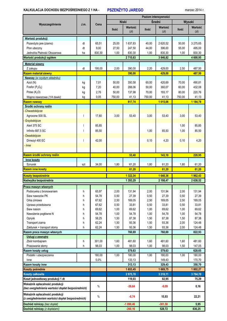 KALKULACJA DOCHODU BEZPOŚREDNIEGO Z 1 HA - PSZENŻYTO JAREGO marzec 2014 r. Poziom intensywności Wyszczególnienie J.m. Niski Cena Średni Wysoki Ilość Wartość (zł) Ilość Wartość (zł) Ilość Wartość (zł) Wartość produkcji Pszenżyto jare (ziarno) dt 65,51 25,00 1 637,83 40,00 2 620,52 50,00 3 275,65 Plon uboczny Jednolita Płatność Obszarowa dt ha 9,00 830,30 27,50 1,00 247,50 830,30 44,00 1,00 396,00 830,30 55,00 1,00 495,00 830,30 Wartość produkcji ogółem Materiał siewny Z zakupu Razem materiał siewny Nawozy (w czystym składniku) Azot (N) Fosfor (P2O5) Potas (K2O) Wapno nawozowe (1/4 dawki) Razem nawozy Środki ochrony roślin - Chwastobójcze Agroxone 500 SL 2 715,63 dt 195,00 2,00 390,00 3 846,82 2,20 390,00 429,00 4 600,95 2,50 429,00 487,50 487,50 kg 7,01 50,00 350,58 60,00 420,69 70,00 490,81 kg 7,20 40,00 288,06 50,00 360,07 60,00 432,08 kg 2,76 50,00 137,98 70,00 193,17 80,00 220,76 kg 0,05 750,00 41,13 750,00 41,13 750,00 41,13 817,74 3,00 53,40 1 015,06 l 17,80 3,00 Alert 375 SC l 85,85 Infinito 687,5 SC l 85,50 1,00 l 42,00 0,10 53,40 1 184,78 3,00 53,40 1,00 85,85 85,50 1,00 85,50 4,20 0,10 4,20 - Grzybobójcze - Owadobójcze Dimezyl 400 EC - Inne Razem środki ochrony roślin Inne koszty Sznurek Razem inne koszty 53,40 szt 34,00 1,80 61,20 143,10 1,80 61,20 228,95 1,80 61,20 61,20 61,20 61,20 Koszty bezpośrednie 1 322,34 1 648,36 1 962,43 Nadwyżka bezpośrednia 1 393,29 2 198,47 2 638,52 Praca maszyn własnych Podorywka z bronowaniem Siew nawozów PK Orka zimowa Uprawa przedsiewna Siew nasion Nawożenie pogłówne N Oprysk Transport ziarna Załdunek + transport słomy Razem praca maszyn własnych Usługi z zewnątrz Zbiór kombajnem Prasowanie słomy h h h h h h h h h 65,97 54,78 67,62 67,62 69,62 54,78 58,25 62,24 62,24 2,00 0,50 2,50 0,50 1,00 1,00 1,50 1,50 1,50 131,94 27,39 169,05 33,81 69,62 54,78 87,38 93,36 93,36 2,00 0,50 2,50 0,50 1,00 1,00 1,50 1,50 1,50 760,69 h h Razem koszty usług Podatki i ubezpieczenia Inne 131,94 27,39 169,05 33,81 69,62 54,78 87,38 93,36 93,36 2,00 0,50 2,50 0,50 1,00 1,00 1,50 2,00 2,00 760,69 131,94 27,39 169,05 33,81 69,62 54,78 87,38 124,48 124,48 822,93 301,00 98,03 1,60 1,00 481,60 98,03 1,60 1,00 481,60 98,03 1,60 1,50 481,60 147,05 180,00 5,0% 1,00 579,63 180,00 133,13 1,00 579,63 180,00 149,43 1,00 628,65 180,00 170,70 Razem koszty inne 313,13 329,43 350,70 Koszty pośrednie 1 653,45 1 669,75 1 802,27 Koszty całkowite 2 975,78 3 318,11 3 764,70 119,03 82,95 75,29 Koszt jednostkowy produkcji 1 dt Wskaźnik opłacalność produkcji (bez uwzglednienia wartości dopłat bezpośrednich) % -36,64 -9,09 0,16 Wskaźnik opłacalność produkcji (z uwzglednieniem wartości dopłat bezpośrednich) % -8,74 15,93 22,21 -1 090,46 -301,58 5,95 -260,16 528,72 836,25 Dochód rolniczy (bez dopłat) Dochód rolniczy (z dopłatami)