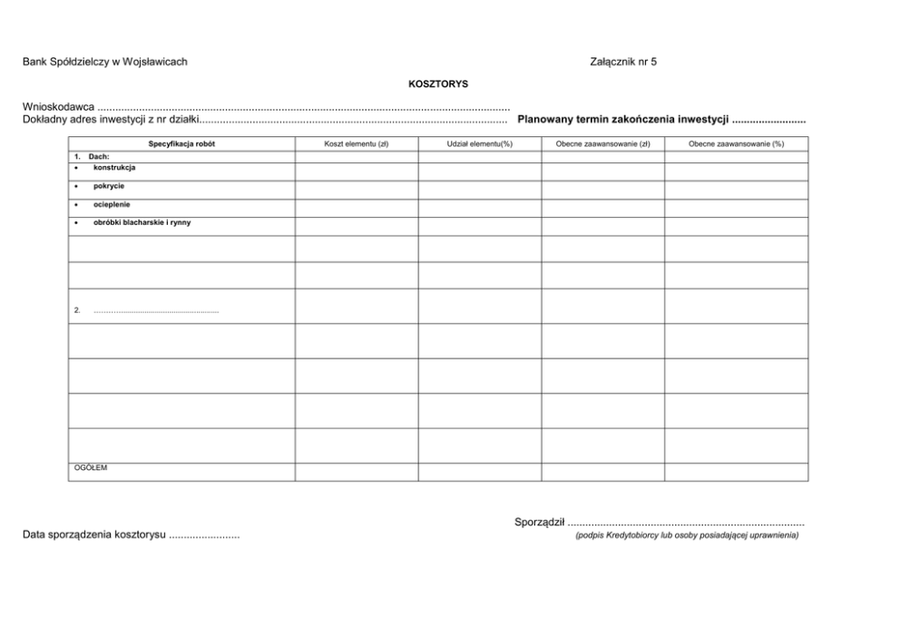 Bank Spółdzielczy w Wojsławicach Załącznik nr 5 KOSZTORYS Wnioskodawca ........................................................................................................................................... Dokładny adres inwestycji z nr działki........................................................................................................ Planowany termin zakończenia inwestycji ......................... Specyfikacja robót 1. Koszt elementu (zł) Udział elementu(%) Obecne zaawansowanie (zł) Obecne zaawansowanie (%) Dach: konstrukcja pokrycie ocieplenie obróbki blacharskie i rynny 2. ………….............................................. OGÓŁEM Sporządził ................................................................................ Data sporządzenia kosztorysu ........................ (podpis Kredytobiorcy lub osoby posiadającej uprawnienia)