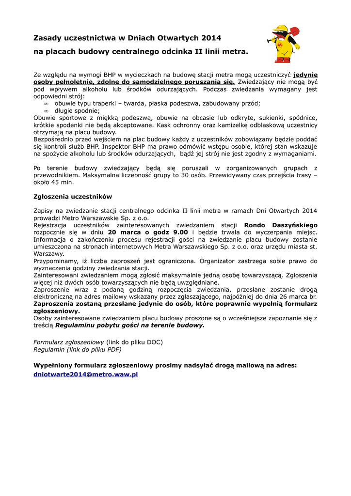 Zasady uczestnictwa w Dniach Otwartych 2014 na placach budowy centralnego odcinka II linii metra. Ze względu na wymogi BHP w wycieczkach na budowę stacji metra mogą uczestniczyć jedynie osoby pełnoletnie, zdolne do samodzielnego poruszania się. Zwiedzający nie mogą być pod wpływem alkoholu lub środków odurzających. Podczas zwiedzania wymagany jest odpowiedni strój: • obuwie typu traperki – twarda, płaska podeszwa, zabudowany przód; • długie spodnie; Obuwie sportowe z miękką podeszwą, obuwie na obcasie lub odkryte, sukienki, spódnice, krótkie spodenki nie będą akceptowane. Kask ochronny oraz kamizelkę odblaskową uczestnicy otrzymają na placu budowy. Bezpośrednio przed wejściem na plac budowy każdy z uczestników zobowiązany będzie poddać się kontroli służb BHP. Inspektor BHP ma prawo odmówić wstępu osobie, której stan wskazuje na spożycie alkoholu lub środków odurzających, bądź jej strój nie jest zgodny z wymaganiami. Po terenie budowy zwiedzający będą się poruszali w zorganizowanych grupach z przewodnikiem. Maksymalna liczebność grupy to 30 osób. Przewidywany czas przejścia trasy – około 45 min. Zgłoszenia uczestników Zapisy na zwiedzanie stacji centralnego odcinka II linii metra w ramach Dni Otwartych 2014 prowadzi Metro Warszawskie Sp. z o.o. Rejestracja uczestników zainteresowanych zwiedzaniem stacji Rondo Daszyńskiego rozpocznie się w dniu 20 marca o godz 9.00 i będzie trwała do wyczerpania miejsc. Informacja o zakończeniu procesu rejestracji gości na zwiedzanie placu budowy zostanie umieszczona na stronach internetowych Metra Warszawskiego Sp. z o.o. oraz urzędu miasta st. Warszawy. Przypominamy, iż liczba zaproszeń jest ograniczona. Organizator zastrzega sobie prawo do wyznaczenia godziny zwiedzania stacji. Zainteresowani zwiedzaniem mogą zgłosić maksymalnie jedną osobę towarzyszącą. Zgłoszenia więcej niż dwóch osób towarzyszących nie będą uwzględniane. Zaproszenie wraz z podaną godziną rozpoczęcia zwiedzania, przesłane zostanie drogą elektroniczną na adres mailowy wskazany przez zgłaszającego, najpóźniej do dnia 26 marca br. Zaproszenia zostaną przesłane jedynie do osób, które poprawnie wypełnią formularz zgłoszeniowy. Osoby zainteresowane zwiedzaniem placu budowy proszone są o wcześniejsze zapoznanie się z treścią Regulaminu pobytu gości na terenie budowy. Formularz zgłoszeniowy (link do pliku DOC) Regulamin (link do pliku PDF) Wypełniony formularz zgłoszeniowy prosimy nadsyłać drogą mailową na adres: [email protected]