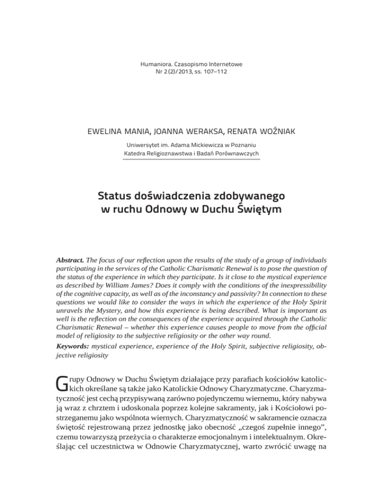 Humaniora. Czasopismo Internetowe Nr 2 (2)/2013, ss. 107–112 ewelina mania, joanna weraksa, renata woźniak Uniwersytet im. Adama Mickiewicza w Poznaniu Katedra Religioznawstwa i Badań Porównawczych Status doświadczenia zdobywanego w ruchu Odnowy w Duchu Świętym Abstract. The focus of our reflection upon the results of the study of a group of individuals participating in the services of the Catholic Charismatic Renewal is to pose the question of the status of the experience in which they participate. Is it close to the mystical experience as described by William James? Does it comply with the conditions of the inexpressibility of the cognitive capacity, as well as of the inconstancy and passivity? In connection to these questions we would like to consider the ways in which the experience of the Holy Spirit unravels the Mystery, and how this experience is being described. What is important as well is the reflection on the consequences of the experience acquired through the Catholic Charismatic Renewal – whether this experience causes people to move from the official model of religiosity to the subjective religiosity or the other way round. Keywords: mystical experience, experience of the Holy Spirit, subjective religiosity, objective religiosity G rupy Odnowy w Duchu Świętym działające przy parafiach kościołów katolickich określane są także jako Katolickie Odnowy Charyzmatyczne. Charyzmatyczność jest cechą przypisywaną zarówno pojedynczemu wiernemu, który nabywa ją wraz z chrztem i udoskonala poprzez kolejne sakramenty, jak i Kościołowi postrzeganemu jako wspólnota wiernych. Charyzmatyczność w sakramencie oznacza świętość rejestrowaną przez jednostkę jako obecność „czegoś zupełnie innego”, czemu towarzyszą przeżycia o charakterze emocjonalnym i intelektualnym. Określając cel uczestnictwa w Odnowie Charyzmatycznej, warto zwrócić uwagę na 108 e w e l i n a m a n i a, j o a n n a w e r a k s a, r e n a t a w o ź n i a k to, że chociaż Duch Święty jest już w danej osobie, może stać się w niej obecny w sposób nowy i decydujący. Religijność wcześniej budowana poprzez nadawanie znaczeń religijnych, zapośredniczonych przez rodziców, bliskich czy instytucje, teraz ma szansę zmienić się w indywidualne doświadczenie religijne, które stanie się punktem wyjścia samodzielnego budowania dojrzałego poczucia religijnego. Doświadczenie obecności i działania Ducha Świętego podczas nabożeństw Odnowy w Duchu Świętym ma charakter intensywnego przeżycia, przebudzenia i jest ukierunkowane na trwałą i radykalną przemianę postawy religijnej, stąd uzasadnione jest pytanie o jego status i konsekwencje dla rozwoju religijności. Poniższa analiza wyników przeprowadzonych badań ma przynieść refleksję na temat charakteru doświadczeń uczestników nabożeństw, którymi są w większości ludzie młodzi. To, co szczególnie interesujące, to relacje pomiędzy doświadczeniem religijnym a rozwojem osobowości, zwłaszcza w odniesieniu do czynników emocjonalnych i intelektualnych osób w wieku dojrzewania. Na ile intensywność doświadczenia religijnego jest zdeterminowana przez zmiany w strukturze układu nerwowego spowodowane okresem dojrzewania? Równie istotna jest odpowiedź na pytanie o możliwość modelowania doświadczenia religijnego przez wpływ charyzmatycznych kapłanów i prowadzących oraz innych członków grup Odnowy, a zatem o granice subiektywności przeżycia. W szerszym kontekście odpowiada to problemowi ujmowania (opisu, kategoryzacji) doświadczeń religijnych. W związku z tym czy możliwa jest systematyka doświadczenia religijnego? Czy o uznaniu kogoś za mistyka decyduje aspekt teologiczny, czas i tradycja? Do XX wieku przedmiotem analizy doświadczenia religijnego były relacje mistyków. Obecnie dzięki psychologii (zwłaszcza w odniesieniu do rozwoju osobowości, psychoanalitycznych źródeł lęku) oraz badaniom nad neuronalnym wyposażeniem człowieka i teorią umysłu analiza ta uzupełnia fenomenologiczny opis sacrum (Rudolf Otto, Gerardus van der Leeuw, Geo Widengren) i sposób jego doświadczenia (William James) o predyspozycje doświadczającego. Grupa badawcza składała się z losowo wybranych 60 osób – 43 kobiet i 17 mężczyzn w przedziale wiekowym 15–29 lat. W badaniach wykorzystano kwestionariusz ankiety zawierający 55 pytań o charakterze zamkniętym i otwartym, łączący elementy testu, skali postaw wobec religii, obiektów religijnych, przekonań i wymiarów religijności. Część pytań zamkniętych dotyczyła relacji z otoczeniem pozareligijnym zarówno sprzed, jak i po przystąpieniu do ruchu Odnowy w Duchu Świętym. Skala postaw pozwoliła na uzyskanie informacji o tym, w jaki sposób badani ustosunkowywali się do twierdzeń odnoszących się do wiedzy wchodzącej w skład doktryny, moralności, kultu, organizacji (pytania o częstotliwość praktyk grupowych, indywidualnych, charakter modlitwy, stosunek do religijności środowiska). Z kolei wskazanie spośród twierdzeń reprezentatywnych dla różnych etapów rozwoju religijności takich, które podzielają, pozwoliło uzyskać wiedzę o tym, na ile religijność badanych jest uwarunkowana wiedzą przekazywaną przez rodziców, Status doświadczenia zdobywanego w ruchu Odnowy w Duchu Świętym 109 organizacje, a na ile stanowi efekt refleksji na podstawie własnych doświadczeń. Zastosowano również pytania typu Q-sort, wykorzystywane powszechnie do badań nad pojęciem Ja1. W przypadku naszych badań odpowiedzi, czyli jednozdaniowe wypowiedzi, przyniosły wiedzę na temat wiązania pojęcia kryzysu i sposobu jego łagodzenia z treściami religijnymi, a także języka (metafory, antropomorfizacje), jakim opisywane są Osoby Trójcy Świętej. Uzyskane wyniki tworzą obraz religijności, czyli stosunku do organizacji oraz indywidualnych praktyk sprzed i po przystąpieniu do ruchu Odnowy w Duchu Świętym. Prze