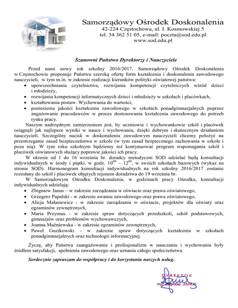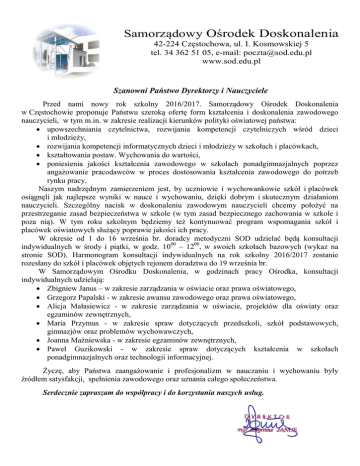 _______________________________________________________________________________________________ Samorządowy Ośrodek Doskonalenia 42-224 Częstochowa, ul. I. Kosmowskiej 5 tel. 34 362 51 05, e-mail: [email protected] www.sod.edu.pl Szanowni Państwo Dyrektorzy i Nauczyciele Przed nami nowy rok szkolny 2016/2017. Samorządowy Ośrodek Doskonalenia w Częstochowie proponuje Państwu szeroką ofertę form kształcenia i doskonalenia zawodowego nauczycieli, w tym m.in. w zakresie realizacji kierunków polityki oświatowej państwa: upowszechniania czytelnictwa, rozwijania kompetencji czytelniczych wśród dzieci i młodzieży, rozwijania kompetencji informatycznych dzieci i młodzieży w szkołach i placówkach, kształtowania postaw. Wychowania do wartości, poniesienia jakości kształcenia zawodowego w szkołach ponadgimnazjalnych poprzez angażowanie pracodawców w proces dostosowania kształcenia zawodowego do potrzeb rynku pracy. Naszym nadrzędnym zamierzeniem jest, by uczniowie i wychowankowie szkół i placówek osiągnęli jak najlepsze wyniki w nauce i wychowaniu, dzięki dobrym i skutecznym działaniom nauczycieli. Szczególny nacisk w doskonaleniu zawodowym nauczycieli chcemy położyć na przestrzeganie zasad bezpieczeństwa w szkole (w tym zasad bezpiecznego zachowania w szkole i poza nią). W tym roku szkolnym będziemy też kontynuować program wspomagania szkół i placówek oświatowych służący poprawie jakości ich pracy. W okresie od 1 do 16 września br. doradcy metodyczni SOD udzielać będą konsultacji indywidualnych w środy i piątki, w godz. 1000 – 1200, w swoich szkołach bazowych (wykaz na stronie SOD). Harmonogram konsultacji indywidualnych na rok szkolny 2016/2017 zostanie rozesłany do szkół i placówek objętych rejonem doradztwa do 19 września br. W Samorządowym Ośrodku Doskonalenia, w godzinach pracy Ośrodka, konsultacji indywidualnych udzielają: Zbigniew Janus – w zakresie zarządzania w oświacie oraz prawa oświatowego, Grzegorz Papalski - w zakresie awansu zawodowego oraz prawa oświatowego, Alicja Małasiewicz - w zakresie zarządzania w oświacie, projektów dla oświaty oraz egzaminów zewnętrznych, Maria Przymus - w zakresie spraw dotyczących przedszkoli, szkół podstawowych, gimnazjów oraz problemów wychowawczych, Joanna Maźniewska - w zakresie egzaminów zewnętrznych, Paweł Guzikowski - w zakresie spraw dotyczących kształcenia w szkołach ponadgimnazjalnych oraz technologii informacyjnej. Życzę, aby Państwa zaangażowanie i profesjonalizm w nauczaniu i wychowaniu były źródłem satysfakcji, spełnienia zawodowego oraz uznania całego społeczeństwa. Serdecznie zapraszam do współpracy i do korzystania naszych usług. Oferta edukacyjna SOD Formy płatne - rok szkolny 2016/2017 _______________________________________________________________________________________________ STUDIA PODYPLOMOWE organizowane przez Wyższą Szkołę Biznesu w Dąbrowie Górniczej we współpracy z Samorządowym Ośrodkiem Doskonalenia w Częstochowie Lp. Temat Zakres tematyczny Liczba semestrów Przewidywana wysokość opłaty za semestr [zł] podstawy organizacji i zarządzania, elementy prawa, wybrane zagadnienia z psychologii kierowania, finansowanie oświaty, zarządzanie zasobami ludzkimi, organizacyjno-prawne podstawy nadzoru pedagogicznego, kontrola zarządcza oraz praktyczne zarządzanie ryzykiem w placówce oświatowej 2 1250 Liczba semestrów Przewidywana wysokość opłaty za semestr [zł] 3 1500 3 1300 3 1500 3 1400 Liczba godzin Przewidywana wysokość opłaty [zł] 85 400 85 400 Adresat Zarządzanie placówkami zainteresowani nauczyciele oświatowymi 1. STUDIA PODYPLOMOWE organizowane przez Akademię im. Jana Długosza w Częstochowie we współpracy z Samorządowym Ośrodkiem Doskonalenia w Częstochowie Lp. Temat Adresat Zakres tematyczny 1. Gimnastyka korekcyjno -kompensacyjna zainteresowani nauczyciele postępowanie korekcyjno-kompensacyjne w wadach postawy, płaskostopia i skrzywieniach kręgosłupa; metody zapobiegania powstawaniu zaburzeń statyki ciała oraz wyrównywania niedoboru ruchu u dzieci i młodzieży pedagogika specjalna, problemy funkcjonowania osób z niepełnosprawnością intelektualną, podstawy prawne funkcjonowania osób niepełnosprawnych, psychoterapia z elementami terapii rodzin, diagnoza psychopedagogiczna, podstawy pracy z osobami z niepełnosprawnością intelektualną, korygowanie zaburzeń i wad u osób z niepełnosprawnością intelektualną diagnozowanie specyficznych trudności w uczeniu się, opracowywanie dostosowanych do potrzeb ucznia programów terapii; dobór właściwych do zaburzenia dziecka metod zajęć korekcyjno-kompensacyjnych; interpretacja opinii i orzeczeń wydawanych przez poradnie psychologiczno-pedagogiczne podstawy informatyki; systemy operacyjne i sieci komputerowe; podstawy programowania; wykorzystanie nowych technologii w edukacji; praca z urządzeniami mobilnymi 2. 3. 4. Oligofrenopedagogika zainteresowani nauczyciele Terapia pedagogiczna z muzykoterapią i choreoterapią zainteresowani nauczyciele Informatyka i technologia informacyjna w nauczaniu zainteresowani nauczyciele KURSY DOSKONALĄCE w porozumieniu z Wydziałem Edukacji UM Częstochowy Lp. Temat Adresat 1. Kształcenie kompetencji matematycznych na II etapie edukacyjnym nauczyciele matematyki szkół podstawowych nauczyciele matematyki gimnazjów 2. Kształcenie kompetencji matematycznych na III etapie edukacyjnym Zakres tematyczny wspomaganie rozwoju umysłowego dzieci; kształtowanie wiedzy i umiejętności matematycznych; metodyka nauczania matematyki w szkole podstawowej wspomaganie rozwoju umysłowego dzieci; kształtowanie wiedzy i umiejętności matematycznych; metodyka nauczania matematyki w gimnazjum Ceny kierunków studiów podyplomowych mogą ulec obniżeniu w przypadku większej liczby kandydatów lub dla absolwentów Akademii im. Jana Długosza w Częstochowie. 2 Oferta edukacyjna SOD Formy pł