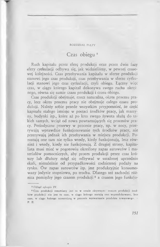 R O Z D Z IA Ł PIĄTY Czas obiegu 8 Ruch kapitału przez sferę produkcji oraz przez dw ie fazy sfery cyrkulacji odbyw a się, jak w idzieliśmy, w pew nej czaso wej kolejności. Czas przebyw ania kapitału w sferze produkcji stanow i jego czas produkcji, czas przebyw ania w sferze cyrku lacji stanow i jego czas cyrkulacji, czyli obiegu. Łączny więc czas, w ciągu którego kapitał dokonyw a swego ruchu okręż nego, rów na się sumie czasu produkcji i czasu obiegu. Czas produkcji obejmuje, rzecz naturalna, okres procesu p ra cy, lecz okres procesu pracy nie obejm uje całego czasu pro dukcji. N ależy sobie przede wszystkim przypomnieć, że część kapitału stałego istnieje w postaci środków pracy, jak maszy ny, budynki itp., które aż po kres swego żyw ota służą d o ta kich samych, wciąż o d nowa pow tarzających się procesów p ra cy. Periodyczne przerw y w procesie pracy, np. w nocy, prze ryw ają w praw dzie funkcjonow anie tych środków pracy, nie przeryw ają jednak ich przebyw ania w miejscu produkcji. Po zostają one tam nie tylko w tedy, kiedy funkcjonują, lecz rów nież i w tedy, kiedy nie funkcjonują. Z drugiej strony, k apita lista musi mieć w pogotow iu określony zapas surowców i m a teriałów pomocniczych, aby proces produkcji przez czas kró tszy lub dłuższy mógł się odbyw ać w ustalonej uprzednio skali, niezależnie od przypadkowości codziennej podaży na rynku. Ó w zapas surowców itp. jest produkcyjnie konsumo w any jedynie stopniowo, po trochu. D latego też zachodzi róż nica pom iędzy jego czasem produkcji 9 a czasem jego funkcjo8 O d tą d ręk o p is IV . 9 C zas p ro d u k c ji ro zu m ian y je s t tu w se n sie a k ty w n y m : czasem p ro d u k c ji ś ro d k ó w p r o d u k c ji n ie je s t tu czas, w ciąg u k tó re g o z o s ta ją o n e w y p ro d u k o w a n e , lecz c zas, w c ią g u k tó re g o u c z estn ic z ą w p ro ce sie w y tw a rz a n ia p ro d u k tu to w a ro w e g o . - F. E. 151 D zia ł I. M e ta m o r fo z y k a p ita łu i ich ruch o k rężn y naw ania. A zatem czas produkcji środków produkcji obejm uje w ogóle: 1. czas, w którym funkcjonują one jako środki pro dukcji, a więc służą w procesie p ro d u k cji; 2. przerwy, podczas których ustaje proces produkcji, a w ięc rów nież funkcjonow anie włączonych doń środków produkcji; 3. czas, w którym środki te znajdują się w praw dzie w pogotow iu jako w arunki procesu, a zatem reprezentują już kapitał produkcyjny, a le nie weszły jeszcze d o procesu produkcji. Różnica, którą rozpatryw aliśm y dotychczas, stanowi w każ dym w ypadku różnicę pom iędzy czasem przebyw ania kapitału produkcyjnego w sferze produkcji a czasem jego przebyw ania w procesie produkcji. Jednakże sam proces produkcji może wymagać przerw w procesie pracy, a przeto również i w cza sie pracy, przerw , podczas których przedm iot pracy poddany zostaje działaniu procesów fizycznych bez dalszego zastoso w ania pracy ludzkiej. W tym w ypadku proces produkcji, a więc i funkcjonow anie środków produkcji trw a dalej, mimo że w procesie pracy, a zatem i w funkcjonow aniu środków pro dukcji jako środków pracy nastąpiła przerw a. D otyczy to np. zboża, k tó re zasiano, w ina, które ferm entuje w piwnicy, m a teriału pracy w w ielu m anufakturach, jak np. w garbarniach, w których m ateriał p o ddaje się działaniu procesów chemicz nych. Czas produkcji jest tu dłuższy niż czas pracy. Różnicę pom iędzy nimi stanow i nadw yżka czasu produkcji ponad czas pracy. N adw yżka ta polega zaw sze na tym, że k ap itał pro d u k cyjny przebywa w sferze produkcji w postaci utajonej, nie funkcjonując w samym procesie produkcji, albo też że funkcjo nuje w procesie produkcji, lecz nie znajduje się w procesie pracy. O w a część utajonego kapitału produkcyjnego, k tó ra znajdu je się tylko w pogotow iu jako w arunek procesu produkcji, np. baw ełna, węgiel itp. w przędzalni, nie działa ani jako czynnik tw orzenia produktu, ani też jako czynnik tw orzenia wartości. Jest kapitałem leżącym bezczynnie, chociaż bezczynność ta sta nowi w arunek nieprzerw anego toku procesu produkcji. Budyn ki, aparaty itp., potrzebne jako składnice zapasu produkcyjne go (kapitału utajonego), są w arunkam i procesu produkcji i dlatego stanow ią części składow e w yłożonego kapitału pro 152 R o z d z ia ł 5. C za s o b ie g u dukcyjnego. Spełniają swą funkcję chronienia elem entów pro dukcji w stadium wstępnym. Jeżeli potrzebne tu są procesy pracy, to wyw ołują one podrożenie surowca itp., są jednak pracam i produkcyjnym i i tw orzą w artość dodatkow ą, gdyż część tej pracy, jak wszelkiej innej pracy najemnej, nie jest opłacana. N orm alne przerw y w całym procesie produkcji, a więc okresy, w których kapitał produkcyjny nie funkcjonuje, nie w ytw arzają ani wartości, ani też wartości dodatkow ej. Stąd też bierze się dążenie do w prow adzenia pracy nocnej (księga I, rozdz. V III, 4). - T akie przerw y w czasie pracy, przez które przedm iot pracy musi przejść podczas samego pro cesu produkcji, nie tw orzą ani wartości, ani w artości d o d atk o w ej; przyczyniają się jednak do stw orzenia produktu, stanow ią część jego życia, proces, przez który musi on przejść. W artość aparatów etc. przechodzi na produkt w stosunku do całego czasu, w ciągu którego one funkcjonują; d o tego stadium do prow adziła prod ukt sama praca i korzystanie z tych aparatów jest w takim samym stopniu w arunkiem produkcji, jak rozpy lenie pewniej części bawełny, która nie w chodzi do p roduktu, lecz mimo to przenosi nań swoją wartość. D ru g a część utajo nego kapitału, jak budynki, maszyny itp., tj. środki pracy, któ rych funkcjonow anie przeryw ają jedynie norm alne pauzy w procesie produkcji - nienorm alne przerw y spow odow ane przez ograniczenie produkcji, kryzysy itp. stanow ią czyste st