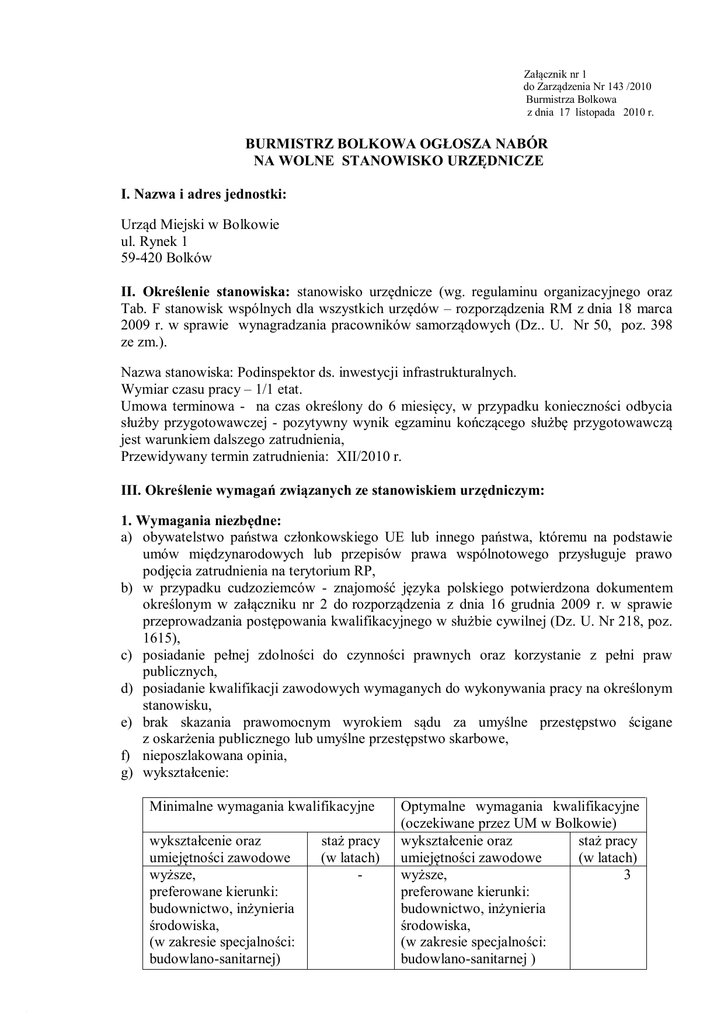 Załącznik nr 1 do Zarządzenia Nr 143 /2010 Burmistrza Bolkowa z dnia 17 listopada 2010 r. BURMISTRZ BOLKOWA OGŁOSZA NABÓR NA WOLNE STANOWISKO URZĘDNICZE I. Nazwa i adres jednostki: Urząd Miejski w Bolkowie ul. Rynek 1 59-420 Bolków II. Określenie stanowiska: stanowisko urzędnicze (wg. regulaminu organizacyjnego oraz Tab. F stanowisk wspólnych dla wszystkich urzędów – rozporządzenia RM z dnia 18 marca 2009 r. w sprawie wynagradzania pracowników samorządowych (Dz.. U. Nr 50, poz. 398 ze zm.). Nazwa stanowiska: Podinspektor ds. inwestycji infrastrukturalnych. Wymiar czasu pracy – 1/1 etat. Umowa terminowa - na czas określony do 6 miesięcy, w przypadku konieczności odbycia służby przygotowawczej - pozytywny wynik egzaminu kończącego służbę przygotowawczą jest warunkiem dalszego zatrudnienia, Przewidywany termin zatrudnienia: XII/2010 r. III. Określenie wymagań związanych ze stanowiskiem urzędniczym: 1. Wymagania niezbędne: a) obywatelstwo państwa członkowskiego UE lub innego państwa, któremu na podstawie umów międzynarodowych lub przepisów prawa wspólnotowego przysługuje prawo podjęcia zatrudnienia na terytorium RP, b) w przypadku cudzoziemców - znajomość języka polskiego potwierdzona dokumentem określonym w załączniku nr 2 do rozporządzenia z dnia 16 grudnia 2009 r. w sprawie przeprowadzania postępowania kwalifikacyjnego w służbie cywilnej (Dz. U. Nr 218, poz. 1615), c) posiadanie pełnej zdolności do czynności prawnych oraz korzystanie z pełni praw publicznych, d) posiadanie kwalifikacji zawodowych wymaganych do wykonywania pracy na określonym stanowisku, e) brak skazania prawomocnym wyrokiem sądu za umyślne przestępstwo ścigane z oskarżenia publicznego lub umyślne przestępstwo skarbowe, f) nieposzlakowana opinia, g) wykształcenie: Minimalne wymagania kwalifikacyjne wykształcenie oraz umiejętności zawodowe wyższe, preferowane kierunki: budownictwo, inżynieria środowiska, (w zakresie specjalności: budowlano-sanitarnej) staż pracy (w latach) - Optymalne wymagania kwalifikacyjne (oczekiwane przez UM w Bolkowie) wykształcenie oraz staż pracy umiejętności zawodowe (w latach) wyższe, 3 preferowane kierunki: budownictwo, inżynieria środowiska, (w zakresie specjalności: budowlano-sanitarnej ) 2. Wymagania dodatkowe: 1) Biegła obsługa komputera umiejętność obsługi komputera w obszarze środowiska Windows (pakiet MS Office: Word, Excel ) i korzystania z Internetu. 2) Zaangażowanie i samodzielność przy wykonywaniu powierzonych zadań, umiejętność dobrej organizacji pracy na własnym stanowisku i pracy w zespole, odpowiedzialność, sumienność i rzetelność. 3) Wysoka kultura osobista, umiejętność redagowania pism, logicznego myślenia, stosowania przepisów prawnych, komunikatywność, odporność na stres. 4) Ogólna znajomość aktów prawnych niezbędnych do wykonywania zadań przewidzianych na stanowisku, a w szczególności: a) ustawy z dnia 7 lipca 1994 r. - Prawo budowlane (Dz. U. z 2006 r. Nr 156, poz. 1118 ze zm.) b) ustawy z dnia 8 marca 1990 r. o samorządzie gminnym (Dz. U. z 2001 r. Nr 142, poz. 1591 ze zm.), c) ustawy z dnia 29 stycznia 2004 r .- Prawo zamówień publicznych (tj.: Dz. U. z 2007 r. Nr 223, poz. 1655 ze zm.), d) ustawy z dnia 14 czerwca 1960 r. - Kodeks postępowania administracyjnego (tj.: Dz. U. 2000 r. nr 98, poz. 1071 ze zm. ), e) prawa miejscowego, IV. Zakres wykonywanych zadań na stanowisku: 1) przygotowywanie, nadzór nad realizacją oraz rozliczanie inwestycji w zakresie infrastruktury i gospodarki wodno-ściekowej prowadzonych przez gminę, 2) znajomość zasad sporządzania kosztorysów inwestorskich, prowadzenie analiz dokumentacji kosztorysowo-projektowej, dokonywanie uzgodnień formalno-prawnych przy przygotowywaniu inwestycji, 3) prowadzenie postępowań o zamówienia publiczne dotyczących inwestycji infrastrukturalnych z zakresu gospodarki wodno-ściekowej gminy, 4) planowanie rozwoju sieci wodno-kanalizacyjnej na terenie gminy oraz ustalanie priorytetów zaspokajania potrzeb w tej dziedzinie, 5) ścisła współpraca z odpowiednimi służbami w zakresie prawidłowego utrzymania urządzeń wodno-kanalizacyjnych, 6) bieżąca analiza prawidłowości wykorzystania oraz rozliczanie otrzymanych przez gminę dotacji w zakresie infrastruktury i gospodarki wodno-ściekowej, V. Wymagane dokumenty: 1) list motywacyjny*, 2) życiorys (CV) z opisem przebiegu pracy zawodowej * , 3) kwestionariusz osobowy dla kandydata (do pobrania: umbolkow.bip.net.pl/, 4) kserokopie dokumentów poświadczających wykształcenie, uprawnienia i kwalifikacje zawodowe, udział w kursach i szkoleniach, 5) oryginały lub kserokopie świadectw z poprzednich miejsc pracy lub innych dokumentów potwierdzających okresy zatrudnienia, obejmujących okresy przypadające w bieżącym roku kalendarzowym. * List motywacyjny oraz życiorys (CV) należy opatrzyć klauzulą: „Wyrażam zgodę na przetwarzanie moich danych osobowych zawartych w ofercie pracy dla potrzeb niezbędnych do realizacji procesu rekrutacji na stanowisko: Podinspektora d/s inwestycji infrastrukturalnych w Urzędzie Miejskim w Bolkowie, zgodnie z ustawą z dnia 29 sierpnia 1997 r. o ochronie danych osobowych (tj.: Dz. U. z 2002 r. Nr 101, poz. 926 ze zm. ) oraz ustawą z dnia 21 listopada 2008 r. o pracownikach samorządowych (Dz. U. Nr 223, poz. 1458 ze zm.)”. VI. Termin i miejsce składania dokumentów: do 29 listopada 2010 r. do godz. 15:00. Oferty, które wpłyną do Urzędu po wyżej określonym terminie, nie będą rozpatrywane. O terminie i miejscu II etapu naboru kandydaci zostaną powiadomieni telefonicznie w ciągu 2 dni od daty posiedzenia, na którym komisja zapozna się ze złożonymi ofertami. Oferty należy składać w zamkniętej kopercie w Urzędzie Miejskim w Bolkowie pok. nr 9 (sekretariat), albo przesłać na adres: Urząd Miejski w Bolkowie, ul. Rynek 1, 59-420 Bolków z dopiskiem: ”Nabór na wolne st