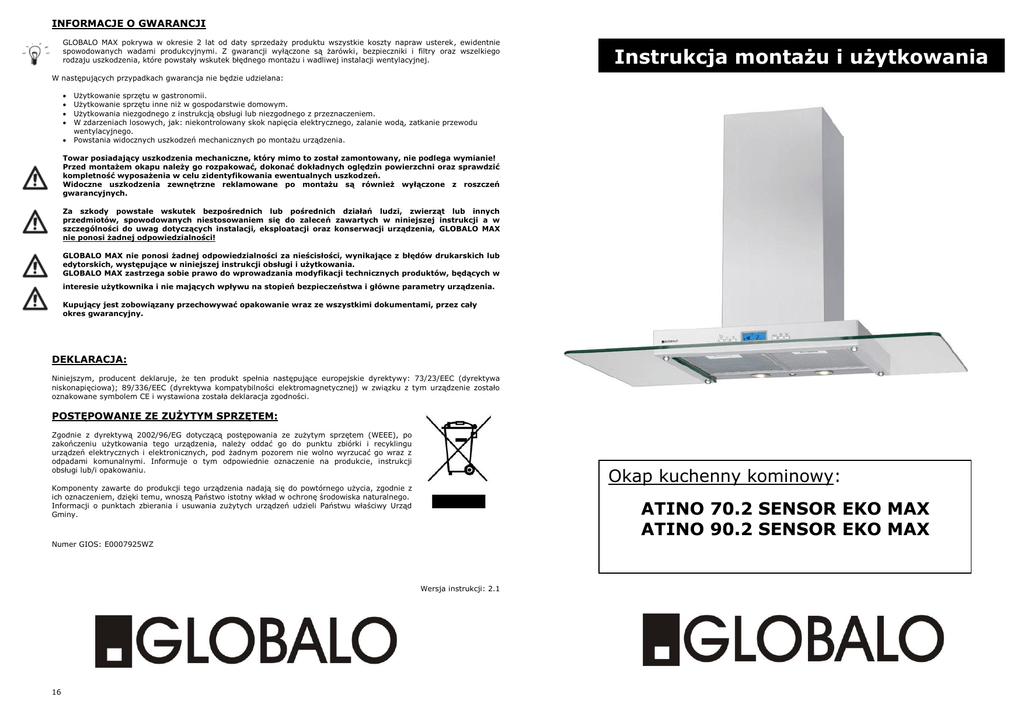 Instrukcja obsługi okapu GLOBALO Atino 90.2 Sensor Eko Max