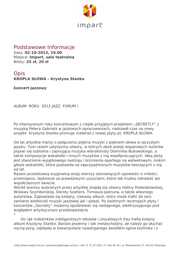 Podstawowe Informacje Data: 02-10-2013, 19.00 Miejsce: Impart, sala teatralna Bilety: 25 zł, 20 zł Opis KROPLA SŁOWA – Krystyna Stańko koncert jazzowy ALBUM ROKU 2012 JAZZ FORUM ! Po intensywnym roku koncertowym z ciepło przyjętym projektem „SECRETLY” z muzyką Petera Gabriela w jazzowych opracowaniach, nadszedł czas na nowy projekt. Krystyna Stańko promuje materiał z nowej płyty pt. KROPLA SŁOWA. Od lat artystka marzy o połączeniu piękna muzyki z pięknem słowa w ojczystym języku. Tym razem usłyszymy utwory, w których obok poezji wspaniałych autorów pojawi się subtelna i zajmująca muzyka wibrafonisty Dominika Bukowskiego, a także kompozycje wokalistki i innych muzyków z nią współpracujących. Ideą płyty jest stworzenie wyjątkowego nastroju i brzmienia opartego na welwetowym, niskim głosie wokalistki, która postawiła na zaprzyjaźnionych muzyków tworzących z nią od lat. Razem przedstawią oryginalną wizję wierszy stanowiących opowieści o miłości, przemijaniu, tęsknocie za prawdziwymi uczuciami, które tak trudno odnaleźć we współczesnym świecie. Wśród wierszy wybranych przez artystkę znajdą się utwory Haliny Poświatowskiej, Wisławy Szymborskiej, Doroty Szatters, Tomasza Jastruna, a także własnego autorstwa. Zapowiada się kolejny, ciekawy album, który może trafić do serc zarówno wielbicieli muzyki jazzowej jak i poezji. Po świetnych recenzjach płyty i koncertów „Secretly” możemy spodziewać się następnego, elektryzującego pod względem artystycznym przedsięwzięcia. * Do rąk miłośników inteligentnych tekstów i zmysłowych fraz trafia kolejny album Krystyny Stańko. Bardzo jesienny i tak melancholijny, że należy go słuchać nocną porą, najlepiej w towarzystwie rozedrganego światłem ognia kominka i z http://www.impart.art.pl | [email protected] | +48 71 71 27 100 | 71 341 94 32 | ul. Mazowiecka 17, 50-412 Wrocław lampką czerwonego wina. Wytrawnego, jak wytrawne artystycznie są te interpretacje. Od strony kompozytorskiej niniejszy album to popis umiejętności Dominika Bukowskiego, który stworzył siedem z zawartych na płycie utworów, dwa to dzieła liderki, a całość zamyka tytułowa Kropla słowa Paula Rutschki. Imponująco wypada strona literacka, gdzie kanwę muzycznych fraz stanowią wiersze Wisławy Szymborskiej, Haliny Poświatowskiej i Tomasza Jastruna. Te poetyckie klasyki wokalistka przeciwstawia tekstom własnym i Doroty Szatters. I przyznam się, że i w tej dziedzinie Krystyna Stańko radzi sobie świetnie. Przyznam się też, że gdy tylko album trafił w moje ręce, jest najczęściej słuchaną płytą. I to nie tylko z racji jego artystycznego poziomu i klimatu, ale również z tego powodu, że za każdym razem zaskakuje mnie niezwykłą stylistyczną logiką. Pod względem emocji ułożony został bardzo płynnie, co czyni go, liczącą dziesięć rozdziałów, opowieścią pełną kobiecych refleksji. Tak solidnej i pięknej płyty poetyckiej w jazzowym krwioobiegu nie mieliśmy od czasu „Umiera piękno” Agi Zaryan. – Piotr Iwicki Głosami czytelników Jazz Forum płyta zyskała tytuł Albumu Roku 2012 To trzeba usłyszeć!!! Obsada Krystyna Stańko - vocal , gitara Dominik Bukowski - vibrafon Piotr Lemańczyk - kontrabas Irek Wojtczak – saksofon, flet, klarnet basowy Cezary Konrad - perkusja http://www.impart.art.pl | [email protected] | +48 71 71 27 100 | 71 341 94 32 | ul. Mazowiecka 17, 50-412 Wrocław Powered by TCPDF (www.tcpdf.org)