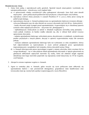 Demokratyczne Ateny 1. Ateny były jedną z największych polis greckich. Spośród innych miast-państw wyróżniały się ustrojem politycznym – demokracją, czyli rządami ludu: a) w sprawowaniu władzy uczestniczyli tylko pełnoprawni obywatele Aten (byli nimi dorośli mężczyźni) – praw politycznych pozbawieni byli przybysze z innych krajów oraz kobiety, b) największy rozkwit Ateny przeżyły w czasach Peryklesa (V w. p.n.e.), który przez szereg lat pełnił urząd stratega, c) najważniejsze decyzje w Atenach podejmowano na zgromadzeniu ludowym (zwanym eklezją) – wówczas kilkanaście razy do roku zbierali się wszyscy obywatele (od 6 do 40 tys. Ateńczyków): - każdy obywatel mógł wystąpić przed zgromadzeniem i wypowiedzieć się w określonej sprawie (ceniono sobie najlepszych mówców – nazywano ich „demagogami”), - najbiedniejszym Ateńczykom za udział w obradach wypłacano niewielką sumę pieniędzy – warto jednak wiedzieć, że bardzo rzadko zdarzało się, aby w eklezji brali udział wszyscy uprawnienie obywatele, - zadania zgromadzenia ludowego: uchwalanie prawa, decydowanie o wydatkach, wysłuchiwanie posłów przybyłych z innych państw, decyzje w sprawie wypowiedzenia wojny lub zawarcia pokoju, - ważnym zadaniem zgromadzenia ludowego było też wybieranie co roku urzędników, którzy byli odpowiedzialni za wprowadzanie w życie uchwał podjętych przez zgromadzenie (najważniejszymi z urzędników byli stratedzy, którzy dowodzili armią i flotą) d) w Atenach obowiązywało prawo pozwalające wygnać z miasta człowieka, który uważany był za wroga demokracji – raz w roku podczas obrad zgromadzenia obywatele w tajnym głosowaniu na glinianych tabliczkach zapisywali nazwisko tej osoby, która ich zdaniem mogła zagrażać demokracji (ten kogo nazwisko pojawiało się najczęściej został skazywany na 10 lat wygania, czyli banicji), 2. Akropol to strome wapienne wzgórze w Atenach. 3. Agora to centralny plac w Atenach, gdzie toczyło się życie polityczne (tam odbywały się zgromadzenia ludowe i tam przemawiali demagodzy), gospodarcze (tam handlowano) oraz towarzyskie (tam np. można było spotkać rozprawiających o życiu filozofów).