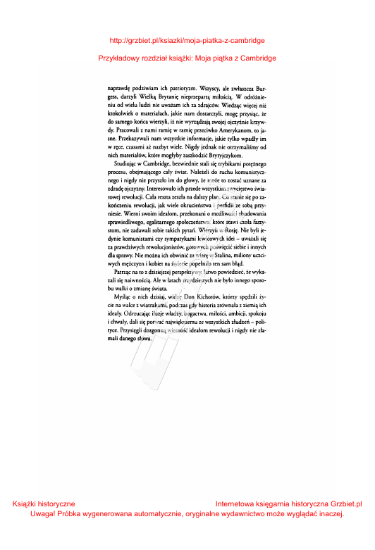 http://grzbiet.pl/ksiazki/moja-piatka-z-cambridge Przykładowy rozdział książki: Moja piątka z Cambridge naprawdę podziwiam ich patriotyzm. Wszyscy, ale zwłaszcza Bur Wielką Bryranię nieprzepaną miłością. W odróżnie niu od wielu ludzi nie uważam ich za zdrajców. Wiedząc więcej niż ktokolwiek o materiałach, jakie nam dostarczyli, mogę przysiąc. że do samego końca wierzyli, iż nie wyrządzają swojej ojczyźnie krzyw dy. Pracowali z nami ramię w ramię przeciwko Amerykanom. to ja sne. Przekazywali nam wszystkie informacje, jakie tylko wpadły im w ~e, czasami aż nazbyt wiele. Nigdy jednak nie otrzymaliśmy od nich materiałów, które mogłyby zaszkodzić Brytyjczykom. Studiując w Cambridge, bezwiednie stali się trybikami potężnego procesu, obejmującego cały świat. Należeli do ruchu komunisrycz nego i nigdy nie przyszło im do głowy, że może to zostać uznane za zdradę ojczyzny. Interesowało ich przede wszystkim zwycięstwo świa towej rewolucji. Cała reszra zeszła na dalszy plan. Co stanie się po za kończeniu rewolucji, jak wiele okrucieństwa i perfidii ze sobą przy niesie. Wierni swoim ideałom, przekonani o możliwości zbudowania sprawiedliwego, egalitarnego społeczeństwa, które stawi czoła faszy stom, nie zadawali sobie takich pytań. Wierzyli w Rosję. Nie byli je dynie komunistami czy sympatykami lewicowych idei - uważali się za prawdziwych rewolucjonistów, gotowych poświęcić siebie i innych dla sprawy. Nie można ich obwinić za wiarę- w Stalina. miliony uczci wych mężczyzn i kobiet na świecie popełniło ten sam błąd. Pamąc na to z dzisiejszej perspektywy, łatwo powiedzieć, że wyka zali się naiwnością. Ale w latach rrzyd.ziesrych nie było innego sposo bu walki o zmianę świata. Myśląc o nich dzisiaj, widzę Don Kichorów. którzy spędzili ży cie na walce z wiatrakami, podczas gdy historia zrównała z zi~mią ich ideały. Odrzucając iluzje władzy. bogactwa, miłości, ambicji. spokoju i chwały, dali się porwać największemu ze wszystkich złudzeń- poli tyce. Przysięgli dozgonną wierność ideałom rewolucji i nigdy nie zła mali danego słowa. gess, darzyli Książki historyczne Internetowa księgarnia historyczna Grzbiet.pl Uwaga! Próbka wygenerowana automatycznie, oryginalne wydawnictwo może wyglądać inaczej. http://grzbiet.pl/ksiazki/moja-piatka-z-cambridge Przykładowy rozdział książki: Moja piątka z Cambridge Spis rzeczy LONDYN, LUTY 1948 . W SZEREGACH KGB .. 15 NA)LEPSZY WYBÓR ... 33 LUDZIE CIENIA .... 103 LONDYŃSKIE SPOTKANIA .. 139 UCIECZKA W POPŁOCHU ................................ . 177 GRA KOŃCOWA .. 205 TRZE) OBYWATELE RADZIECCY 267 Książki historyczne Internetowa księgarnia historyczna Grzbiet.pl Uwaga! Próbka wygenerowana automatycznie, oryginalne wydawnictwo może wyglądać inaczej. http://grzbiet.pl/ksiazki/moja-piatka-z-cambridge Przykładowy rozdział książki: Moja piątka z Cambridge Philby natychmiast zrozumiał, ie chodzi o w, ii w przeszłości z panią komunistyczną. Nie nalegał- wycofał poda nie i na jakiś czas porzucił myśl o pracy w administracji pańsrwo wej. Równocześnie oficjalnie i merodycznie zrywał wszelkie więzy łączące go z panią. Wszystkim swoim rozmówcom dawał do zrozu mienia, że dla niego komunizm to już zamknięty rozdział. Od rej chwili jego celem srało się wejście do śmietanki mwarzyskiej Lon· sympatyzował dyn u. Zbiegło się to w czasie z wyjawieniem mu przez jego oficera pro dla kogo rak naprawdę pracuje. Co ciekawe, nie zrobi na Philbym większego wrażenia. Wydaje mi się. że podejrze wał to już od jakiegoś czasu. Następnie prowadzący poprosił go. by skupił się na Niemczech i pojechał ram w poszukiwaniu osób, które można by wykorzystać przeciwko nazistowskiemu reżimowi. Mimo studiów w Cambridge Kim Philby miał poważne kło poty ze znalezieniem pracy. Interesowało go dziennikarstwo. Ko niec końców udało mu się zostać współpracownikiem londyńskie go pisma "Review of Reviews". Wiedział doskonale, że ra praca raczej nie da mu zbyr wielu okazji do prowadzenia walki z taszy zmem, jednak mimo wszystko wykorzystał wpływy ojca, by zinfil rrować grupę sympatyków nazizmu związanych z lady Asror, dołą czyć do organizacji Anglo-German Felłowship i poznać Joachima von Ribbentropa, hitlerowskiego ambasadora w Londynie i przy szłego ministra spraw zagranicznych Trzeciej Rzeszy. Ich stosunki były serdeczne, wręcz przyjacielskie. Ribbentrop nat~·chmiast polu bil Philby'ego i zarekomendował go Josephowi Goebbdsowi. mini strowi propagandy, chcąc pomóc mu w znalezieniu posJ.d~- w Ber linie. Philby zgodnie z planem pojechał do Niemie( i spotkał sit; z Goebbelscm. l chociaż spotkanie w nie przyniosło żadnych kon kretów, Kim się nic zniechęcał. zwłaszcza że ojciec przedstawił go profesorowi Haushoferowi, wydawcy niemieckiego czasopisma nGeopolitik", które popularyzowało poglądy Hitlera dor~·czące no wego porządku świata. wadzącego, ło to 46 Książki historyczne Internetowa księgarnia historyczna Grzbiet.pl Uwaga! Próbka wygenerowana automatycznie, oryginalne wydawnictwo może wyglądać inaczej. http://grzbiet.pl/ksiazki/moja-piatka-z-cambridge Przykładowy rozdział książki: Moja piątka z Cambridge \X\siłki Philby'ego wreszcie zaczęły przynosić rezultaty. Pierwszą przez niego do oficera prowadzącego była kilka stron lista nazwisk sympatyków nazizmu w kręgach rządowych, a także wśród polityków i aryS[okracji Wielkiej Bryta nii. Do listy dołączona była analiza wypowiedzi różnych arystokra tów, przedsiębiorców i polityków dotyczących narodowego socja lizmu i Hitlera. Aż do wybuchu wojny ta lista wydawała się raczej informacją przekazaną zajmująca mało znacząca. W połowie 1935 roku Kim Phiłby zaczął spotykać się systema rycznie z Ononem (DeuNhem). Na początku 1936 roku do Deu tscha dołączył Theodore Maly, króry przyjecha