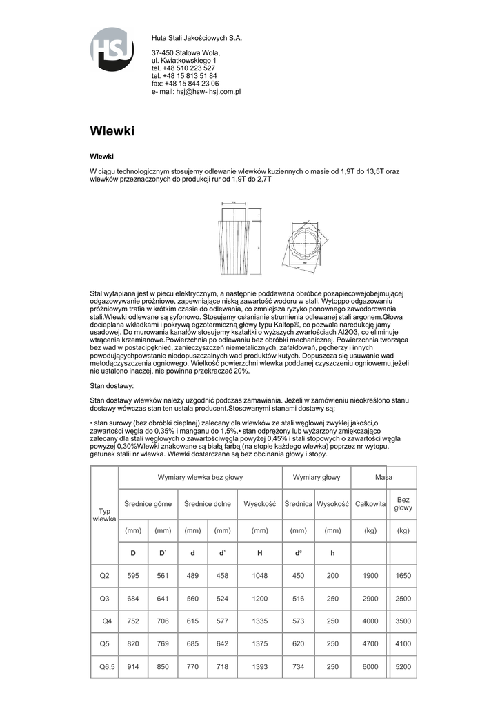 Huta Stali Jakościowych S.A. 37-450 Stalowa Wola, ul. Kwiatkowskiego 1 tel. +48 510 223 527 tel. +48 15 813 51 84 fax: +48 15 844 23 06 e- mail: hsj@hsw- hsj.com.pl Wlewki Wlewki W ciągu technologicznym stosujemy odlewanie wlewków kuziennych o masie od 1,9T do 13,5T oraz wlewków przeznaczonych do produkcji rur od 1,9T do 2,7T Stal wytapiana jest w piecu elektrycznym, a następnie poddawana obróbce pozapiecowejobejmującej odgazowywanie próżniowe, zapewniające niską zawartość wodoru w stali. Wytoppo odgazowaniu próżniowym trafia w krótkim czasie do odlewania, co zmniejsza ryzyko ponownego zawodorowania stali.Wlewki odlewane są syfonowo. Stosujemy osłanianie strumienia odlewanej stali argonem.Głowa docieplana wkładkami i pokrywą egzotermiczną głowy typu Kaltop®, co pozwala naredukcję jamy usadowej. Do murowania kanałów stosujemy kształtki o wyższych zwartościach Al2O3, co eliminuje wtrącenia krzemianowe.Powierzchnia po odlewaniu bez obróbki mechanicznej. Powierzchnia tworząca bez wad w postacipęknięć, zanieczyszczeń niemetalicznych, zafałdowań, pęcherzy i innych powodującychpowstanie niedopuszczalnych wad produktów kutych. Dopuszcza się usuwanie wad metodączyszczenia ogniowego. Wielkość powierzchni wlewka poddanej czyszczeniu ogniowemu,jeżeli nie ustalono inaczej, nie powinna przekraczać 20%. Stan dostawy: Stan dostawy wlewków należy uzgodnić podczas zamawiania. Jeżeli w zamówieniu nieokreślono stanu dostawy wówczas stan ten ustala producent.Stosowanymi stanami dostawy są: • stan surowy (bez obróbki cieplnej) zalecany dla wlewków ze stali węglowej zwykłej jakości,o zawartości węgla do 0,35% i manganu do 1,5%,• stan odprężony lub wyżarzony zmiękczająco zalecany dla stali węglowych o zawartościwęgla powyżej 0,45% i stali stopowych o zawartości węgla powyżej 0,30%Wlewki znakowane są białą farbą (na stopie każdego wlewka) poprzez nr wytopu, gatunek stalii nr wlewka. Wlewki dostarczane są bez obcinania głowy i stopy. Wymiary wlewka bez głowy Wymiary głowy Średnica Wysokość Całkowita Bez głowy Średnice górne Średnice dolne (mm) (mm) (mm) (mm) (mm) (mm) (mm) (kg) D D1 d d1 H dg h Q2 595 561 489 458 1048 450 200 1900 1650 Q3 684 641 560 524 1200 516 250 2900 2500 Q4 752 706 615 577 1335 573 250 4000 3500 Q5 820 769 685 642 1375 620 250 4700 4100 Q6,5 914 850 770 718 1393 734 250 6000 5200 Typ wlewka Wysokość Masa (kg) Q8 981 917 815 762 1622 760 250 7800 6800 Q12 1124 1053 952 892 1667 880 280 10700 9300 Q15 1208 1132 1025 960 1773 960 280 13500 11700 i przenoszenie ciężkich materiałów, Stal węglowa, Stal konstrukcyjna, Profilowane płyty stalowe, Profile stalowe, Stal o podwyższonej granicy plastyczności, Stal o wysokiej wytrzymałości, Stal odporna na zużycie, S690QL, S690QL1, S890QL, S960QL, HB400, Twardość HB400, HB500, Twardość HB500, Stal o podwyższonej granicy plastyczności, Grubość blachy, Stal odporna na ścieranie, Duże płyty, Ciężkie płyty, Grube płyty stalowe, Ciężkie płyty stalowe, gąsienica, Przemysł maszynowy, S355K2+N. S355NL, Płyty ze stali węglowej, Płyty konstrukcyjne, Długie stalowe płyty, Ciężkie profile, Długie stalowe płyty na magazynie, Płyty ze stali jakościowej, Szeroka gama produktów, Dystrybutorzy płyt stalowych Hurtownie stali, Udziałowcy stali, Stalownia, Huta stali, Producenci wyrobów ze stali jakościowych, Udziałowcy produktów ze stali jakościowych, przetwórcy i dystrybutorzy wyrobów ze stali wysokojakościowych, Międzynarodowi dostawcy stali, Międzynarodowe rozwiązania stali, Wypełnienie zamówienia od, Szybka dostawa, Zgodnie z oczekiwaniami klienta, Twój partner w ciężkich płytach stalowych, Gazowe cięcie tlenowo- paliwowe, Wycinanie plazmowe HD, Przygotowania do spawania, Giętarka, Obróbka skrawaniem, Gratowanie, Śrutowanie, producent wyrobów hutniczych, Płyty muszą spełnić szczególne wymagania, Potrzebujesz specjalne właściwości lub specjalne wymiary, Do dostarczania wyrobów stalowych w konkurencyjnych cenach