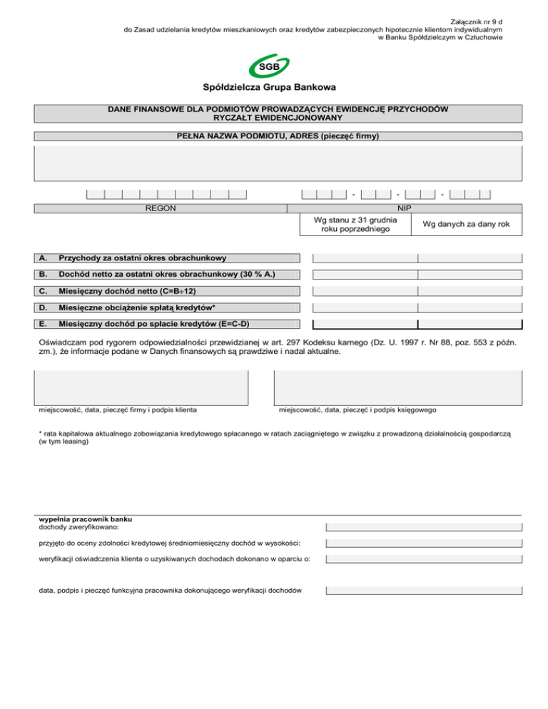 Załącznik nr 9 d do Zasad udzielania kredytów mieszkaniowych oraz kredytów zabezpieczonych hipotecznie klientom indywidualnym w Banku Spółdzielczym w Człuchowie DANE FINANSOWE DLA PODMIOTÓW PROWADZĄCYCH EWIDENCJĘ PRZYCHODÓW RYCZAŁT EWIDENCJONOWANY PEŁNA NAZWA PODMIOTU, ADRES (pieczęć firmy) - - REGON NIP Wg stanu z 31 grudnia roku poprzedniego A. Przychody za ostatni okres obrachunkowy B. Dochód netto za ostatni okres obrachunkowy (30 % A.) C. Miesięczny dochód netto (C=B12) D. Miesięczne obciążenie spłatą kredytów* E. Miesięczny dochód po spłacie kredytów (E=C-D) - Wg danych za dany rok Oświadczam pod rygorem odpowiedzialności przewidzianej w art. 297 Kodeksu karnego (Dz. U. 1997 r. Nr 88, poz. 553 z późn. zm.), że informacje podane w Danych finansowych są prawdziwe i nadal aktualne. miejscowość, data, pieczęć firmy i podpis klienta miejscowość, data, pieczęć i podpis księgowego * rata kapitałowa aktualnego zobowiązania kredytowego spłacanego w ratach zaciągniętego w związku z prowadzoną działalnością gospodarczą (w tym leasing) wypełnia pracownik banku dochody zweryfikowano: przyjęto do oceny zdolności kredytowej średniomiesięczny dochód w wysokości: weryfikacji oświadczenia klienta o uzyskiwanych dochodach dokonano w oparciu o: data, podpis i pieczęć funkcyjna pracownika dokonującego weryfikacji dochodów