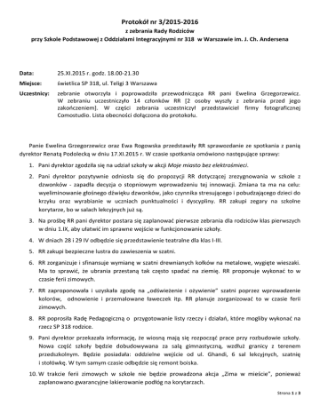 Protokół nr 3/2015-2016 z zebrania Rady Rodziców przy Szkole Podstawowej z Oddziałami Integracyjnymi nr 318 w Warszawie im. J. Ch. Andersena Data: 25.XI.2015 r. godz. 18.00-21.30 Miejsce: świetlica SP 318, ul. Teligi 3 Warszawa Uczestnicy: zebranie otworzyła i poprowadziła przewodnicząca RR pani Ewelina Grzegorzewicz. W zebraniu uczestniczyło 14 członków RR [2 osoby wyszły z zebrania przed jego zakończeniem]. W części zebrania uczestniczył przedstawiciel firmy fotograficznej Comostudio. Lista obecności dołączona do protokołu. Panie Ewelina Grzegorzewicz oraz Ewa Rogowska przedstawiły RR sprawozdanie ze spotkania z panią dyrektor Renatą Podolecką w dniu 17.XI.2015 r. W czasie spotkania omówiono następujące sprawy: 1. Pani dyrektor zgodziła się na udział szkoły w akcji Moje miasto bez elektrośmieci. 2. Pani dyrektor pozytywnie odniosła się do propozycji RR dotyczącej zrezygnowania w szkole z dzwonków - zapadła decyzja o stopniowym wprowadzeniu tej innowacji. Zmiana ta ma na celu: wyeliminowanie głośnego dźwięku dzwonków, jako czynnika stresującego i pobudzającego dzieci do krzyku oraz wyrabianie w uczniach punktualności i dyscypliny. RR zakupi zegary na szkolne korytarze, bo w salach lekcyjnych już są. 3. Na prośbę RR pani dyrektor postara się zaplanować pierwsze zebrania dla rodziców klas pierwszych w dniu 1.IX, aby ułatwić im sprawne wejście w funkcjonowanie szkoły. 4. W dniach 28 i 29 IV odbędzie się przedstawienie teatralne dla klas I-III. 5. RR zakupi bezpieczne lustra do zawieszenia w szatni. 6. RR zorganizuje i sfinansuje wymianę w szatni drewnianych kołków na metalowe, wygięte wieszaki. Ma to sprawić, że ubrania przestaną tak często spadać na ziemię. RR proponuje wykonać to w czasie ferii zimowych. 7. RR zaproponowała i uzyskała zgodę na „odświeżenie i ożywienie” szatni poprzez wprowadzenie kolorów, odnowienie i przemalowane ławeczek itp. RR planuje zorganizować to w czasie ferii zimowych. 8. RR poprosiła Radę Pedagogiczną o przygotowanie listy rzeczy i działań, które mogliby wykonać na rzecz SP 318 rodzice. 9. Pani dyrektor przekazała informację, że wiosną mają się rozpocząć prace przy rozbudowie szkoły. Nowa część szkoły będzie dobudowywana za salą gimnastyczną, wzdłuż granicy z terenem przedszkolnym. Będzie posiadała: oddzielne wejście od ul. Ghandi, 6 sal lekcyjnych, szatnię i stołówkę. W tym samym czasie odbędzie się remont boiska. 10. W trakcie ferii zimowych w szkole nie będzie prowadzona akcja „Zima w mieście”, ponieważ zaplanowano gwarancyjne lakierowanie podłóg na korytarzach. Strona 1 z 3 11. RR przekazała uwagi docierające od rodziców, by śmietniki stojące przy frontowym murku szkoły nie były już dłużej jej wizytówką i uzyskała zapewnienie, że zostaną one przesunięte i zasłonięte, tak aby nie szpeciły frontu szkoły. 12. Szkoła otrzymała pieniądze na zakup książek do biblioteki – jest to efekt udziału w zeszłorocznym konkursie. Zakupy są w trakcie realizacji. 13. RR poprosiła o rozpropagowanie wśród nauczycieli możliwości pozyskiwania nagród dla laureatów szkolnych konkursów z różnych firm i instytucji tematycznie związanych z konkursami. Nagrody dla uczestników konkursu Zwierzęta naszych lasów otrzymano z Lasów Państwowych. 14. W II semestrze w szkole zostaną wykonane pamiątkowe zdjęcia klasowe oraz indywidulane i koleżeńskie. RR jest w trakcie wyboru fotografa. Przy tej okazji RR zaproponowała zrobienie zdjęć portretowych nauczycielom i specjalistom pracującym w szkole, w celu umieszczenia ich na tablicy przy Pokoju Nauczycielskim i Świetlicy, żeby rodzice mieli okazję poznać nauczycieli swoich dzieci, a zainteresowani kontaktem z danym nauczycielem, wiedzieli kogo mają szukać. 15. RR planuje zorganizowanie w b.r. szkolnym wyprzedaży „garażowej”, w której będą mogły jako sprzedający uczestniczyć rodziny uczniów SP 318. 16. Pani dyrektor wspomniała, że w SP 319 (ZWM) RR finansuje serwis wycieraczek bawełnianych i że podobne rozwiązanie mogłoby przydać się też w naszej szkole. RR postanowiła skonsultować się z RR z SP 319 i dowiedzieć jak to rozwiązanie funkcjonuje i jakie generuje koszty. 17. Pani dyrektor wyraziła zgodę, by jedna z tablic w szatni była przeznaczona na informacje o wszystkich zajęciach płatnych odbywających się w SP 318. Dzięki temu rodzice zainteresowani zajęciami w trakcie semestru będą mieli możliwość łatwiejszego dotarcia do prowadzących zajęcia. W dalszej części zebrania poruszono następujące kwestie: 1. Członkowie RR poprosili przewodniczącą o przypomnienie dyrekcji o sprawie instalowania w szkole źródełek wody pitnej. 2. Członkowie RR przekazali docierające do nich skargi na stopnie na schodach. Dzieci ślizgają się na zejściu do szatni od strony sali gimnastycznej. RR wnioskuje o wymianę naklejonych tam taśm. 3. RR kontynuuje temat wprowadzenia do szkoły naklejek z grami podwórkowymi. RR jest w trakcie rozmów z firmą, która w chwili obecnej wprowadza specjalne naklejki do zastosowania we wnętrzach. 4. RR jest w trakcie ustalania terminu szkoleń z pierwszej pomocy dla uczniów klas I – III. Szkolenia odbędą się w drugim semestrze roku szkolnego 2015/2016. 5. RR otrzymała informacje od rodziców i od dzieci, że w świetlicach jest mało zabawek i brakuje uspokajającej zieleni. W związku z tym postanowiła doposażyć świetlice wg aktualnych możliwości finansowych. Uchwała nr 19/2015-16, 13 ZA W najbliższym czasie planowane są zakupy: kolorowych pudeł na zabawki, stołu z piłkarzykami, klocków konstrukcyjnych, stołu do cymbergaja oraz kwiatów doniczkowych. Strona 2 z 3 6. Rodzice zgłaszają potrzebę wydzielenia miejsca na tablicy ogłoszeń w szatni przeznaczonego na zamieszczanie informacji o odwołanych zajęciach dodatkowych, ponieważ zdarzają się sytuacje, że zajęcia t