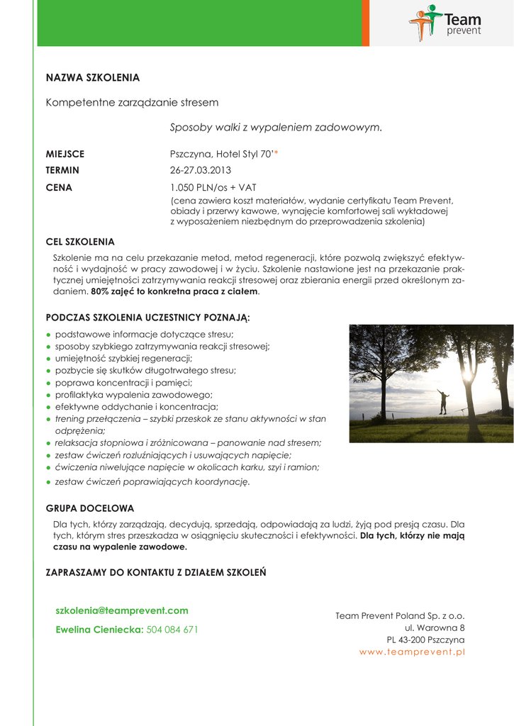 NAZWA SZKOLENIA Kompetentne zarządzanie stresem Sposoby walki z wypaleniem zadowowym. MIEJSCE Pszczyna, Hotel Styl 70’* TERMIN 26-27.03.2013 CENA 1.050 PLN/os + VAT (cena zawiera koszt materiałów, wydanie certyfikatu Team Prevent, obiady i przerwy kawowe, wynajęcie komfortowej sali wykładowej z wyposażeniem niezbędnym do przeprowadzenia szkolenia) CEL SZKOLENIA Szkolenie ma na celu przekazanie metod, metod regeneracji, które pozwolą zwiększyć efektywność i wydajność w pracy zawodowej i w życiu. Szkolenie nastawione jest na przekazanie praktycznej umiejętności zatrzymywania reakcji stresowej oraz zbierania energii przed określonym zadaniem. 80% zajęć to konkretna praca z ciałem. PODCZAS SZKOLENIA UCZESTNICY POZNAJĄ: ● podstawowe informacje dotyczące stresu; ● sposoby szybkiego zatrzymywania reakcji stresowej; ● umiejętność szybkiej regeneracji; ● pozbycie się skutków długotrwałego stresu; ● poprawa koncentracji i pamięci; ● profilaktyka wypalenia zawodowego; ● efektywne oddychanie i koncentracja; ● trening przełączenia – szybki przeskok ze stanu aktywności w stan odprężenia; ● relaksacja stopniowa i zróżnicowana – panowanie nad stresem; ● zestaw ćwiczeń rozluźniających i usuwających napięcie; ● ćwiczenia niwelujące napięcie w okolicach karku, szyi i ramion; ● zestaw ćwiczeń poprawiających koordynację. GRUPA DOCELOWA Dla tych, którzy zarządzają, decydują, sprzedają, odpowiadają za ludzi, żyją pod presją czasu. Dla tych, którym stres przeszkadza w osiągnięciu skuteczności i efektywności. Dla tych, którzy nie mają czasu na wypalenie zawodowe. ZAPRASZAMY DO KONTAKTU Z DZIAŁEM SZKOLEŃ [email protected] Ewelina Cieniecka: 504 084 671 Team Prevent Poland Sp. z o.o. ul. Warowna 8 PL 43-200 Pszczyna www.teamprevent.pl