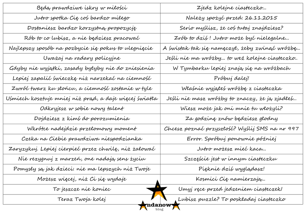 Będą prawdziwe iskry w miłości Zjedz kolejne ciasteczko... Jutro spotka Cię coś bardzo miłego Należy spożyć przed: 26.11.2015 Dostaniesz bardzo korzystną propozycję Serio myślisz, że coś tutaj znajdziesz? Rób to co lubisz, a nie będziesz pracować Zrób to dziś ! Jutro może być nielegalne... Najlepszy sposób na pozbycie się pokus to ulegnięcie A świstak tak się namęczył, żeby zwinąć wróżbę... Uważaj na radary policyjne Jeśli nie ma wróżby... to weź kolejne ciasteczko.. Gdyby nie wyjątki, zasady byłyby nie do zniesienia W Tymbarku lepiej znają się na wróżbach Lepiej zapalić świeczkę niż narzekać na ciemność Próbuj dalej! Zwróć twarz ku słońcu, a ciemność zostanie w tyle Właśnie wyjąłeś wróżbę z ciasteczka Uśmiech kosztuje mniej niż prąd, a daje więcej światła Jeśli nie masz wróżby to znaczy, że ją zjadłeś... Odkryjesz w sobie nowy talent Wiesz może jak oni mnie tu włożyli? Dojdziesz z kimś do porozumienia Za godzinę znów będziesz głodny Wkrótce nadejdzie przełomowy moment Chcesz poznać przyszłość? Wyślij SMS na nr 997 Czeka na Ciebie prawdziwa niespodzianka Error. Spróbuj ponownie później Zaryzykuj. Lepiej cierpieć przez chwilę, niż żałować Jutro możesz mieć kaca... Nie rezygnuj z marzeń, one nadają sens życiu Szczęście jest w innym ciasteczku Pomysły są jak dzieci: nie ma lepszych niż Twoje Pięknie dziś wyglądasz! Możesz więcej, niż Ci się wydaje Kosmici Cię namierzają... To jeszcze nie koniec Umyj ręce przed jedzeniem ciasteczek! Teraz Twoja kolej Lubisz puzzle? To poskładaj ciasteczko