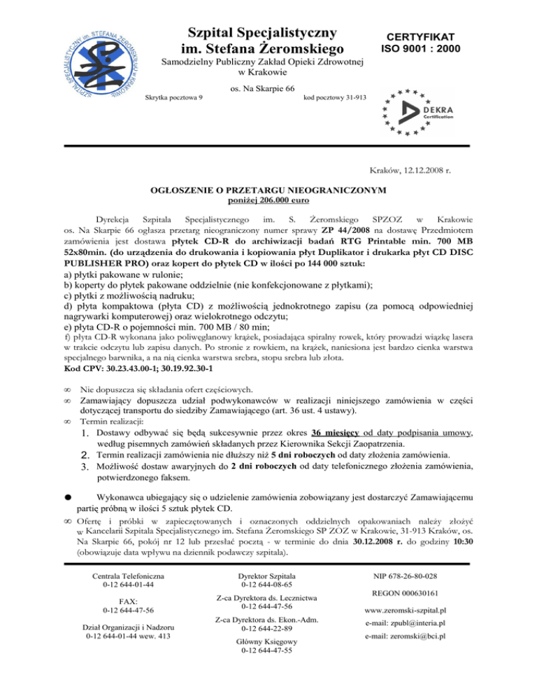 Szpital Specjalistyczny im. Stefana Żeromskiego CERTYFIKAT ISO 9001 : 2000 Samodzielny Publiczny Zakład Opieki Zdrowotnej w Krakowie os. Na Skarpie 66 Skrytka pocztowa 9 kod pocztowy 31-913 Kraków, 12.12.2008 r. OGŁOSZENIE O PRZETARGU NIEOGRANICZONYM poniżej 206.000 euro Dyrekcja Szpitala Specjalistycznego im. S. Żeromskiego SPZOZ w Krakowie os. Na Skarpie 66 ogłasza przetarg nieograniczony numer sprawy ZP 44/2008 na dostawę Przedmiotem zamówienia jest dostawa płytek CD-R do archiwizacji badań RTG Printable min. 700 MB 52x80min. (do urządzenia do drukowania i kopiowania płyt Duplikator i drukarka płyt CD DISC PUBLISHER PRO) oraz kopert do płytek CD w ilości po 144 000 sztuk: a) płytki pakowane w rulonie; b) koperty do płytek pakowane oddzielnie (nie konfekcjonowane z płytkami); c) płytki z możliwością nadruku; d) płyta kompaktowa (płyta CD) z możliwością jednokrotnego zapisu (za pomocą odpowiedniej nagrywarki komputerowej) oraz wielokrotnego odczytu; e) płyta CD-R o pojemności min. 700 MB / 80 min; f) płyta CD-R wykonana jako poliwęglanowy krążek, posiadająca spiralny rowek, który prowadzi wiązkę lasera w trakcie odczytu lub zapisu danych. Po stronie z rowkiem, na krążek, naniesiona jest bardzo cienka warstwa specjalnego barwnika, a na nią cienka warstwa srebra, stopu srebra lub złota. Kod CPV: 30.23.43.00-1; 30.19.92.30-1 • • • Nie dopuszcza się składania ofert częściowych. Zamawiający dopuszcza udział podwykonawców w realizacji niniejszego zamówienia w części dotyczącej transportu do siedziby Zamawiającego (art. 36 ust. 4 ustawy). Termin realizacji: 1. Dostawy odbywać się będą sukcesywnie przez okres 36 miesięcy od daty podpisania umowy, według pisemnych zamówień składanych przez Kierownika Sekcji Zaopatrzenia. 2. Termin realizacji zamówienia nie dłuższy niż 5 dni roboczych od daty złożenia zamówienia. 3. Możliwość dostaw awaryjnych do 2 dni roboczych od daty telefonicznego złożenia zamówienia, potwierdzonego faksem. Wykonawca ubiegający się o udzielenie zamówienia zobowiązany jest dostarczyć Zamawiającemu partię próbną w ilości 5 sztuk płytek CD. • Ofertę i próbki w zapieczętowanych i oznaczonych oddzielnych opakowaniach należy złożyć w Kancelarii Szpitala Specjalistycznego im. Stefana Żeromskiego SP ZOZ w Krakowie, 31-913 Kraków, os. Na Skarpie 66, pokój nr 12 lub przesłać pocztą - w terminie do dnia 30.12.2008 r. do godziny 10:30 (obowiązuje data wpływu na dziennik podawczy szpitala). Centrala Telefoniczna 0-12 644-01-44 FAX: 0-12 644-47-56 Dział Organizacji i Nadzoru 0-12 644-01-44 wew. 413 Dyrektor Szpitala 0-12 644-08-65 Z-ca Dyrektora ds. Lecznictwa 0-12 644-47-56 Z-ca Dyrektora ds. Ekon.-Adm. 0-12 644-22-89 Główny Księgowy 0-12 644-47-55 NIP 678-26-80-028 REGON 000630161 www.zeromski-szpital.pl e-mail: [email protected] e-mail: [email protected] Szpital Specjalistyczny im. Stefana Żeromskiego CERTYFIKAT ISO 9001 : 2000 Samodzielny Publiczny Zakład Opieki Zdrowotnej w Krakowie os. Na Skarpie 66 Skrytka pocztowa 9 kod pocztowy 31-913 • Otwarcie ofert odbędzie się w dniu 30.12.2008 r. o godzinie 11:00 w Dziale Organizacyjno-Prawnym pok. 4. • Informacji dotyczących organizacji przetargu udziela : mgr Iwona Wolnicka - Kierownik Sekcji Zamówień Publicznych, tel. (0-12) 644-01-44 wew. 413; Budynek Administracji – pok. nr 4. • Informacji dotyczących przedmiotu przetargu udziela : lek. med. Andrzej Fedak – Kierownik Działu Diagnostyki Obrazowej i Endoskopowej, tel. (0-12) 64365-30 • Ogłoszenie o przedmiotowym postępowaniu zostanie przesłane do Biuletynu Zamówień Publicznych w dniu 17.12.2008 r., a po jego publikacji umieszczone zostanie na stronie internetowej Szpitala i tablicy ogłoszeń. • Kryterium oceny ofert : cena 90 % parametry funkcjonalne 10% -------------------------------------------RAZEM 100 % • O udzielenie zamówienia mogą ubiegać się Wykonawcy spełniający warunki art. 22 ustawy Prawo zamówień publicznych. II. W celu wykazania spełnienia warunków udziału w Postępowaniu Wykonawca zobowiązany jest przedłożyć wraz z ofertą następujące oświadczenia i dokumenty : 1. W zakresie posiadania niezbędnej wiedzy i doświadczenia oraz dysponowania potencjałem technicznym i osobami zdolnymi do wykonania zamówienia: a) oświadczenie, że posiada niezbędną wiedzę i doświadczenie oraz dysponuje potencjałem technicznym i osobami zdolnymi do wykonania zamówienia, b) wykaz wykonanych lub wykonywanych, dostaw w okresie ostatnich trzech lat przed dniem wszczęcia postępowania o udzielenie zamówienia, a jeżeli okres prowadzenia działalności jest krótszy - w tym okresie; odpowiadających swoim rodzajem dostawie stanowiącej przedmiot zamówienia i wartością nie mniejszą niż wartość oferty (brutto); z podaniem ich wartości, przedmiotu, dat wykonania i odbiorców (minimum 1 dostawa) oraz dokumenty potwierdzające, że te dostawy zostały wykonane należycie (minimum 1 dokument) - według załącznika nr 3 do specyfikacji. 2. W zakresie warunku znajdowania się w sytuacji ekonomicznej i finansowej zapewniającej wykonanie zamówienia: a) oświadczenie potwierdzające, że znajduje się w sytuacji ekonomicznej i finansowej zapewniającej wykonanie zamówienia. Centrala Telefoniczna 0-12 644-01-44 FAX: 0-12 644-47-56 Dział Organizacji i Nadzoru 0-12 644-01-44 wew. 413 Dyrektor Szpitala 0-12 644-08-65 Z-ca Dyrektora ds. Lecznictwa 0-12 644-47-56 Z-ca Dyrektora ds. Ekon.-Adm. 0-12 644-22-89 Główny Księgowy 0-12 644-47-55 NIP 678-26-80-028 REGON 000630161 www.zeromski-szpital.pl e-mail: [email protected] e-mail: [email protected] Szpital Specjalistyczny im. Stefana Żeromskiego CERTYFIKAT ISO 9001 : 2000 Samodzielny Publiczny Zakład Opieki Zdrowotnej w Krakowie os. Na Skarpie 66 Skrytka pocztowa 9 kod pocztowy 31-913 3. W zakresie warunku posiadania uprawnienia do wykonywania określonej działalności lub czynnośc