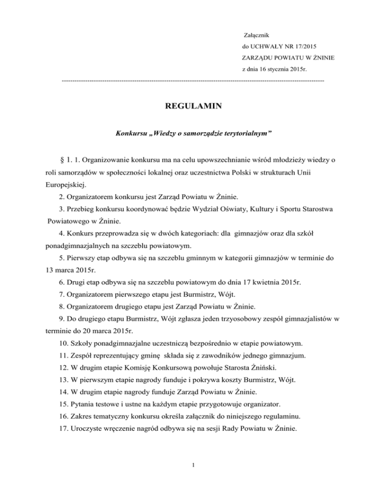 Załącznik do UCHWAŁY NR 17/2015 ZARZĄDU POWIATU W ŻNINIE z dnia 16 stycznia 2015r. --------------------------------------------------------------------------------------------------------------------------- REGULAMIN Konkursu „Wiedzy o samorządzie terytorialnym” § 1. 1. Organizowanie konkursu ma na celu upowszechnianie wśród młodzieży wiedzy o roli samorządów w społeczności lokalnej oraz uczestnictwa Polski w strukturach Unii Europejskiej. 2. Organizatorem konkursu jest Zarząd Powiatu w Żninie. 3. Przebieg konkursu koordynować będzie Wydział Oświaty, Kultury i Sportu Starostwa Powiatowego w Żninie. 4. Konkurs przeprowadza się w dwóch kategoriach: dla gimnazjów oraz dla szkół ponadgimnazjalnych na szczeblu powiatowym. 5. Pierwszy etap odbywa się na szczeblu gminnym w kategorii gimnazjów w terminie do 13 marca 2015r. 6. Drugi etap odbywa się na szczeblu powiatowym do dnia 17 kwietnia 2015r. 7. Organizatorem pierwszego etapu jest Burmistrz, Wójt. 8. Organizatorem drugiego etapu jest Zarząd Powiatu w Żninie. 9. Do drugiego etapu Burmistrz, Wójt zgłasza jeden trzyosobowy zespół gimnazjalistów w terminie do 20 marca 2015r. 10. Szkoły ponadgimnazjalne uczestniczą bezpośrednio w etapie powiatowym. 11. Zespół reprezentujący gminę składa się z zawodników jednego gimnazjum. 12. W drugim etapie Komisję Konkursową powołuje Starosta Żniński. 13. W pierwszym etapie nagrody funduje i pokrywa koszty Burmistrz, Wójt. 14. W drugim etapie nagrody funduje Zarząd Powiatu w Żninie. 15. Pytania testowe i ustne na każdym etapie przygotowuje organizator. 16. Zakres tematyczny konkursu określa załącznik do niniejszego regulaminu. 17. Uroczyste wręczenie nagród odbywa się na sesji Rady Powiatu w Żninie. 1 § 2. Etap powiatowy. Konkurs drużynowy. 1) Część testowa: a) Uczestnicy eliminacji zobowiązani są indywidualnie odpowiedzieć na pytania testowe, b) Za prawidłową odpowiedź uczestnik otrzymuje 1 punkt, przy czym spośród trzech możliwych odpowiedzi prawidłowa jest tylko jedna, c) Wynik drużynowy oblicza się sumując punkty uzyskane indywidualnie przez wszystkich członków drużyny, d) Czas rozwiązania testu wynosi: 20 minut. 2) Część multimedialna: a) Drużyna przedstawia prezentację multimedialną promującą Powiat Żniński. Prezentacja oceniana będzie pod względem: - ujęcia tematu (zawartość treściowa), - pomysłowości, komunikatywności, - doboru informacji do prezentacji, - atrakcyjności prezentacji i odbioru, - wykorzystania czasu prezentacji, - w przypadku prezentacji bez użycia narratora, dopuszcza się komentarz przez członków drużyny. b) Czas przewidziany na prezentację: 5 min, c) Ocena wynosi od 0 – 10 punktów, d) Suma punktów zdobytych przez drużynę w przedstawiony wyżej sposób decyduje o zajętym w konkurencji miejscu, e) W konkursie drużynowym wygrywa zespół, który uzyskał największą ilość punktów, będących sumą punktów uzyskanych w części testowej i za prezentację. W przypadku równej ilości punktów zdobytych przez drużyny przeprowadza się dogrywkę w postaci dodatkowych zestawów pytań. § 3.1. Konkurs indywidualny. Eliminacje. 1) W finale indywidualnym przewiduje się sześć miejsc. 2) Do finału klasyfikowane są osoby, które uzyskały po podliczeniu kolejno największą ilość punktów w drużynowych zadaniach testowych. 3) W przypadku, gdyby po podliczeniu, o którym mowa w pkt. 2, okazało się, że na sześć miejsc w finale przypada więcej niż sześć osób z równą ilością punktów, przeprowadza się dogrywkę pisemną w postaci testu, o którym mowa w §2 pkt. 1. 2 2. Konkurs indywidualny. Finał. 1) Finał indywidualny przebiega w formie ustnej. 2) Każdy uczestnik losuje pytania z listy od 1 – 30. Odpowiedź jest oceniana w skali od 0 – 3 punktów. 3) Suma punktów zdobyta przez uczestnika w przedstawiony wyżej sposób decyduje o zajętym miejscu. Wygrywa osoba, która uzyskała największa ilość punktów. 4) W przypadku zdobycia równej ilości punktów przez więcej niż jednego finalistę, w celu wyłonienia zdobywców nagród przewidziana jest dogrywka, która prowadzona będzie do skutku. § 4. Nagrody. 1) Nagrody w finale drużynowym przyznaje się szkołom za zdobycie przez ich drużyny I, II, i III miejsca. 2) Nagrody w finale indywidualnym przyznaje się uczestnikom za zdobycie I, II i III miejsca. 3) Uczestnicy finału indywidualnego i drużynowego, którzy uplasowali się na dalszych pozycjach w finale – otrzymują wyróżnienia. § 5. Decyzje w sprawach nieuregulowanych niniejszym Regulaminem podejmuje Komisja Konkursowa. Przewodniczący Zarządu Zbigniew Jaszczuk 3 Załącznik do Regulaminu ............................................................................................................................................................. ZAKRES ZAGADNIEŃ OBOWIĄZUJĄCYCH UCZESTNIKÓW KONKURSU „WIEDZY O SAMORZĄDZIE TERYTORIALNYM” A. Gimnazja 1) Konstytucja Rzeczypospolitej Polskiej z dnia 2 kwietnia 1997 r. (Dz. U. z 1997r. Nr 78 poz. 483 z późn. zm.) 2) Ustawa z dnia 8 marca 1990 r. o samorządzie gminnym. (Dz. U. z 2013 poz. 594 z późn. zm.) 3) Ustawa z dnia 5 czerwca 1998 r. o samorządzie powiatowym. (Dz. U. z 2013, poz.595 z późn. zm.) 4) Foldery i wydawnictwa promocyjne Powiatu Żnińskiego 5) Red. Jelinek J. Jan Śniadecki 250 rocznica urodzin, Materiały Konferencyjne, Miejska i Powiatowa Biblioteka Publiczna, Żnin, 2006r. 6) Red. Małecki J. Klemens Janicki, Graf-Bog, Żnin, 2006r. 7) Mirosław Binkowski, „Mój słownik gwary pałuckiej”, Wydawnictwo Dominika Księskiego WULKAN, 2009r. 8) Informacje dostępne na stronie internetowej: www.znin.pl, www.paluki.ovh.org, www.kazmiyrz.pl 9) Biuletyny Informacji Publicznej gmin Powiatu Żnińskiego 10) Oficjalne strony internetowe gmin Powiatu Żnińskiego B. Szkoły ponadgimnazjalne 1) Konstytucja Rzeczypospolitej Polskiej z dnia 2 kwietnia 1997 r. (D