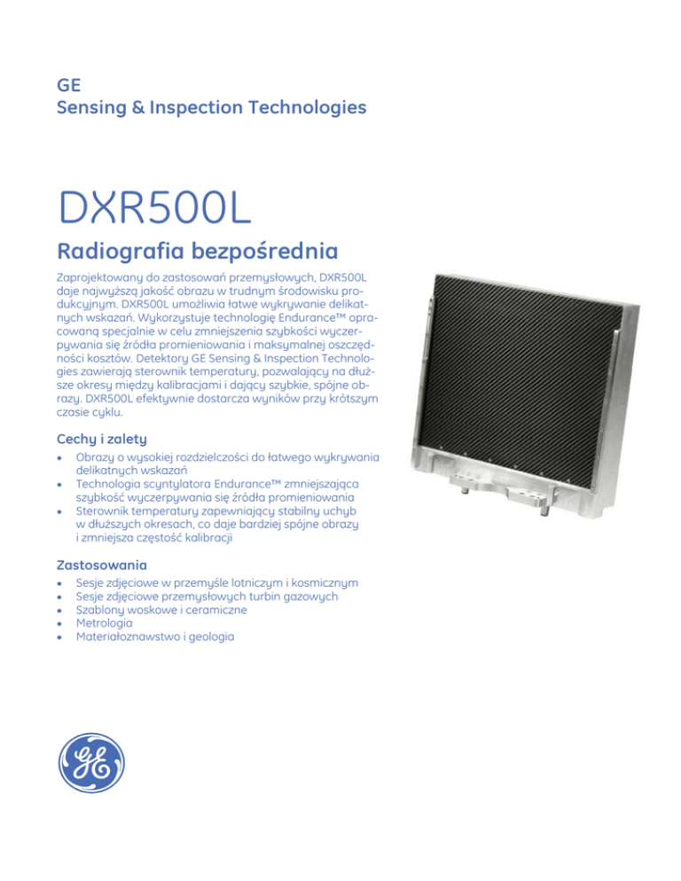 GE Sensing & Inspection Technologies DXR500L Radiografia bezpośrednia Zaprojektowany do zastosowań przemysłowych, DXR500L daje najwyższą jakość obrazu w trudnym środowisku produkcyjnym. DXR500L umożliwia łatwe wykrywanie delikatnych wskazań. Wykorzystuje technologię Endurance™ opracowaną specjalnie w celu zmniejszenia szybkości wyczerpywania się źródła promieniowania i maksymalnej oszczędności kosztów. Detektory GE Sensing & Inspection Technologies zawierają sterownik temperatury, pozwalający na dłuższe okresy między kalibracjami i dający szybkie, spójne obrazy. DXR500L efektywnie dostarcza wyników przy krótszym czasie cyklu. Cechy i zalety • • • Obrazy o wysokiej rozdzielczości do łatwego wykrywania delikatnych wskazań Technologia scyntylatora Endurance™ zmniejszająca szybkość wyczerpywania się źródła promieniowania Sterownik temperatury zapewniający stabilny uchyb w dłuższych okresach, co daje bardziej spójne obrazy i zmniejsza częstość kalibracji Zastosowania • • • • • Sesje zdjęciowe w przemyśle lotniczym i kosmicznym Sesje zdjęciowe przemysłowych turbin gazowych Szablony woskowe i ceramiczne Metrologia Materiałoznawstwo i geologia SRB (podstawowa rozdzielczość przestrzenna) Specyficzny zakres grubości materiału CS (czułość kontrastu) Wydajność = SNR przy 1 mGy Opóźnienie obrazu SRB (podstawowa rozdzielczość przestrzenna) Specyficzny zakres grubości materiału Wykresy charakterystyk detektora Wykresy charakterystyk detektora po lewej stronie są wykonane zgodnie z normą ASTM E2507-07 na wytwarzanie matryc cyfrowych detektorów radiograficznych (DDA). Standard ten umożliwia bezpośrednie porównanie obrazów DDA przez zapewnienie, że dane są zbierane i odtwarzane w sposób spójny i dokładnie określony. Norma podaje także wytyczne odpowiedniego dopasowania detektorów do zastosowań. Piksele są identyfikowane jako złe według jednej lub kilku z siedmiu definicji opisanych w normie ASTM E2597-07. Piksele oznaczone jako złe są korygowane przez oprogramowanie GE, wykorzystujące dane zebrane z sąsiednich, dobrych pikseli. CS (czułość kontrastu) Dane techniczne Dane techniczne detektora Wydajność = SNR przy 1 mGy Opóźnienie obrazu SRB (podstawowa rozdzielczość przestrzenna) Specyficzny zakres grubości materiału CS (czułość kontrastu) Materiał scyntylatora Powierzchnia aktywna (około) Format obrazu Podziałka pikseli Przetwarzanie A/C Minimalny czas ekspozycji Interfejs Zakres dynamiczny Wymiary Waga Temperatura robocza Wilgotność robocza CsI 307 x 240 mm 3072 x 2400 100 μm 14-bitowe 375 ms Gigabit Ethernet 10 000 : 1 356 x 360 x 122,5 mm 15 kg 10° do 35° C 10 do 90 % (bez kondensacji) Zasilanie elektryczne Napięcie Konektor wyjściowy UT Waga 100 - 240 V, 50 - 60 Hz 163 x 287 x 56 mm 3 kg Sterownik temperatury Napięcie Waga Wymiary Wydajność = SNR przy 1 mGy 100 - 240 V, 50 - 60 Hz 3 kg 220 x 286 x 382 mm Opóźnienie obrazu www.gesensinginspection.com www.ndt-system.pl GEIT-40045EN (11/09) © 2010 General Electric Company. Wszelkie prawa zastrzeżone. Specyfikacje podlegają zmianom bez zawiadomienia. GE jest zastrzeżonym znakiem handlowym General Electric Company. Inne nazwy firmy lub wyrobu, wymienione w niniejszym dokumencie, mogą być znakami handlowymi lub zastrzeżonymi znakami handlowymi odpowiednich firm, niezwiązanych z GE.