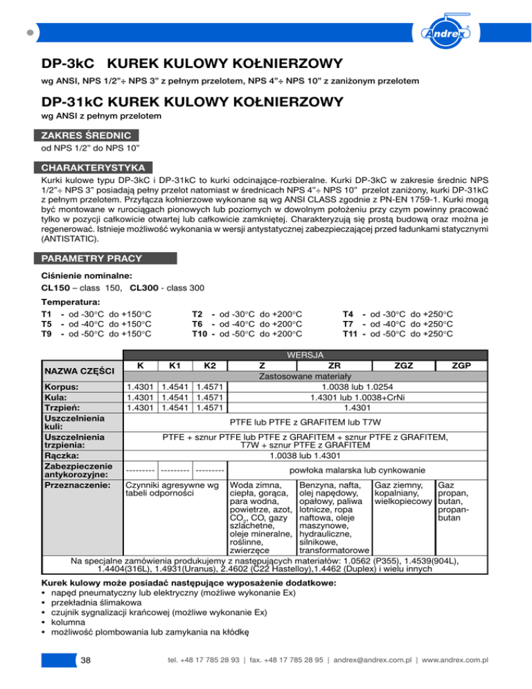 DP-3kC KUREK KULOWY KOŁNIERZOWY wg ANSI, NPS 1/2”÷ NPS 3” z pełnym przelotem, NPS 4”÷ NPS 10” z zaniżonym przelotem DP-31kC KUREK KULOWY KOŁNIERZOWY wg ANSI z pełnym przelotem ZAKRES ŚREDNIC od NPS 1/2” do NPS 10” CHARAKTERYSTYKA Kurki kulowe typu DP-3kC i DP-31kC to kurki odcinające-rozbieralne. Kurki DP-3kC w zakresie średnic NPS 1/2”÷ NPS 3” posiadają pełny przelot natomiast w średnicach NPS 4”÷ NPS 10” przelot zaniżony, kurki DP-31kC z pełnym przelotem. Przyłącza kołnierzowe wykonane są wg ANSI CLASS zgodnie z PN-EN 1759-1. Kurki mogą być montowane w rurociągach pionowych lub poziomych w dowolnym położeniu przy czym powinny pracować tylko w pozycji całkowicie otwartej lub całkowicie zamkniętej. Charakteryzują się prostą budową oraz można je regenerować. Istnieje możliwość wykonania w wersji antystatycznej zabezpieczającej przed ładunkami statycznymi (ANTISTATIC). PARAMETRY PRACY Ciśnienie nominalne: CL150 – class 150, CL300 - class 300 Temperatura: T1 - od -30 !!"#!$%&' T5 - od -40 !!"#!$%&' T9 -!!#"!(&' !!"#!$%&' NAZWA CZĘŚCI Korpus: Kula: Trzpień: Uszczelnienia kuli: Uszczelnienia trzpienia: Rączka: Zabezpieczenie antykorozyjne: Przeznaczenie: K !!!!!!!!!!!!!!!!!!!! T2 - od -30 T6 - od -40 !!!!!!!!!!!!!!!!!!!! T10 -!!#"!(&' K1 K2 1.4301 1.4541 1.4571 1.4301 1.4541 1.4571 1.4301 1.4541 1.4571 !!"#!$)'' !!"#!$)'' !!"#!$)'' !!!!!!!!!!!!!!!!!!!! T4 - od -30 T7 - od -40 T11 -!!#"!(&' !!"#!$)&' !!"#!$)&' !!"#!$)&' WERSJA Z ZR ZGZ Zastosowane materiały 1.0038 lub 1.0254 1.4301 lub 1.0038+CrNi 1.4301 ZGP PTFE lub PTFE z GRAFITEM lub T7W PTFE + sznur PTFE lub PTFE z GRAFITEM + sznur PTFE z GRAFITEM, T7W + sznur PTFE z GRAFITEM 1.0038 lub 1.4301 --------- --------- --------- powłoka malarska lub cynkowanie Gaz Gaz ziemny, Benzyna, nafta, Woda zimna, propan, kopalniany, ciepła, gorąca, olej napędowy, opałowy, paliwa wielkopiecowy butan, para wodna, propanpowietrze, azot, lotnicze, ropa butan CO2, CO, gazy naftowa, oleje maszynowe, szlachetne, oleje mineralne, hydrauliczne, silnikowe, roślinne, transformatorowe zwierzęce Na specjalne zamówienia produkujemy z następujących materiałów: 1.0562 (P355), 1.4539(904L), 1.4404(316L), 1.4931(Uranus), 2.4602 (C22 Hastelloy),1.4462 (Duplex) i wielu innych Czynniki agresywne wg tabeli odporności Kurek kulowy może posiadaćnastępujące wyposażenie dodatkowe: ³ napęd pneumatyczny lub elektryczny (możliwe wykonanie Ex) ³ przekładnia ślimakowa ³ czujnik sygnalizacji krańcowej (możliwe wykonanie Ex) ³ kolumna ³ możliwość plombowania lub zamykania na kłódkę 38 tel. +48 17 785 28 93 | fax. +48 17 785 28 95 | [email protected] | www.andrex.com.pl DP-3kC, DP-31kC L - Długość budowy według EN 558-1: 1995 szereg 1 DP-3kC NPS DN L D1 1/2 15 130 15 3/4 20 150 20 1 25 160 25 Masa(kg) 2,2 3,7 4,2 Dz Do dxn g Dz Do dxn g 89 60,3 98 69,8 1 1/4 1 1/2 32 40 180 200 32 40 5,5 7,5 2 50 230 50 2 1/2 65 290 62 3 80 310 75 4 100 350 85 5 125 400 105 6* 150 480 130 8** 200 600 162 10** 250 730 200 11,9 14,8 23,1 30 39 60 85 160 279 241,3 343 298,4 406 362 22,2x8 22,2x8 25,4x12 Kołnierze wg PN-EN 1759-1 Klasa 150 (Class 150) 108 117 127 152 178 190 229 254 79,4 88,9 98,4 120,6 139,7 152,4 190,5 215,9 15,9x4 15,9x4 15,9x4 15,9x4 15,9x4 19x4 19x4 19x4 19x8 22,2x8 12 14 95 66,7 117 82,6 16 18 19 21 24 26 27 28 Kołnierze wg PN-EN 1759-1 Klasa 300 (Class 300) 124 133 156 165 190 210 254 279 88,9 98,4 114,3 127 149,2 168,3 200 235 15,9x4 19x4 19x4 19x4 22,2x4 19x8 31 34 38 318 269,9 381 330,2 444 387,4 22,2x8 22,2x8 22,2x8 22,2x8 22,2x12 25,4x12 28,6x16 14,3 15,9 17,5 19 20,6 22,2 25,4 28,6 31,8 34,9 36,5 41,3 * - zaleca się zastosowanie przekładni ślimakowej ** - wyłącznie z przekładnią ślimakową DP-31kC NPS DN L D1 Masa(kg) 1/2 ÷ 3 TYP DP3kC 4 100 350 100 5 125 400 125 6* 150 480 150 8** 200 600 200 10** 250 730 253 30 39 60 85 160 Kołnierze wg PN-EN 1759-1 Klasa 150 (Class 150) Dz 229 254 279 343 406 Do 190,5 215,9 241,3 298,4 362 TYP DP3kC 19x8 22,2x8 22,2x8 22,2x8 25,4x12 dxn g 27 28 31 34 38 Kołnierze wg PN-EN 1759-1 Klasa 300 (Class 300) Dz 254 279 318 381 444 Do 200 235 269,9 330,2 387,4 TYP DP3kC 22,2x8 22,2x8 22,2x12 25,4x12 28,6x16 dxn g 31,8 34,9 36,5 41,3 47,6 * - zaleca się zastosowanie przekładni ślimakowej ** - wyłącznie z przekładnią ślimakową tel. +48 17 785 28 93 | fax. +48 17 785 28 95 | [email protected] | www.andrex.com.pl 39 47,6