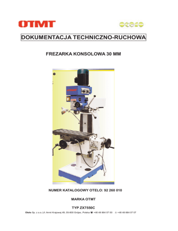 DOKUMENTACJA TECHNICZNO-RUCHOWA FREZARKA KONSOLOWA 30 MM NUMER KATALOGOWY OTELO: 92 260 010 MARKA OTMT TYP ZX7550C Otelo Sp. z o.o.,Ul. Armii Krajowej 49, 05-600 Grójec, Polska +48 48 664 07 00 +48 48 664 07 07 SPIS TREŚCI 1. Wskazówki bezpieczeństwa 2. Wymogi przepisów o ochronie środowiska dotyczące instalacji 3. Budowa 4. Obsługa 5. Charakterystyka techniczna 6. Napęd 7. System smarowania i chłodzenia 8. System elektryczny 9. Transport 10. Instalacja 11. ŁoŜyskowanie 12.Regulacje 13. Specyfikacja 14. Deklaracja zgodności CE 15. Karta gwarancyjna Otelo Sp. z o.o.,Ul. Armii Krajowej 49, 05-600 Grójec, Polska +48 48 664 07 00 +48 48 664 07 07 WSKAZÓWKI BEZPIECZEŃSTWA Zanim przystąpisz do uŜytkowania maszyny, przeczytaj uwaŜnie tę instrukcję, a następnie zachowaj ją do dalszego korzystania w razie potrzeby: 1. Zachowuj porządek i czystość w przestrzeni roboczej. - Przestrzeń i powierzchnie robocze przeładowane sprzyjają generowaniu wypadków. 2. Zbadaj i przeanalizuj otoczenie przestrzeni roboczej. - Nie wystawiaj narzędzi na działanie wilgoci. - Nie uŜytkuj narzędzi w miejscach zawilgoconych. - Miejsce pracy powinieneś dobrze oświetlić. - Nie uŜywaj obrabiarek w obecności płynów lub gazów łatwopalnych. 3. Unikaj zwarć elektrycznych. - Unikaj kontaktu ciała z powierzchnią uziemioną. - Upewnij się, Ŝe maszyna jest na pewno uziemiona. 4. Upewnij się, Ŝe operator jest pełnoletni oraz inne osoby pozostają w bezpiecznej odległości. - Nie pozwalaj osobom niepracującym przy maszynie, w szczególności osobom niepełnoletnim, aby dotykały obrabiarkę i uwaŜaj, aby trzymały się w bezpiecznej odległości od strefy pracy maszyny. 5. Uporządkuj i odłóŜ na bok narzędzia, którymi się na razie nie posługujesz. - Gdy nie są uŜywane, narzędzia powinny być odłoŜone w miejscu suchym pod kluczem i z dala od zasięgu dzieci. 6. Nie przeciąŜaj obrabiarki. - Będzie ona bardziej efektywna przy prędkości, do której została zaprojektowana. 7. UŜywaj dobrych narzędzi. - Nie przeciąŜaj drobnych narzędzi lub akcesoriów uŜywając ich do pracy przewidzianej dla narzędzi mocniejszych. - Nie uŜywaj obrabiarek do celów, do których nie zostały zaprojektowane. Na przykład, nie uŜywaj elektrycznej piły tarczowej do cięcia gałęzi lub kłód. 8. Ubranie robocze powinno być odpowiednio dostosowane. - Nie noś obszernych ubrań czy rękawic, ani biŜuterii, łatwych do wychwycenia przez ruchome części maszyny. - Zaleca się noszenie obuwia antypoślizgowego do pracy na zewnątrz. - Noś osłonę na głowie ujmującą włosy długie. 9. UŜywaj wyposaŜenia i sprzętu ochronnego. - Noś zawsze okulary ochronne / maski przewidziane specjalnie dla tej obrabiarki - UŜywaj masek ochronnych anty-pyłowych, jeŜeli operacje cięcia wywołują pylenie. Otelo Sp. z o.o.,Ul. Armii Krajowej 49, 05-600 Grójec, Polska +48 48 664 07 00 +48 48 664 07 07 10. Podłącz ekstraktor pyłowy. - JeŜeli uŜywane jest urządzenie do podłączenia ekstraktora oraz kolektora pyłowego, upewnij się, czy są one prawidłowo podłączone i czy są uŜytkowane w sposób właściwy. 11. Dbaj o prawidłowe ułoŜenie kabli. - Nie pociągaj za kabel dla wyłączenia z napięcia. Kabel powinien być chroniony przed wysokimi temperaturami, przed olejami oraz przed ostrymi krawędziami. 12. Zamocuj prawidłowo obrabiany przedmiot 13. Nie pochylaj się za bardzo ku przodowi. - Zachowuj równowagę ciała w kaŜdym momencie. 14. Utrzymuj narzędzia w naleŜytym stanie. - Przechowując je, pamiętaj, aby zostały przedtem naostrzone i wyczyszczone dla zapewnienia moŜliwie jak największej efektywności i pełnego bezpieczeństwa. - Postępuj ściśle według instrukcji dotyczących smarowania i wymiany akcesoriów. - Przeprowadzaj okresowe przeglądy inspekcyjne, a w przypadku stwierdzenia uszkodzeń, oddaj je do naprawy uprawnionym słuŜbom konserwacyjnym. - Przeprowadzaj regularne inspekcje przewodów, a w przypadku stwierdzenia uszkodzeń, dokonaj wymiany przewodów uszkodzonych. - Uchwyty utrzymuj w takim stanie, aby stale były suche, czyste i niezabrudzone olejami lub smarami. 15. Wyłączaj obrabiarkę - Kiedy urządzenia nie są uŜywane, przed kaŜdym zabiegiem konserwacyjnym, kiedy wymieniasz narzędzia, odetnij dopływ zasilania prądem elektrycznym 16. Wyciągnij wszystkie elementy nastawcze oraz klucze. - Przyzwyczajaj się do tego, Ŝeby zanim uruchomisz maszynę, sprawdzić, czy elementy nastawcze i klucze regulacyjne zostały z niej usunięte. 17. Zredukuj ryzyko rozruchu przedwczesnego. - Upewnij się, czy przełącznik znajduje się w pozycji STOP zanim podłączysz obrabiarkę. 18. UŜywaj przedłuŜaczy do celów pracy na zewnątrz. - JeŜeli maszyna jest uŜywana na zewnątrz, uŜywaj przedłuŜacza odpowiednio oznakowanego w tym celu. 19. Bądź czujny. - Przyglądaj się dobrze temu, co robisz, okaŜ zdrowy rozsądek i nie wprawiaj maszyny w ruch, jeŜeli jesteś zmęczony. 20. Sprawdzaj, czy są części uszkodzone. - Przed kaŜdorazowym przystąpieniem do uŜytkowania maszyny, sprawdź ją starannie, aby upewnić się, Ŝe będzie wykonywała właściwie to, do czego jest przeznaczona. - Sprawdzaj zamocowanie części ruchomych, gdy wystąpi zakleszczenie lub zatarcie, upewnij się, czy jakieś elementy nie są pęknięte, czy warunki montaŜowe oraz wszystkie pozostałe warunki zapobiegające zakłóceniu funkcjonowania maszyny zostały spełnione. Otelo Sp. z o.o.,Ul. Armii Krajowej 49, 05-600 Grójec, Polska +48 48 664 07 00 +48 48 664 07 07 Obudowa, osłona lub kaŜda inna część uszkodzona powinny być naprawiane lub wymieniane przez właściwy zakład naprawczy posiadający odpowiednie uprawnienia, chyba, Ŝe niniejsza instrukcja wskaŜe inne zalecenie. - Wymieniaj wadliwe wyłączniki tylko przy udziale wykwalifikowanego pracownika zakładu konserwacyjnego. - Nie usiłuj uŜytkować obrabiarki, jeŜeli wyłącznik nie uruchamia