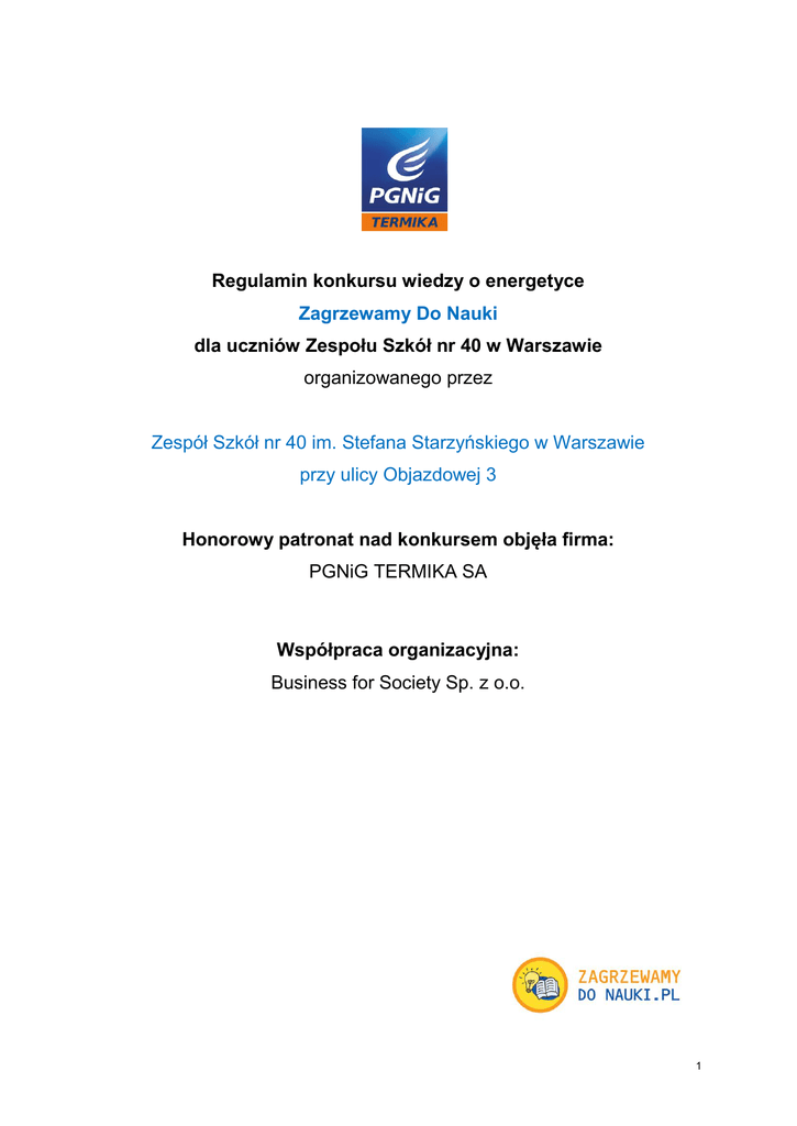 Regulamin konkursu wiedzy o energetyce Zagrzewamy Do Nauki dla uczniów Zespołu Szkół nr 40 w Warszawie organizowanego przez Zespół Szkół nr 40 im. Stefana Starzyńskiego w Warszawie przy ulicy Objazdowej 3 Honorowy patronat nad konkursem objęła firma: PGNiG TERMIKA SA Współpraca organizacyjna: Business for Society Sp. z o.o. 1 §1 Ustalenia ogólne 1. Konkurs wiedzy o energetyce „Zagrzewamy do nauki” (zwany dalej „Konkursem”) realizowany jest w ramach programu Zagrzewamy do nauki (www.zagrzewamydonauki.pl). 2. Konkurs organizowany jest w formie testu on-line, który zostanie udostępniony uczestnikom konkursu na platformie Librus w pracowni komputerowej Zespołu Szkół nr 40 im. Stefana Starzyńskiego w Warszawie. 3. Celem Konkursu jest propagowanie wiedzy o energetyce, ochronie środowiska naturalnego oraz firmie PGNiG TERMIKA SA. 4. Organizatorem Konkursu jest Zespół Szkół nr 40 im. Stefana Starzyńskiego w Warszawie, przy ul. Objazdowej 3. 5. Sponsorem nagród w Konkursie jest firma PGNiG TERMIKA SA przy ul. Modlińskiej 15 w Warszawie. 6. Podmiotem wspierającym organizację Konkursu jest firma Business for Society Sp. z o.o., przy ul. Górczewskiej 224/140, 01-460 w Warszawie. §2 Zasady uczestnictwa 1. W Konkursie mogą brać udział uczniowie klas 1 - 4 (technik energetyk, technik elektryk) z Zespołu Szkół nr 40 w Warszawie, objęci programem Zagrzewamy do nauki, organizowanym w ramach współpracy patronackiej firmy PGNiG TERMIKA SA. 2. Warunkiem uczestnictwa w Konkursie jest wypełnienie formularza stanowiącego załącznik nr 1 do niniejszego Regulaminu oraz dostarczenie wypełnionego dokumentu do Dyrektora Szkoły do dnia 15 kwietnia 2016 roku. 3. Szkoła zobowiązana jest do przekazania sponsorowi oraz podmiotowi wspierającemu organizację Konkursu listę uczestników konkursu do dnia 16 kwietnia 2016 r. Kompletna lista uczestników konkursu powinna zawierać: imię i nazwisko oraz klasę i specjalizację uczniów. §3 Przebieg konkursu 1. Konkurs odbędzie się dnia 20 kwietnia 2016 roku o godzinie 12.00. 2. Firma Business for Society Sp. z o.o. w dniach od 9 kwietnia br. do 19 kwietnia br. do północy udostępni uczestnikom konkursu materiały pomocnicze w formie prezentacji z zakresu energetyki. Materiały będą dostępne w na stronie www.zagrzewamydonauki.pl w panelu logowania, po wpisaniu loginu i hasła dedykowanego konkursowi. 3. Ustalone dane dostępu do materiałów zamieszczonych na stronie www.zagrzewamydonauki.pl to login: konkurs2, hasło: energetyka. 2 4. Ustalony login i hasło zostanie przekazany uczniom po wypełnieniu formularza uczestnictwa w konkursie. 5. Konkurs zostanie przeprowadzony w sali komputerowej Zespołu Szkół nr 40 w Warszawie. 6. Każdemu uczestnikowi Konkursu zostanie przydzielony jednorazowy dostęp do testu on-line, zamieszczonego na platformie internetowej. 7. Maksymalny czas na rozwiązanie testu on-line wynosi 15 minut. 8. Test składać się będzie z 20 pytań jednokrotnego wyboru. 9. Za każdą poprawną odpowiedź na pytanie zawarte w teście on-line, uczestnik otrzyma jeden punkt. 10. Uczestnik Konkursu może zdobyć maksymalnie 20 punktów. 11. Test on-line dotyczyć będzie wiedzy o energetyce, ochronie środowiska naturalnego oraz firmie PGNiG TERMIKA SA. 12. Szkoła zobowiązana jest do dostarczenia wyników testu on-line do dnia 21 kwietnia 2016 r. sponsorowi oraz podmiotowi wspierającemu organizację Konkursu. 13. Wyniki testu on-line są podstawą do wyłonienia przez powołaną Komisję Konkursową trójki laureatów z najwyższymi wynikami testu. 14. W przypadku otrzymania równej ilości punktów wśród osób z trzema najwyższymi wynikami, zostaną przeprowadzone dodatkowe eliminacje w postaci testu on-line w terminie do 5 dni od ogłoszenia wyników Konkursu. 15. Komisja Konkursowa, oprócz wyłonionych trzech laureatów, w sytuacjach uzasadnionych zastrzega sobie możliwość wyróżnienia uczestników z kolejno największą ilością uzyskanych punktów z testu on-line, w postaci drobnych nagród rzeczowych. 16. W skład Komisji Konkursowej powołanej przez Organizatora wchodzą: Przedstawiciele firmy PGNiG TERMIKA SA, Dyrektor Zespołu Szkół nr 40 im. Stefana Starzyńskiego w Warszawie, Przedstawiciel Business for Society sp. z o.o. 17. Decyzja Komisji Konkursowej jest ostateczna i nie przysługuje od niej odwołanie. §4 Nagrody 1. Laureaci Konkursu otrzymają nagrody rzeczowe, ufundowane przez firmę PGNiG TERMIKA SA: za zajęcie I miejsca – Tablet Manta MID7803 za zajęcie II miejsca – Słuchawki Philips SHB4000WT/10 za zajęcie III miejsca – Powerbank Whitenergy 10118 4000 mAh 2. W przypadku wyróżnienia osób dodatkowo nagrodzonych, sponsor zastrzega sobie prawo wyboru nagród rzeczowych. 3 3. Nagrody zostaną przekazane laureatom i osobom wyróżnionym podczas uroczystości zakończenia roku szkolnego klas maturalnych. §5 Postanowienia końcowe 1. Po rozstrzygnięciu Konkursu i przekazaniu nagród rzeczowych, tj. po uroczystości zakończenia roku szkolnego klas maturalnych, przekazane przez uczestników Konkursu dane osobowe zostaną usunięte, za wyjątkiem danych osobowych trójki laureatów oraz osób wyróżnionych, które zostaną zachowane dla celów podatkowych i archiwalnych. 2. W sprawach nieuregulowanych niniejszym Regulaminem stosuje się odpowiednie przepisy prawa polskiego, w szczególności Kodeksu Cywilnego. 4 Załącznik nr 1 do Regulaminu konkursu wiedzy o energetyce „Zagrzewamy do nauki” Informacje o uczestniku konkursu wiedzy o energetyce „Zagrzewamy do nauki” Należy wypełnić wszystkie wolne pola Nazwa szkoły, w której organizowany jest Konkurs wiedzy o energetyce Imię Nazwisko Klasa i specjalizacja (zawód) Data urodzenia E-mail Telefon kontaktowy Dane Rodzica/opiekuna prawnego* *dotyczy osób niepełnoletnich Imię Nazwisko Telefon kontaktowy W związku z art. 23 ust. 1 ustawy z dnia 29 sierpnia 1997 roku o ochronie danych osobowych