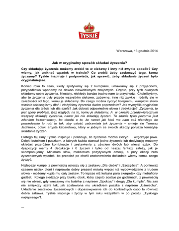 Warszawa, 16 grudnia 2014 Jak w oryginalny sposób składać życzenia? Czy składając życzenia możemy zrobić to w ciekawy i inny niż zwykle sposób? Czy wiemy, jak uniknąć wpadek w trakcie? Co zrobić żeby zaskoczyć tego, komu życzymy? Tyskie inspiruje i podpowiada, jak sprawić, żeby składanie życzeń było oryginalniejsze. Koniec roku to czas, kiedy spotykamy się z kumplami, umawiamy się z przyjaciółmi, przypadkowo wpadamy na dawno niewidzianych znajomych. Często, przy tych okazjach składamy sobie życzenia. Niestety, niekiedy bardzo trudno nam to przychodzi. Chcielibyśmy, aby te życzenia były przede wszystkim ciekawe, zabawne, inne niż zwykle i różniły się w zależności od tego, komu je składamy. Bo czego można życzyć kolejnemu kumplowi skoro właśnie uścisnęliśmy dłoń i złożyliśmy życzenia dwóm poprzednim? Jak wymyślić oryginalne życzenia dla teścia lub dla szefa? Jak dobrać odpowiednie słowa i dedykacje? „Życzenia, to jest spory problem. Bez względu na to, komu je składamy. A w okresie przedświątecznym wszyscy składają życzenia, nawet jak nie składają życzeń. To zdanie tylko pozornie jest zdaniem bezsensowny, bo chodzi o to, że nawet jak ktoś ma nam coś niemiłego do powiedzenia to robi to tak, aby całość zabrzmiała jak życzenia – śmieje się Tomasz Jachimek, polski artysta kabaretowy, który w jednym ze swoich skeczy porusza tematykę składania życzeń. Dlatego tej zimy Tyskie inspiruje i pokazuje, że życzenia można złożyć … wręczając piwo. Dzięki butelkom i puszkom, z których każda stanowi jedno życzenie lub dedykację możemy układać przeróżne kombinacje i zestawienia z użyciem dwóch lub więcej sztuk. Do dyspozycji mamy 4 dedykacje i 6 życzeń i tylko od naszej fantazji zależy, jak je skomponujemy. Minimum słów, maksimum pozytywnych emocji, a przy okazji zero życzeniowych wpadek, bo przecież po chwili zastanowienia dokładnie wiemy komu, czego życzyć. Najlepszy kumpel z pewnością ucieszy się z zestawu „Dla ciebie” i „Szczęścia”. A ponieważ czasem uścisk dłoni i naprawdę dobry prezent mówią więcej niż wypowiedziane z trudem słowa - możemy kupić mu cały zestaw. To lepsze niż kolejna para skarpetek czy nietrafiony gadżet. Kolega siedzący przy biurku obok, który często zostaje po godzinach, z pewnością się nie obrazi, gdy wręczymy mu butelkę z napisem „Spokoju” i drugą „Dla kumpla”. Nic zaś nie zmiękczy szefa tak, jak zostawiona mu ukradkiem puszka z napisem „Uśmiechu”. Układanie zestawów życzeniowych i dopasowywanie ich do konkretnych osób to również dobra zabawa. Tyskie inspiruje i życzy w tym roku wszystkim w po prostu: „Tyskiego najlepszego”!. *** Informacje dodatkowe: Tyskie Tyskie należy do czołówki polskich piw pod względem zarówno wielkości sprzedaży krajowej, eksportu, jak i wygenerowanych wpływów. Tyskie zostało wielokrotnie uhonorowane najbardziej prestiżowymi nagrodami branży piwnej na całym świecie - w 2011 roku m.in. Srebrnym Medalem podczas Międzynarodowego Konkursu Branży Piwowarskiej (The Brewing Industry International Awards), oraz Złotym podczas Monde Selection 2011 w Brukseli. Tyskie zdobyło 1. miejsce wśród napojów alkoholowych w prestiżowym „Rankingu Polskich Marek 2011” ogłoszonym przez dziennik Rzeczpospolita. Tyskie jest także sponsorem Polskiej Reprezentacji Olimpijskiej oraz kilkudziesięciu drużyn z różnych dyscyplin sportu. Od lat wspiera polskich kibiców i sportowców. W 2006 oraz 2008 roku zainicjowało akcje wywieszania flag kibica. Dzięki nim cały kraj pokrył się barwami narodowymi, a fani dopingowali piłkarzy w czasie ważnych wydarzeń sportowych. W 2012 roku odbyła się kampania 5 Stadion łącząca fanów piłki we wspólnym kibicowaniu Tyskie działa na rzecz kształtowania kultury piwnej w Polsce i wprowadza innowacje w różnych kanałach sprzedaży. W 2012 roku Tyskie wprowadziło w lokalach na południu Polski nowość w gastronomii – tanki, dzięki którym w wybranych lokalach można było napić się świeżego, niepasteryzowanego piwa Tyskie prosto z browaru. W 2013 roku, Tyskiego z tanka można było napić się we wszystkich największych polskich miastach oraz na wybranych imprezach na terenie całego kraju. Również w 2012 roku wprowadzono nowy wariant Tyskiego – Tyskie Klasyczne. Dodatkowych informacji udzielają: Ewa Kawiecka Consultant Q&A Communications [email protected] Tel. kom.: +48 69 44 75 833 Aleksandra Zarychta-Kuzalska Kierownik ds. PR marek KOMPANIA PIWOWARSKA SA [email protected] Tel. kom.: +48 661 955 024