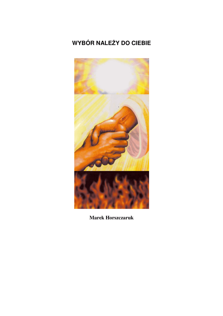 WYBÓR NALEŻY DO CIEBIE Marek Horszczaruk Rozdział 1 Życie pozbawione szczęścia Żyjąc w dzisiejszym świecie trudno nie zauważyć zła i zepsucia, które ogarnia wszystkie narody. Zło, które uderza w życie ludzkie, nie ma litości i zbiera coraz większy owoc. Morderstwa, samobójstwa, rozbite rodziny, miliony rozwodów (niewierność małżeńska), dzieci cierpiące z powodu odrzucenia, zranienia i braku miłości, niemoralność, uzależnienia: alkoholizm, narkomania, pornografia, świadczą o tym, że człowiek został schwytany w pułapkę grzechu, w sieć zła, z której nie jest w stanie sam się uwolnić. Przyczyna jest jedna - ludzie odrzucili Boga. Bóg, który widzi wszystko, co dzieje się na ziemi, mówi o tej przyczynie i powszechnym zepsuciu w Swoim Słowie (Piśmie Świętym), w Księdze Ozeasza 4:1-3 „…Pan ma powód do skargi na mieszkańców kraju: Nie ma w kraju ani wierności, ani miłości, ani poznania Boga. Jest natomiast krzywoprzysięstwo, kłamstwo, zabójstwo, kradzież, cudzołóstwo, rabunek, morderstwa idą za morderstwami. Dlatego kraj okrywa się żałobą...” Czyż nie jest prawdą to, o czym Bóg dzisiaj mówi do całej ludzkości? Dokładnie tak! Dzisiaj żyjemy w takich czasach, w atmosferze żałoby. Oczywiście, zdajemy sobie sprawę z tego, że żałoba to nic przyjemnego. I to, co się z nią wiąże, to ból, smutek, rozpacz i cierpienie. To tworzy atmosferę, która dzisiaj ogarnia narody. Tak naprawdę, to Bóg mówi, że grzeszne uczynki i życie bez Boga czynią człowieka martwym, umarłym. I takim widzi go Bóg, o czym mówi Jego Słowo w Apokalipsie św. Jana 3:1 „…Znam uczynki twoje: Masz imię, że żyjesz, a jesteś umarły”. Dokąd ludzkość dzisiaj zmierza?! Zatrzymaj się! Zastanów się nad swoim życiem. Patrząc na ludzi, na to jak żyją i postępują, widać, że nie bardzo się tym przejmują. Nie biorą tego do serca, ale żyją według zasady: jedzmy, pijmy, bawmy się, zaspokajając własne żądze i pragnienia. Człowiek żyjąc bez Boga idzie niewłaściwą drogą, często podejmuje niewłaściwe decyzje i popełnia wiele błędów. Niestety, zawsze z konsekwencjami. Zranienie, odrzucenie, rozczarowanie, brak poczucia wartości i akceptacji, brak zaufania, sensu życia oraz radości i pokoju - to owoce niewłaściwych decyzji i wpływ skażonego grzechem świata. Tak naprawdę w życiu bez Boga człowiek nie znajduje prawdziwego celu, ani spełnienia. Dzieje się tak dlatego że człowiek ma duchową potrzebę, której nie zaspokoją żadne rzeczy (dobra) tego świata. Bez Boga człowiek staje się samowolny, zagubiony, sfrustrowany i skoncentrowany na sobie. Trapi go pustka duchowa, psychiczna i fizyczna. Dlatego, w celu zaspokojenia tej pustki, ludzie szukają rozwiązania w bogactwie, alkoholu, narkotykach, rozwiązłości seksualnej, zabawach rozrywkowych, a także w magii, czarach, jodze, medytacjach i różnego rodzaju wróżbach. Niestety, te wszystkie zakazane przez Boga praktyki, grzeszne pragnienia i pożądliwości, nie są w stanie uwolnić człowieka z problemu, który trapi go w duszy. Te rzeczy nie tylko nie rozwiążą problemu pustki w sercu człowieka, ale wniosą do niego jeszcze większe zniszczenie, niepokój i ból, a pragnienie w dalszym ciągu nie będzie zaspokojone. Życie bez Boga, to życie pozbawione prawdziwego szczęścia. Wiem o tym z własnego doświadczenia. Miałem pieniądze, robiłem to, na co miałem ochotę, powinienem więc być szczęśliwym człowiekiem, ale nie byłem. Nie miałem prawdziwej radości, szczęścia i pokoju, które pochodzą od Boga. Czułem się samotny, zagubiony i rozczarowany życiem, byłem schwytany w pułapkę zła, z którego nie mogłem sam się wydostać. Teraz wiem, że przyczyną tego było życie bez Boga. Żyłem życiem skoncentrowanym na sobie, szedłem własną drogą grzesznych pragnień i pożądliwości; zdążałem prosto do piekła. Dzięki Bogu, że pewnego dnia w moim życiu wszystko się zmieniło i może też zmienić się w Twoim. Bóg Cię kocha i chce dla Ciebie tego, co najlepsze. Rozdział 2 Bądź zawsze gotowy! Chciałbym, abyś usłyszał o pewnej historii, która miała miejsce wiele lat temu w Londynie. Londyn, 3 października 1952 r. Na dworcu podmiejskim Harrow stoi poranny pociąg, przepełniony ludźmi. Zbliża się czas odjazdu. Nagle z wielką szybkością wjeżdża pociąg pospieszny ze Szkocji, prosto na ten odjeżdżający skład. Jak pudełka zapałek wsuwają się wagony jeden do drugiego. Chwilę później trzeci pociąg pospieszny z Londynu z pełną szybkością wjeżdża na resztki porozrzucanych po szynach wagonów i ciał ludzkich. Ponad 100 osób, które były w drodze do pracy, już tam nie dojechało. Po co te wiadomości? Czy oznacza to, że masz już nigdy nie jeździć pociągiem czy autobusem, lub też płynąć statkiem, bądź lecieć samolotem? Gdy myślimy o tych tysiącach zabitych, którzy giną rokrocznie w każdym kraju, można by i tak sądzić. Ale gdzie jest bezpieczniej? Nigdzie -wypadki, choroby mogą Cię spotkać też w domu, mogą dosięgnąć starych i młodych. Po tej wstrząsającej katastrofie w Londynie, można było zobaczyć w gazetach zdjęcia pokazujące tę wielką tragedię. Na jednym z nich był widoczny zegar. Był to zegar na peronie, gdzie stał rozbity pociąg. Wskazówki wskazywały godzinę 8 i 19 minut, był to dokładnie moment zderzenia pociągów. Obok zegara widniała jeszcze jedna rzecz, warta uwagi - wisiał tam plakat ze słowami: „PRZYGOTUJ SIĘ NA SPOTKANIE TWOJEGO BOGA!” (Księga Amosa 4:12). Jak mało było tych, którzy czytali ten plakat, a jeszcze mniej takich, którzy o tym myśleli! Ale nagle te słowa przemówiły i wielu w tym momencie musiało spotkać się z Bogiem. Ich zegar życia się zatrzymał. Obyś Ty obok tych słów nie przeszedł obojętnie! Słowa te, które Bóg wypowiedział wiele lat temu, jeszcze dziś przemawiaj