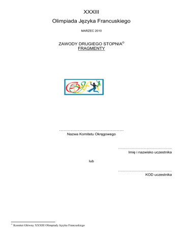 XXXIII Olimpiada Języka Francuskiego MARZEC 2010 ZAWODY DRUGIEGO STOPNIA© FRAGMENTY ……………………………………… Nazwa Komitetu Okręgowego …………………………………….. Imię i nazwisko uczestnika lub …………………………………….. KOD uczestnika © Komitet Główny XXXIII Olimpiady Języka Francuskiego OLIMPIADA JĘZYKA FRANCUSKIEGO 2009/2010 Etap okręgowy _____ /25 punktów Compréhension orale Vous allez entendre deux fois un enregistrement sonore de 4 minutes environ. Répondez aux questions en cochant la bonne réponse ou en écrivant l’information demandée. Lisez maintenant les questions. 1) Indiquez si chacune de ces propositions est vraie (V) ou fausse (F) ______/8p. Carla Bruni-Sarkozy : VRAI a b c d e f g h FAUX veut lutter en faveur de l’illettrisme s’intéresse surtout aux grandes villes désire mener son action en France en priorité refuse l’idée que sa fondation opère à l’étranger est prête à coopérer avec d’autres associations aimerait faire de son action une action politique est convaincue que la fondation lui prendra tout son temps prévoit, dans le cadre de son action, des visites dans tout le pays 2) Choisissez la ou les bonne(s) proposition(s) ______/7p. 1. Carla Bruni-Sarkozy souhaite que la fondation profite : □ de son rôle de première dame de France □ du pouvoir de son mari, Nicolas Sarkozy □ du soutien financier des ministères de l’éducation et de la culture □ des nombreux dons qu’elle espère recevoir 2. Afin de développer sa fondation, Carla Bruni-Sarkozy dit souhaiter travailler avec : □ le président □ des ministres □ des enseignants □ des éducateurs □ des mannequins □ des chanteuses 3. Depuis qu’elle est mariée, l’image de Carla Bruni: □ a pris de l’importance □ a perdu de l’importance □ a gardé la même importance qu’avant 4. D’après Carla Bruni-Sarkozy, par rapport aux générations précédentes, les jeunes d’aujourd’hui sont : □ plus sereins □ plus sérieux □ plus inquiets □ plus ambitieux © Komitet Główny XXXIII Olimpiady Języka Francuskiego 2 3) OLIMPIADA JĘZYKA FRANCUSKIEGO 2009/2010 Etap okręgowy Répondez aux questions suivantes ______/10p. 1. Comment s’appelle la fondation dont parle Carla Bruni-Sarkozy ? ........................................................................................................ 2. Qu’est-ce que Carla Bruni-Sarkozy est prête à offrir ? a) …............................................................................ b) …............................................................................ 3. Quels sont les gens que la fondation de Carla Bruni-Sarkozy aimerait valoriser ? a) …....................................................................................................................... b) …....................................................................................................................... 4. Citez le sentiment : c) qui caractérise le climat actuel de la société : .......................................................................................................................... d) que n'exprime pas Carla Bruni-Sarkozy .......................................................................................................................... 5. Qu’est-ce qui distingue un travail à objectif humanitaire d’un travail politique ? e) ........................................................................................................................ f) ........................................................................................................................ © Komitet Główny XXXIII Olimpiady Języka Francuskiego 3