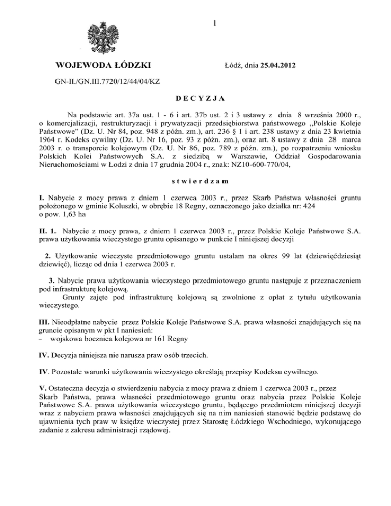 1 GN-II./GN.III.7720/12/44/04/KZ WOJEWODA ŁÓDZKI Łódź, dnia 25.04.2012 GN-II./GN.III.7720/12/44/04/KZ DECYZJA Na podstawie art. 37a ust. 1 - 6 i art. 37b ust. 2 i 3 ustawy z dnia 8 września 2000 r., o komercjalizacji, restrukturyzacji i prywatyzacji przedsiębiorstwa państwowego „Polskie Koleje Państwowe” (Dz. U. Nr 84, poz. 948 z późn. zm.), art. 236 § 1 i art. 238 ustawy z dnia 23 kwietnia 1964 r. Kodeks cywilny (Dz. U. Nr 16, poz. 93 z późn. zm.), oraz art. 8 ustawy z dnia 28 marca 2003 r. o transporcie kolejowym (Dz. U. Nr 86, poz. 789 z późn. zm.), po rozpatrzeniu wniosku Polskich Kolei Państwowych S.A. z siedzibą w Warszawie, Oddział Gospodarowania Nieruchomościami w Łodzi z dnia 17 grudnia 2004 r., znak: NZ10-600-770/04, stwierdzam I. Nabycie z mocy prawa z dniem 1 czerwca 2003 r., przez Skarb Państwa własności gruntu położonego w gminie Koluszki, w obrębie 18 Regny, oznaczonego jako działka nr: 424 o pow. 1,63 ha II. 1. Nabycie z mocy prawa, z dniem 1 czerwca 2003 r., przez Polskie Koleje Państwowe S.A. prawa użytkowania wieczystego gruntu opisanego w punkcie I niniejszej decyzji 2. Użytkowanie wieczyste przedmiotowego gruntu ustalam na okres 99 lat (dziewięćdziesiąt dziewięć), licząc od dnia 1 czerwca 2003 r. 3. Nabycie prawa użytkowania wieczystego przedmiotowego gruntu następuje z przeznaczeniem pod infrastrukturę kolejową. Grunty zajęte pod infrastrukturę kolejową są zwolnione z opłat z tytułu użytkowania wieczystego. III. Nieodpłatne nabycie przez Polskie Koleje Państwowe S.A. prawa własności znajdujących się na gruncie opisanym w pkt I naniesień: − wojskowa bocznica kolejowa nr 161 Regny IV. Decyzja niniejsza nie narusza praw osób trzecich. IV. Pozostałe warunki użytkowania wieczystego określają przepisy Kodeksu cywilnego. V. Ostateczna decyzja o stwierdzeniu nabycia z mocy prawa z dniem 1 czerwca 2003 r., przez Skarb Państwa, prawa własności przedmiotowego gruntu oraz nabycia przez Polskie Koleje Państwowe S.A. prawa użytkowania wieczystego gruntu, będącego przedmiotem niniejszej decyzji wraz z nabyciem prawa własności znajdujących się na nim naniesień stanowić będzie podstawę do ujawnienia tych praw w księdze wieczystej przez Starostę Łódzkiego Wschodniego, wykonującego zadanie z zakresu administracji rządowej. GN-II./GN.III.7720/12/44/04/KZ 2 UZASADNIENIE „Polskie Koleje Państwowe” Spółka Akcyjna z siedzibą w Warszawie, reprezentowana przez Oddział Gospodarowania Nieruchomościami w Łodzi, wnioskiem z dnia 17 grudnia 2004 r., znak: NZ10-600-770/04, wystąpiła do Wojewody Łódzkiego o stwierdzenie nabycia na podstawie art. 37a ustawy z dnia 8 września 2000 r., o komercjalizacji, restrukturyzacji i prywatyzacji przedsiębiorstwa państwowego Polskie Koleje Państwowe” (Dz. U. Nr 84, poz. 948 z późn. zm.), z dniem 1 czerwca 2003 r., z mocy prawa przez: - Skarb Państwa prawa własności gruntu położonego w gminie Koluszki, w obrębie 18 Regny, oznaczonego jako działka nr: 424 o pow. 1,63 ha - „Polskie Koleje Państwowe” S.A. w Warszawie prawa użytkowania wieczystego przedmiotowego gruntu wraz z nieodpłatnym nabyciem prawa własności budynków i urządzeń znajdujących się na tym gruncie. Postanowieniem z dnia 26 stycznia 2005 r., znak: SP.V.7720/12/44/AC/04, Wojewoda Łódzki zawiesił z urzędu przedmiotowe postępowanie do czasu ostatecznego rozstrzygnięcia przez sąd sprawy o stwierdzenie nabycia z mocy prawa przez Skarb Państwa własności przedmiotowej nieruchomości w drodze zasiedzenia. Na powyższe postanowienie Polskie Koleje Państwowe S.A., pismem z dnia 4 lutego 2005 r., znak: NZ5A-600-92/05, wniosły do Ministra Infrastruktury zażalenie, w wyniku rozpatrzenia którego, organ II instancji postanowieniem z dnia 4 marca 2005 r. znak: BO2e-784-Z-146/05, utrzymał zaskarżone postanowienie w mocy. Wnioskiem z dnia 24 marca 2006 r. znak: N8-600-163/06 uzupełnionym pismem z dnia 21 czerwca 2006 r. znak: N8-600-286/06 „Polskie Koleje Państwowe” S.A. Oddział Gospodarowania Nieruchomościami w Łodzi wystąpiły o podjęcie między innymi zawieszonego postępowania prowadzonego na podstawie art. 37a ustawy z dnia 8 września 2000 r. o komercjalizacji, restrukturyzacji i prywatyzacji przedsiębiorstwa państwowego „Polskie Koleje Państwowe” w sprawie stwierdzenia nabycia z mocy prawa z dniem 1 czerwca 2003 r. przez: - Skarb Państwa prawa własności gruntu położonego w gminie Koluszki, w obrębie 18 Regny, oznaczonego jako działka nr: 424 o pow. 1,63 ha, - „Polskie Koleje Państwowe” S.A. prawa użytkowania wieczystego ww. gruntu oraz prawa własności budynków, innych urządzeń i lokali znajdujących się na tym gruncie. Po rozpatrzeniu ww. wniosku Wojewoda Łódzki postanowieniem z dnia 12 września 2006 r. znak: SP.V.7720/12/44/MNi/04 odmówił podjęcia zawieszonego z urzędu przedmiotowego postępowania. Następnie pismem z dnia 9 grudnia 2008 r., znak: N8a-600-442/08, Polskie Koleje Państwowe S.A. wystąpiły o rozpatrywanie przedmiotowej sprawy na podstawie art. 37a oraz 37b ust. 2 ustawy o komercjalizacji (...), znowelizowanej ustawą z dnia 24 października 2008 r. o zmianie ustawy o komercjalizacji, restrukturyzacji i prywatyzacji przedsiębiorstwa państwowego "Polskie Koleje Państwowe" oraz ustawy o transporcie kolejowym (Dz. U. z 2008 r., Nr 206, poz. 1289). Pismem z dnia 18 lutego 2009 r. znak: BG i GN-720/1192/09 Starosta Łódzki Wschodni, wykonujący zadanie z zakresu administracji rządowej poinformował, że „ (...) nie został złożony wniosek o zasiedzenie dla nieruchomości położonej w obrębie Regny, gmina Koluszki, oznaczonej w ewidencji gruntów jako działka nr 424 o powierzchni 1,63 ha. PKP S.A. Oddział Gospodarowania Nieruchomościami w Łodzi nie przedstawił żadnych dokumentów ani świadków mogących potwierdzić fakt samoistnego władania przedmiotową nieruchomością. (...) Zebrane informacj