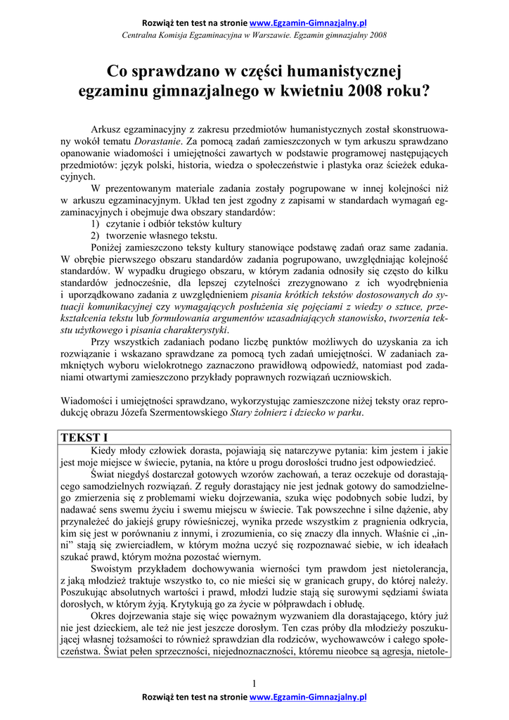 Rozwiąż ten test na stronie www.Egzamin-Gimnazjalny.pl Centralna Komisja Egzaminacyjna w Warszawie. Egzamin gimnazjalny 2008 Co sprawdzano w części humanistycznej egzaminu gimnazjalnego w kwietniu 2008 roku? Arkusz egzaminacyjny z zakresu przedmiotów humanistycznych został skonstruowany wokół tematu Dorastanie. Za pomocą zadań zamieszczonych w tym arkuszu sprawdzano opanowanie wiadomości i umiejętności zawartych w podstawie programowej następujących przedmiotów: język polski, historia, wiedza o społeczeństwie i plastyka oraz ścieżek edukacyjnych. W prezentowanym materiale zadania zostały pogrupowane w innej kolejności niż w arkuszu egzaminacyjnym. Układ ten jest zgodny z zapisami w standardach wymagań egzaminacyjnych i obejmuje dwa obszary standardów: 1) czytanie i odbiór tekstów kultury 2) tworzenie własnego tekstu. Poniżej zamieszczono teksty kultury stanowiące podstawę zadań oraz same zadania. W obrębie pierwszego obszaru standardów zadania pogrupowano, uwzględniając kolejność standardów. W wypadku drugiego obszaru, w którym zadania odnosiły się często do kilku standardów jednocześnie, dla lepszej czytelności zrezygnowano z ich wyodrębnienia i uporządkowano zadania z uwzględnieniem pisania krótkich tekstów dostosowanych do sytuacji komunikacyjnej czy wymagających posłużenia się pojęciami z wiedzy o sztuce, przekształcenia tekstu lub formułowania argumentów uzasadniających stanowisko, tworzenia tekstu użytkowego i pisania charakterystyki. Przy wszystkich zadaniach podano liczbę punktów możliwych do uzyskania za ich rozwiązanie i wskazano sprawdzane za pomocą tych zadań umiejętności. W zadaniach zamkniętych wyboru wielokrotnego zaznaczono prawidłową odpowiedź, natomiast pod zadaniami otwartymi zamieszczono przykłady poprawnych rozwiązań uczniowskich. Wiadomości i umiejętności sprawdzano, wykorzystując zamieszczone niżej teksty oraz reprodukcję obrazu Józefa Szermentowskiego Stary żołnierz i dziecko w parku. TEKST I Kiedy młody człowiek dorasta, pojawiają się natarczywe pytania: kim jestem i jakie jest moje miejsce w świecie, pytania, na które u progu dorosłości trudno jest odpowiedzieć. Świat niegdyś dostarczał gotowych wzorów zachowań, a teraz oczekuje od dorastającego samodzielnych rozwiązań. Z reguły dorastający nie jest jednak gotowy do samodzielnego zmierzenia się z problemami wieku dojrzewania, szuka więc podobnych sobie ludzi, by nadawać sens swemu życiu i swemu miejscu w świecie. Tak powszechne i silne dążenie, aby przynależeć do jakiejś grupy rówieśniczej, wynika przede wszystkim z pragnienia odkrycia, kim się jest w porównaniu z innymi, i zrozumienia, co się znaczy dla innych. Właśnie ci „inni” stają się zwierciadłem, w którym można uczyć się rozpoznawać siebie, w ich ideałach szukać prawd, którym można pozostać wiernym. Swoistym przykładem dochowywania wierności tym prawdom jest nietolerancja, z jaką młodzież traktuje wszystko to, co nie mieści się w granicach grupy, do której należy. Poszukując absolutnych wartości i prawd, młodzi ludzie stają się surowymi sędziami świata dorosłych, w którym żyją. Krytykują go za życie w półprawdach i obłudę. Okres dojrzewania staje się więc poważnym wyzwaniem dla dorastającego, który już nie jest dzieckiem, ale też nie jest jeszcze dorosłym. Ten czas próby dla młodzieży poszukującej własnej tożsamości to również sprawdzian dla rodziców, wychowawców i całego społeczeństwa. Świat pełen sprzeczności, niejednoznaczności, któremu nieobce są agresja, nietole1 Rozwiąż ten test na stronie www.Egzamin-Gimnazjalny.pl Rozwiąż ten test na stronie www.Egzamin-Gimnazjalny.pl Centralna Komisja Egzaminacyjna w Warszawie. Egzamin gimnazjalny 2008 rancja i rasizm, niewątpliwie utrudnia dorastającemu człowiekowi, poszukującemu jasnych i jednoznacznych wzorców, wybór swego miejsca w życiu. Wydaje się jednak, że zrozumienie przez dorosłych problemów młodzieży, cierpliwość dla jej zmagań w walce o siebie pozwalają młodym ludziom na pozytywne rozwiązanie kryzysu okresu dojrzewania. Sprawiają, że może to być okres szansy, a nie tylko zagrożenia. Na podstawie: Mariusz Ozon, Czas między dzieckiem a dorosłym, [w:] „Edukacja i Dialog” 2003, nr 3. TEKST II Tymczasem Bolesław1 [Krzywousty], Marsowe2 chłopię, wzrastał w siły i lata i nie oddawał się próżnemu zbytkowi, jak to zwykli czynić chłopcy w jego wieku, lecz gdziekolwiek zasłyszał, że wróg grabi, tam natychmiast spieszył z rówieśnymi młodzieńcami, a częstokroć potajemnie z nieliczną garstką zapędzał się do kraju nieprzyjacielskiego i spaliwszy wsie, przyprowadzał jeńców i łupy. Już bowiem wiekiem chłopię, lecz zacnością starzec, dzierżył3 księstwo wrocławskie, a jeszcze przecież nie uzyskał godności rycerza. A że w myśl ogólnych nadziei zapowiadał się na młodzieńca wybitnych zdolności i już widoczne były w nim zadatki wielkiej sławy rycerskiej, kochali go wszyscy możni, ponieważ dopatrywali się w nim kogoś wielkiego w przyszłości. Tenże chłopczyna, z Marsowego zrodzon rodu, pewnego razu wyruszył na Pomorze, gdzie już wyraźniej objawił sławę swojego imienia. Albowiem takimi siłami obległ gród Międzyrzecze i z taką gwałtownością doń szturmował, że w kilku dniach zmusił jego załogę do poddania się. [...] Wróciwszy stamtąd, niezmordowany chłopiec dał nieco wytchnienia rycerzom, lecz zaraz powiódł ich tamże z powrotem. A pragnąc ujarzmić kraj barbarzyńców, nie dbał o to, by najpierw łupy zbierać i wzniecać pożary, lecz przemyśliwał nad zajęciem ich warowni i miast lub nad ich zniszczeniem. [...] Uprowadził też stamtąd mnogie łupy i jeńców, a z wojownikami postąpił wedle prawa wojennego. [...] Władysław [Herman] przeto widząc, że chłopiec dochodził już lat męskich i że zajaśnia