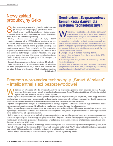 NOWOŒCI Nowy zakład produkcyjny Seko S eko, producent przetworów rybnych, na którego akcje ruszyły 28 lutego zapisy, przeznaczy około 11 mln zł na nowy zakład produkcyjny. Budowa ruszy w czerwcu i potrwa rok – poinformował prezes Seko Kazimierz Kustra na konferencji prasowej. Dodał, że obecne moce produkcyjne Seko będą w 2007 r. wykorzystywane już w 100% i dlatego konieczny jest nowy zakład, który zwiększy moce produkcyjne firmy o 50%. Firma ma też w planach rozwój poprzez akwizycje. Jak poinformował prezes, Seko podpisało już list intencyjny w sprawie przejęcia firmy zajmującej się bezpośrednim skupem surowca bałtyckiego z kutrów rybackich oraz jego wstępnym przetwórstwem. Nazwa nie została ujawniona. Dzięki akwizycji zostanie zaspokojone 70% rocznych potrzeb Seko na surowiec. Łącznie firma zamierza wydać na przejęcia 12 mln zł. Seko szacuje, że w 2006 roku wypracowało 2,7 mln zł zysku netto przy przychodach 79,7 mln zł. Rok wcześniej firma miała 2,6 mln zł zysku netto i 72,4 mln zł przychodów. Źródło: pb.pl Seminarium „Bezprzewodowa komunikacja danych dla systemów technologicznych” W Krakowie, 4 kwietnia br., odbędzie się seminarium organizowane przez firmę Conel s.r.o., wspólnie z operatorem Orange PTK CENTERTEL sp. z o.o. Podczas spotkania będzie można zapoznać się m.in. z konkretnymi przykładami aplikacji bezprzewodowych systemów komunikacyjnych w wod.-kan., ciepłownictwie i energetyce. Odbędzie się także pokaz praktycznych możliwości zarządzania i diagnostyki sieci bezprzewodowych. W programie przewidziane również: l Orange – usługi w zakresie transmisji danych, l modemy komunikacyjne firmy Conel s.r.o. (GSM-GPRS-EDGE, Radiowe, IP), l fleetmanagement z użyciem GPRS komunikacji – śledzenie ruchu pojazdów. Uczestnictwo w seminarium jest bezpłatne. Zgłoszenia przyjmowane są do 30.03.2007, a szczegółowych informacji udziela redakcja: [email protected]. Emerson wprowadza technologię „Smart Wireless” – inteligentnej sieci bezprzewodowej W Bolonii, we Włoszech 10 i 11 stycznia br. odbyła się konferencja prasowa firmy Emerson Process Management, na którą zaproszony został przedstawiciel czasopisma Control Engineering Polska. W imieniu redakcji wybrała się tam redaktor naczelna Hanna Tylicka. Firma ogłosiła wprowadzenie na rynek systemu najnowszych bezprzewodowych czujników, które mają umożliwić producentom przemysłowym usprawnienie wykorzystania podstawowych aplikacji automatyki, dzięki znacznemu zwiększeniu niezawodności ich funkcjonowania oraz poprawie osiągów i parametrów pracy. System ten opracowano z myślą o zautomatyzowaniu obsługi aktywów i urządzeń, które nie były dotychczas obsługiwane przez elementy automatyki, głównie ze względu na bariery fizyczne lub ekonomiczne. Nowy system bezprzewodowy przyczynia się zatem do poszerzenia możliwości bieżącego monitoringu procesu przemysłowego i urządzeń w zakładzie oraz usprawnienia zarządzania wszystkimi aktywami zarówno w przedsiębiorstwach nowo budowanych, jak i już istniejących. Pakiet systemowy to najnowsza technologia samoorganizującej się sieci bezprzewodowej oraz zestaw odpowiednich łączników – gatewayów, umożliwiających połączenie tworzonej sieci z infrastrukturą systemów przewodowych, wykorzystujących przekaźniki pomiarowe Rosemount, w połączeniu z oprogramowaniem inteligentnego zarządzania urządzeniami – pakietem AMS Suite. Przedstawiciele firmy Emerson przekonują, że oferowane przez nich rozwiązanie było testowane przez trzy lata przez różnych wybranych użytkowników, którzy w swoich opiniach podkreślali 99,9% niezawodność funkcjonowania sieci oraz ponad 90% zmniejszenie wydatków związanych z jej instalacją i wdrożeniem. Pełna relacja z konferencji – w kwietniowym wydaniu Control Engineering Polska. 12 l MARZEC 2007 CONTROL ENGINEERING POLSKA l www.controlengpolska.com