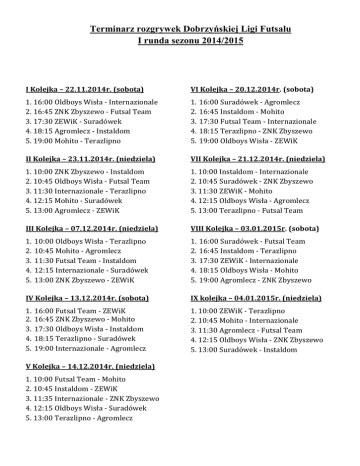 Terminarz rozgrywek Dobrzyńskiej Ligi Futsalu I runda sezonu 2014/2015 I Kolejka – 22.11.2014r. (sobota) VI Kolejka – 20.12.2014r. (sobota) 1. 16:00 Oldboys Wisła - Internazionale 2. 16:45 ZNK Zbyszewo - Futsal Team 3. 17:30 ZEWiK - Suradówek 4. 18:15 Agromlecz - Instaldom 5. 19:00 Mohito - Terazlipno 1. 2. 3. 4. 5. II Kolejka – 23.11.2014r. (niedziela) VII Kolejka – 21.12.2014r. (niedziela) 1. 10:00 ZNK Zbyszewo - Instaldom 2. 10:45 Oldboys Wisła - Futsal Team 3. 11:30 Internazionale - Terazlipno 4. 12:15 Mohito - Suradówek 5. 13:00 Agromlecz - ZEWiK 1. 10:00 Instaldom - Internazionale 2. 10:45 Suradówek - ZNK Zbyszewo 3. 11:30 ZEWiK - Mohito 4. 12:15 Oldboys Wisła - Agromlecz 5. 13:00 Terazlipno - Futsal Team III Kolejka – 07.12.2014r. (niedziela) VIII Kolejka – 03.01.2015r. (sobota) 1. 2. 3. 4. 5. 1. 2. 3. 4. 5. 10:00 Oldboys Wisła - Terazlipno 10:45 Mohito - Agromlecz 11:30 Futsal Team - Instaldom 12:15 Internazionale - Suradówek 13:00 ZNK Zbyszewo - ZEWiK 16:00 Suradówek - Agromlecz 16:45 Instaldom - Mohito 17:30 Futsal Team - Internazionale 18:15 Terazlipno - ZNK Zbyszewo 19:00 Oldboys Wisła - ZEWiK 16:00 Suradówek - Futsal Team 16:45 Instaldom - Terazlipno 17:30 ZEWiK - Internazionale 18:15 Oldboys Wisła - Mohito 19:00 Agromlecz - ZNK Zbyszewo IV Kolejka – 13.12.2014r. (sobota) IX kolejka – 04.01.2015r. (niedziela) 1. 2. 3. 4. 5. 1. 10:00 ZEWiK - Terazlipno 2. 10:45 Mohito - Internazionale 3. 11:30 Agromlecz - Futsal Team 4. 12:15 Oldboys Wisła - ZNK Zbyszewo 5. 13:00 Suradówek - Instaldom 16:00 Futsal Team - ZEWiK 16:45 ZNK Zbyszewo - Mohito 17:30 Oldboys Wisła - Instaldom 18:15 Terazlipno - Suradówek 19:00 Internazionale - Agromlecz V Kolejka – 14.12.2014r. (niedziela) 1. 10:00 Futsal Team - Mohito 2. 10:45 Instaldom - ZEWiK 3. 11:35 Internazionale - ZNK Zbyszewo 4. 12:15 Oldboys Wisła - Suradówek 5. 13:00 Terazlipno - Agromlecz