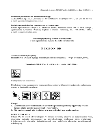 Załącznik do pozw. MRiRW nr R -26/2014 h.r. z dnia 28.03.2014 r. Posiadacz pozwolenia na handel równoległy: AGROSIMEX Sp. z o. o., Goliany 43, 05-620 Błędów, tel: (48)66 80 471, fax (48) 66 80 468, e-mail: [email protected] Podmiot odpowiedzialny za ostateczne etykietowanie: Rotam Agrochemical Europe Ltd., Hamilton House, Mabledon Place, WC1H 9BB Londyn , Zjednoczone Królestwo Wielkiej Brytanii i Irlandii Północnej, tel.: +44 207 953 0447, e-mail: [email protected] Przestrzegaj etykiety środka ochrony roślin w celu ograniczenia ryzyka dla ludzi i środowiska N I K S O N OD Zawartość substancji czynnej: nikosulfuron (związek z grupy pochodnych sulfonylomocznika) – 40 g/l środka (4,25 %). Pozwolenie MRiRW nr R -26/2014 h.r. z dnia 28.03.2014 r. Niebezpieczny dla środowiska Działa toksycznie na organizmy wodne; może powodować długo utrzymujące się, niekorzystne zmiany w środowisku wodnym. Uwaga! 1. Zabrania się stosowania środka w strefie bezpośredniej ochrony ujęć wody oraz na terenie otulin parków narodowych i rezerwatów. 2. Nie zanieczyszczać wód środkiem ochrony roślin lub jego opakowaniem. I OPIS DZIAŁANIA Nikson OD to środek chwastobójczy, w postaci zawiesiny olejowej do rozcieńczania wodą, stosowany nalistnie, przeznaczony do powschodowego zwalczania perzu właściwego i jednorocznych chwastów jednoliściennych oraz niektórych chwastów dwuliściennych w kukurydzy. Nikson OD jest herbicydem o działaniu układowym. Pobierany jest głównie poprzez liście i szybko przemieszczany w roślinie, hamując jej wzrost i rozwój. Wzrost chwastów zostaje zahamowany wkrótce po zastosowaniu środka, po czym następuje stopniowe przebarwianie się roślin. Chwasty zamierają całkowicie po 20-25 dniach od zabiegu. Środek działa najskuteczniej na młode, intensywnie rosnące chwasty. Ciepła i wilgotna pogoda przyspiesza działanie środka, chłodna i sucha może je opóźnić. Chwasty wrażliwe np.: jednoroczne jednoliścienne: chwastnica jednostronna, wyczyniec polny jednoliścienne wieloletnie: perz właściwy, dwuliścienne jednoroczne: przytulia czepna, rdest powojowy, rdest ptasi, chwasty rumianowate, tobołki polne. Chwasty średnio wrażliwe np.: bodziszek drobny, komosa biała. Chwasty odporne np.: odporne są chwasty średnio wrażliwe w późniejszych fazach rozwojowych (powyżej 6 liści), skrzyp polny, ostrożeń polny. II ZAKRES STOSOWANIA, TERMINY I DAWKI KUKURYDZA Zabieg wykonać wcześnie po wschodach w fazie 2-4 liści kukurydzy (BBCH 12-14). Zwalczanie perzu właściwego. Zabieg wykonać, gdy większość roślin osiągnęła wysokość 15-20 cm (perz ma wtedy 5-7 liści). Zalecana dawka: 1-1,5 l/ha. Wyższą z zalecanych dawek stosować w przypadku bardzo silnego zachwaszczenia perzem. Zwalczanie chwastnicy jednostronnej i wyczyńca polnego. Zabieg wykonać gdy chwasty są w fazie 3 liści do końca fazy krzewienia. Zalecana dawka: 1 l/ha. Zwalczanie chwastów dwuliściennych. Zabieg wykonać, gdy większość chwastów (ponad 50%) znajduje się w fazie 2-4 liści. Zalecana dawka: 1 l/ha (chwasty jednoroczne). Zalecana ilość wody: 200-300 l/ha. Zalecane opryskiwanie: średniokropliste. Uwagi: 1. W warunkach niekorzystnych dla wzrostu i rozwoju kukurydzy po zastosowaniu środka mogą wystąpić przemijające zniekształcenia liści, przebarwienia oraz wstrzymanie wzrostu roślin. 2. Środka nie stosować: - w kukurydzy cukrowej, pękającej i w uprawie materiałów hodowlanych, - w fazie rozwojowej kukurydzy powyżej 7 liści, - na odmianę kukurydzy Koka. III NASTĘPSTWO ROŚLIN W przypadku wcześniejszej likwidacji plantacji można siać bez ograniczeń kukurydzę jako roślinę następczą lub: - zboża - po 3 miesiącach - na glebach kwaśnych) po 9 miesiącach - na glebach obojętnych i zasadowych, - strączkowe - po 9 miesiącach - lucernę - po 12 miesiącach. Wiosną następnego roku można uprawiać wszystkie rośliny. IV OKRES KARENCJI okres od dnia ostatniego zabiegu do dnia zbioru roślin przeznaczonych do konsumpcji NIE DOTYCZY V OKRES PREWENCJI DLA LUDZI, ZWIERZĄT, PSZCZÓŁ okres zapobiegający zatruciu NIE DOTYCZY VI SPORZĄDZANIE CIECZY UŻYTKOWEJ Przed przystąpieniem do sporządzania cieczy użytkowej dokładnie ustalić potrzebną jej ilość. Zawartością opakowania przed użyciem wstrząsnąć. Odmierzoną ilość środka wlać do zbiornika opryskiwacza napełnionego częściowo wodą z włączonym mieszadłem i uzupełnić wodą do potrzebnej ilości. Po wlaniu środka do zbiornika opryskiwacza nie wyposażonego w mieszadło hydrauliczne ciecz w zbiorniku mechanicznie wymieszać. Opróżnione opakowania przepłukać trzykrotnie wodą, a popłuczyny wlać do zbiornika opryskiwacza z cieczą użytkową. W przypadku przerw w opryskiwaniu przed ponownym przystąpieniem do pracy, dokładnie wymieszać ciecz użytkową w zbiorniku opryskiwacza. Po pracy aparaturę dokładnie wymyć. VII PRZECHOWYWANIE Chronić przed dziećmi. Nie przechowywać razem z żywnością, napojami i paszami dla zwierząt. Przechowywać pojemnik szczelnie zamknięty. Przechowywać z dala od źródeł ciepła. Przechowywać wyłącznie w oryginalnym opakowaniu w temperaturze nie przekraczającej zakresu 0-30oC. VIII WARUNKI BEZPIECZNEGO STOSOWANIA ŚRODKA Nie jeść i nie pić oraz nie palić tytoniu podczas stosowania produktu. Nosić odpowiednią odzież ochronną. W razie połknięcia niezwłocznie zasięgnij porady lekarza - pokaż opakowanie lub etykietę. Zabiegu nie wykonywać: - bezpośrednio po okresie długotrwałych chłodów na rośliny, których wzrost został zahamowany wskutek niskich temperatur; zabieg można wykonać po wznowieniu intensywnego wzrostu kukurydzy - w temperaturze powietrza poniżej 10oC i powyżej 25oC - na rośliny osłabione i uszkodzone przez przymrozki, suszę, szkodniki lub choroby - na rośliny mokre (rosa, deszcze) Podczas stosowania środka nie dopuścić do: - znoszenia cieczy użytkowej na sąs