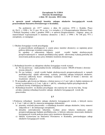 Zarządzenie Nr 3/2014 Starosty Kraśnickiego z dnia 02 stycznia 2014 roku w sprawie zasad refundacji kosztów zakupu okularów korygujących wzrok pracownikom Starostwa Powiatowego w Kraśniku. Na podstawie art. 23715 ustawy z dnia 26 czerwca 1974 r. Kodeks Pracy (tj. Dz.U. z 1998 r. Nr 21 poz. 94 ze zm. ) w związku z § 8 Rozporządzenia Ministra Pracy i Polityki Socjalnej z dnia 1 grudnia 1998 r. w sprawie bezpieczeństwa i higieny pracy na stanowiskach wyposażonych w monitory ekranowe ( Dz.U. z 1998 r. Nr 148 poz. 973 ) zarządzam, co następuje : §1 1. Okulary korygujące wzrok przysługują: a) pracownikom użytkującym w czasie pracy monitor ekranowy co najmniej przez połowę dobowego wymiaru czasu pracy, b) zgodnie z zaleceniem lekarza, jeżeli wyniki badań okulistycznych przeprowadzonych w ramach profilaktycznej opieki zdrowotnej wykażą potrzebę ich stosowania podczas pracy przy obsłudze monitora ekranowego. §2 1. Refundacja kosztów za zakupione okulary korygujące wzrok wynosi: a) Po raz pierwszy – maksymalna kwota refundacji wynosi 300,00 zł brutto ( słownie: trzysta złotych ). b) Po raz kolejny – jeżeli wyniki badań okulistycznych przeprowadzonych w ramach profilaktycznej opieki zdrowotnej wykażą potrzebę zakupu kolejnych okularów, wówczas całkowity koszt refundacji wyniesie – 130,00 zł brutto ( słownie: sto trzydzieści złotych ). 2. W przypadku, gdy kwota na fakturze, o której mowa w § 3 ust.1 pkt c), będzie mniejsza od kwoty wymienionej w § 2 ust. 1 pkt a) i pkt b), refundacja będzie przysługiwała do wysokości kwoty widniejącej na fakturze. 3. Refundacja kosztów za okulary przysługuje nie częściej niż raz na trzy lata, licząc od daty ostatniej refundacji kosztów zakupu okularów korygujących wzrok dla pracownika. §3 1.Podstawę refundacji kosztów zakupu okularów korygujących wzrok, o których mowa w § 2 ust. 1 pkt a) i pkt b), stanowią następujące dokumenty: a) pisemny wniosek pracownika o refundację kosztów zakupu okularów, który stanowi załącznik nr 1 do niniejszego zarządzenia, b) aktualne zaświadczenie lekarskie, wydane przez lekarza medycyny pracy przeprowadzającego badanie profilaktyczne, w którym zalecono stosowanie okularów korygujących wzrok podczas pracy przy monitorze ekranowym, c) faktura wystawiona na Starostwo Powiatowe w Kraśniku, potwierdzająca zakup okularów korygujących wzrok. §4 1 Dokumenty, o których mowa w § 3 ust. 1 pkt a), b), c), składane są pracownikowi ds. BHP, który po ich sprawdzeniu przekazuje fakturę do Wydziału Finansowego celem refundacji kosztów przysługujących pracownikowi. §5 1. W przypadku zgubienia lub zniszczenia przez pracownika zrefundowych okularów korygujących wzrok, pracodawca nie ponosi kosztów zakupu nowych okularów. 2. W przypadku rozwiązania z pracownikiem umowy o pracę ( niezależnie od trybu jej rozwiązania ), okulary korygujące wzrok przechodzą na własność pracownika. §6 Wykonanie Zarządzenia powierzam Skarbnikowi Powiatu i Kierownikowi Wydziału Organizacyjno – Prawnego i Kontroli. §7 Traci moc Zarządzenie Nr 20/2007 Starosty Kraśnickiego z dnia 19 marca 2007 r. w sprawie przydziału okularów ochronno - korygujących wzrok dla pracowników Starostwa Powiatowego w Kraśniku. §8 Zarządzenie wchodzi w życie z dniem podpisania. Starosta Kraśnicki Andrzej Maj