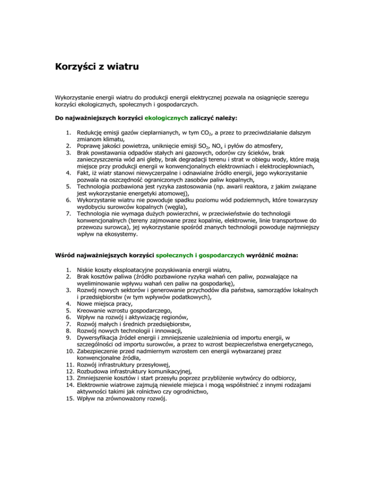 Korzyści z wiatru Wykorzystanie energii wiatru do produkcji energii elektrycznej pozwala na osiągnięcie szeregu korzyści ekologicznych, społecznych i gospodarczych. Do najwaŜniejszych korzyści ekologicznych zaliczyć naleŜy: 1. Redukcję emisji gazów cieplarnianych, w tym CO2, a przez to przeciwdziałanie dalszym zmianom klimatu, 2. Poprawę jakości powietrza, uniknięcie emisji SO2, NOx i pyłów do atmosfery, 3. Brak powstawania odpadów stałych ani gazowych, odorów czy ścieków, brak zanieczyszczenia wód ani gleby, brak degradacji terenu i strat w obiegu wody, które mają miejsce przy produkcji energii w konwencjonalnych elektrowniach i elektrociepłowniach, 4. Fakt, iŜ wiatr stanowi niewyczerpalne i odnawialne źródło energii, jego wykorzystanie pozwala na oszczędność ograniczonych zasobów paliw kopalnych, 5. Technologia pozbawiona jest ryzyka zastosowania (np. awarii reaktora, z jakim związane jest wykorzystanie energetyki atomowej), 6. Wykorzystanie wiatru nie powoduje spadku poziomu wód podziemnych, które towarzyszy wydobyciu surowców kopalnych (węgla), 7. Technologia nie wymaga duŜych powierzchni, w przeciwieństwie do technologii konwencjonalnych (tereny zajmowane przez kopalnie, elektrownie, linie transportowe do przewozu surowca), jej wykorzystanie spośród znanych technologii powoduje najmniejszy wpływ na ekosystemy. Wśród najwaŜniejszych korzyści społecznych i gospodarczych wyróŜnić moŜna: 1. Niskie koszty eksploatacyjne pozyskiwania energii wiatru, 2. Brak kosztów paliwa (źródło pozbawione ryzyka wahań cen paliw, pozwalające na wyeliminowanie wpływu wahań cen paliw na gospodarkę), 3. Rozwój nowych sektorów i generowanie przychodów dla państwa, samorządów lokalnych i przedsiębiorstw (w tym wpływów podatkowych), 4. Nowe miejsca pracy, 5. Kreowanie wzrostu gospodarczego, 6. Wpływ na rozwój i aktywizację regionów, 7. Rozwój małych i średnich przedsiębiorstw, 8. Rozwój nowych technologii i innowacji, 9. Dywersyfikacja źródeł energii i zmniejszenie uzaleŜnienia od importu energii, w szczególności od importu surowców, a przez to wzrost bezpieczeństwa energetycznego, 10. Zabezpieczenie przed nadmiernym wzrostem cen energii wytwarzanej przez konwencjonalne źródła, 11. Rozwój infrastruktury przesyłowej, 12. Rozbudowa infrastruktury komunikacyjnej, 13. Zmniejszenie kosztów i start przesyłu poprzez przybliŜenie wytwórcy do odbiorcy, 14. Elektrownie wiatrowe zajmują niewiele miejsca i mogą współistnieć z innymi rodzajami aktywności takimi jak rolnictwo czy ogrodnictwo, 15. Wpływ na zrównowaŜony rozwój.