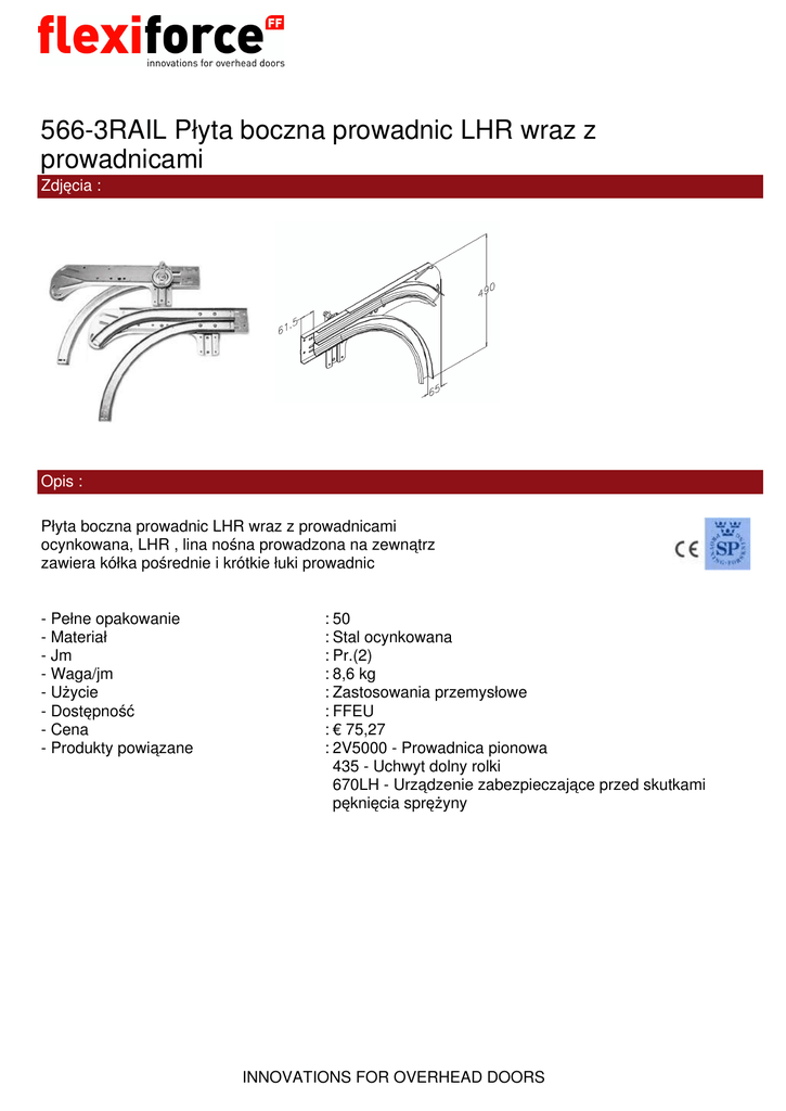 566-3RAIL Płyta boczna prowadnic LHR wraz z prowadnicami Zdjęcia : Opis : Płyta boczna prowadnic LHR wraz z prowadnicami ocynkowana, LHR , lina nośna prowadzona na zewnątrz zawiera kółka pośrednie i krótkie łuki prowadnic - Pełne opakowanie - Materiał - Jm - Waga/jm - Użycie - Dostępność - Cena - Produkty powiązane : 50 : Stal ocynkowana : Pr.(2) : 8,6 kg : Zastosowania przemysłowe : FFEU : € 75,27 : 2V5000 - Prowadnica pionowa 435 - Uchwyt dolny rolki 670LH - Urządzenie zabezpieczające przed skutkami pęknięcia sprężyny INNOVATIONS FOR OVERHEAD DOORS