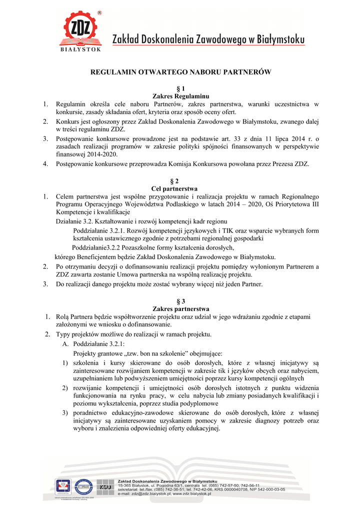 REGULAMIN OTWARTEGO NABORU PARTNERÓW 1. 2. 3. 4. §1 Zakres Regulaminu Regulamin określa cele naboru Partnerów, zakres partnerstwa, warunki uczestnictwa w konkursie, zasady składania ofert, kryteria oraz sposób oceny ofert. Konkurs jest ogłoszony przez Zakład Doskonalenia Zawodowego w Białymstoku, zwanego dalej w treści regulaminu ZDZ. Postępowanie konkursowe prowadzone jest na podstawie art. 33 z dnia 11 lipca 2014 r. o zasadach realizacji programów w zakresie polityki spójności finansowanych w perspektywie finansowej 2014-2020. Postępowanie konkursowe przeprowadza Komisja Konkursowa powołana przez Prezesa ZDZ. §2 Cel partnerstwa 1. Celem partnerstwa jest wspólne przygotowanie i realizacja projektu w ramach Regionalnego Programu Operacyjnego Województwa Podlaskiego w latach 2014 – 2020, Oś Priorytetowa III Kompetencje i kwalifikacje Działanie 3.2. Kształtowanie i rozwój kompetencji kadr regionu Poddziałanie 3.2.1. Rozwój kompetencji językowych i TIK oraz wsparcie wybranych form kształcenia ustawicznego zgodnie z potrzebami regionalnej gospodarki Poddziałanie3.2.2 Pozaszkolne formy kształcenia dorosłych, którego Beneficjentem będzie Zakład Doskonalenia Zawodowego w Białymstoku. 2. Po otrzymaniu decyzji o dofinansowaniu realizacji projektu pomiędzy wyłonionym Partnerem a ZDZ zawarta zostanie Umowa partnerska na wspólną realizację projektu. 3. Do realizacji danego projektu może zostać wybrany więcej niż jeden Partner. §3 Zakres partnerstwa 1. Rolą Partnera będzie współtworzenie projektu oraz udział w jego wdrażaniu zgodnie z etapami założonymi we wniosku o dofinansowanie. 2. Typy projektów możliwe do realizacji w ramach projektu. A. Poddziałanie 3.2.1: Projekty grantowe „tzw. bon na szkolenie” obejmujące: 1) szkolenia i kursy skierowane do osób dorosłych, które z własnej inicjatywy są zainteresowane rozwijaniem kompetencji w zakresie tik i języków obcych oraz nabyciem, uzupełnianiem lub podwyższeniem umiejętności poprzez kursy kompetencji ogólnych 2) rozwijanie kompetencji i umiejętności osób dorosłych istotnych z punktu widzenia funkcjonowania na rynku pracy, w celu nabycia lub zmiany posiadanych kwalifikacji i poziomu wykształcenia, poprzez studia podyplomowe 3) poradnictwo edukacyjno-zawodowe skierowane do osób dorosłych, które z własnej inicjatywy są zainteresowane uzyskaniem pomocy w zakresie diagnozy potrzeb oraz wyboru i znalezienia odpowiedniej oferty edukacyjnej. B. Poddziałanie 3.2.2 : Projekty grantowe (tzw. bon na szkolenie) dotyczące pozaszkolnych form kształcenia dorosłych, takich jak: kwalifikacyjne kursy zawodowe i kursy umiejętności zawodowych uzupełnione o poradnictwo edukacyjno-zawodowe. 3. Zakres zadań w danym projekcie, okres realizacji oraz szczegóły dotyczące planowanych działań zostaną wspólnie opracowane przez partnerstwo w oparciu o wymagania konkursowe, zgodnie z dokumentami programowymi oraz przy uwzględnieniu potencjału Partnera. 4. Planowany okres realizacji projektu to listopad 2016 – listopad 2019 roku 1. 2. §4 Warunku uczestnictwa w naborze W naborze mogą brać udział wszystkie podmioty – z wyłączeniem osób fizycznych (nie dotyczy osób prowadzących działalność gospodarczą lub oświatową na podstawie przepisów odrębnych), w szczególności podmioty prowadzące kształcenie i szkolenie osób dorosłych w systemie formalnym i pozaformalnym, które łącznie spełniają następujące warunki: 1) nie podlegają wykluczeniu z ubiegania się o dofinansowanie na podstawie: • art. 207 ust. 4 ustawy z dnia 27 sierpnia 2009 r. o finansach publicznych (Dz. U. nr 157, poz. 1240 z późn. zmianami), • art. 12 ust. 1 pkt 1 ustawy z dnia 15 czerwca 2012r. o skutkach powierzania wykonywania pracy cudzoziemcom przebywającym wbrew przepisom na terytorium Rzeczypospolitej Polskiej (t.j. Dz. U. 2012 r. poz. 769); • art. 9 ust. 1 pkt 2a ustawy z dnia 28 października 2002 r. o odpowiedzialności podmiotów zbiorowych za czyny zabronione pod groźbą kary (Dz. U. 2015 r. poz. 1212). 2) nie zalegają z uiszczeniem podatków, jak również z opłacaniem składek na ubezpieczenie społeczne i zdrowotne, Fundusz Pracy, Państwowy Fundusz Rehabilitacji Osób Niepełnosprawnych lub innych należności wymaganych odrębnymi przepisami 3) prowadzą działalność w obszarze poddziałania, w którym zamierzają uczestniczyć; 4) posiadają niezbędną wiedzę i doświadczenie w obszarze poddziałania, w którym zamierzają uczestniczyć; Warunkiem przystąpienia do naboru jest złożenie oferty na wzorze stanowiącym załącznik nr 1 do niniejszego Regulaminu z zastrzeżeniem, iż część III załącznika należy sporządzić oddzielnie dla każdego poddziałania wskazanego w części II. §5 Zasady składania ofert 1. Nabór partnera odbywać się będzie w terminie od 06.06.2016r. do 01.07.2016r. 2. Oferty wraz z wymaganymi dokumentami należy składać w zamkniętej kopercie najpóźniej do dnia 01.07.2016 r., do godziny 15.15 z dopiskiem „Konkurs na wybór partnerów do projektu w ramach Działanie 3.2. Kształtowanie i rozwój kompetencji kadr regionu” osobiście lub drogą pocztową na adres: Zakładu Doskonalenia Zawodowego ul. Pogodna 63, 15-365 Białystok. 3. Do oferty dołączyć należy: 1) aktualny odpis z rejestru lub odpowiedniego wyciągu z ewidencji lub inne dokumenty potwierdzające status prawny oferenta i umocowanie osób go reprezentujących, 2) oświadczenie o niezaleganiu z płatnościami na rzecz podmiotów publicznoprawnych (zgodnie z treścią załącznika nr 2), 3) oświadczenie o nie podleganiu wykluczeniu z otrzymania dofinansowania (zgodnie z treścią załącznika nr 3), 4. Oferta oraz wszystkie załączniki do oferty powinny być podpisane przez osobę upoważnioną do reprezentowania kandydata na partnera. 5. Za datę złożenia oferty uznaje się dzień złożenia oferty w ZDZ. 6. Oferty złożone po upływie powyższego termin