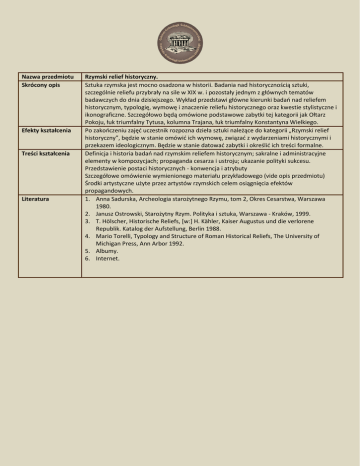 Nazwa przedmiotu Skrócony opis Efekty kształcenia Treści kształcenia Literatura Rzymski relief historyczny. Sztuka rzymska jest mocno osadzona w historii. Badania nad historycznością sztuki, szczególnie reliefu przybrały na sile w XIX w. i pozostały jednym z głównych tematów badawczych do dnia dzisiejszego. Wykład przedstawi główne kierunki badao nad reliefem historycznym, typologię, wymowę i znaczenie reliefu historycznego oraz kwestie stylistyczne i ikonograficzne. Szczegółowo będą omówione podstawowe zabytki tej kategorii jak Ołtarz Pokoju, łuk triumfalny Tytusa, kolumna Trajana, łuk triumfalny Konstantyna Wielkiego. Po zakooczeniu zajęd uczestnik rozpozna dzieła sztuki należące do kategorii „Rzymski relief historyczny”, będzie w stanie omówid ich wymowę, związad z wydarzeniami historycznymi i przekazem ideologicznym. Będzie w stanie datowad zabytki i określid ich treści formalne. Definicja i historia badao nad rzymskim reliefem historycznym; sakralne i administracyjne elementy w kompozycjach; propaganda cesarza i ustroju; ukazanie polityki sukcesu. Przedstawienie postaci historycznych - konwencja i atrybuty Szczegółowe omówienie wymienionego materiału przykładowego (vide opis przedmiotu) Środki artystyczne użyte przez artystów rzymskich celem osiągnięcia efektów propagandowych. 1. Anna Sadurska, Archeologia starożytnego Rzymu, tom 2, Okres Cesarstwa, Warszawa 1980. 2. Janusz Ostrowski, Starożytny Rzym. Polityka i sztuka, Warszawa - Kraków, 1999. 3. T. Hölscher, Historische Reliefs, *w:+ H. Kähler, Kaiser Augustus und die verlorene Republik. Katalog der Aufstellung, Berlin 1988. 4. Mario Torelli, Typology and Structure of Roman Historical Reliefs, The University of Michigan Press, Ann Arbor 1992. 5. Albumy. 6. Internet.