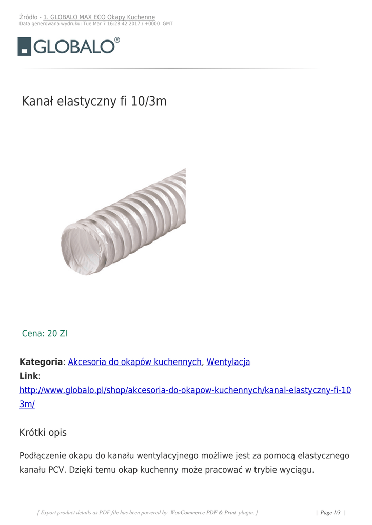 Źródło - 1. GLOBALO MAX ECO Okapy Kuchenne Data generowana wydruku: Tue Mar 7 16:28:42 2017 / +0000 GMT Kanał elastyczny fi 10/3m Cena: 20 Zl Kategoria: Akcesoria do okapów kuchennych, Wentylacja Link: http://www.globalo.pl/shop/akcesoria-do-okapow-kuchennych/kanal-elastyczny-fi-10 3m/ Krótki opis Podłączenie okapu do kanału wentylacyjnego możliwe jest za pomocą elastycznego kanału PCV. Dzięki temu okap kuchenny może pracować w trybie wyciągu. [ Export product details as PDF file has been powered by WooCommerce PDF & Print plugin. ] | Page 1/3 | Źródło - 1. GLOBALO MAX ECO Okapy Kuchenne Data generowana wydruku: Tue Mar 7 16:28:42 2017 / +0000 GMT - Materiał: PCV - Średnica: 10 cm - Długość: 3 m Kanał elastyczny PCV – fi 10/3M | Zalety i korzyści dla użytkownika Kanał elastyczny został w całości wykonany z tworzywa sztucznego PCV, które jest niepalne i spełnia międzynarodowe normy budowlane. Materiał ten nie ulega korozji, co zapewnia możliwość wieloletniego, bezawaryjnego użytkowania. Za sprawą tego elementu szkodliwe substancje, które ulatniają są podczas gotowania, zostają odprowadzone do kanału wentylacyjnego, a z niego – na zewnątrz budynku. Kanał jest niebywale lekki i prosty w montażu. Dobrze wiedzieć! Kanał elastyczny można przyciąć w dowolnym miejscu za pomocą piłki ręcznej do metalu. Aby zamontować kanał, należy dokupić specjalne opaski zaciskowe – po jednej na każdą stronę. [vc_column][vc_button title="Jaki wybrać okap?" custom_color="#58ccef" custom_icon="fa-question" custom_pos="left" href="/wybor-najlepszego-okapu-kuchennego/"][vc_button title="Pomaluj okap" custom_color="#58ccef" custom_icon="fa-magic" custom_pos="left" href="/kolorowe-okapy/"][vc_button title="Stwórz własny okap" custom_color="#58ccef" custom_icon="fa-star" custom_pos="left" href="/stworz-wlasny-okap/"][vc_button title="Punkty sprzedaży" custom_color="#58ccef" custom_icon="fa-globe" custom_pos="left" href="/punkty-sprzedazy/"] Specyfikacja produktu: - Wykonanie: PCV - Średnica: fi 10 cm - Długość: 3m - Typ akcesoriów do okapów: Wentylacja - Klasa energetyczna: Bez Klasy [ Export product details as PDF file has been powered by WooCommerce PDF & Print plugin. ] | Page 2/3 | Źródło - 1. GLOBALO MAX ECO Okapy Kuchenne Data generowana wydruku: Tue Mar 7 16:28:42 2017 / +0000 GMT - Marka: GLOBALO [ Export product details as PDF file has been powered by WooCommerce PDF & Print plugin. ] | Page 3/3 |