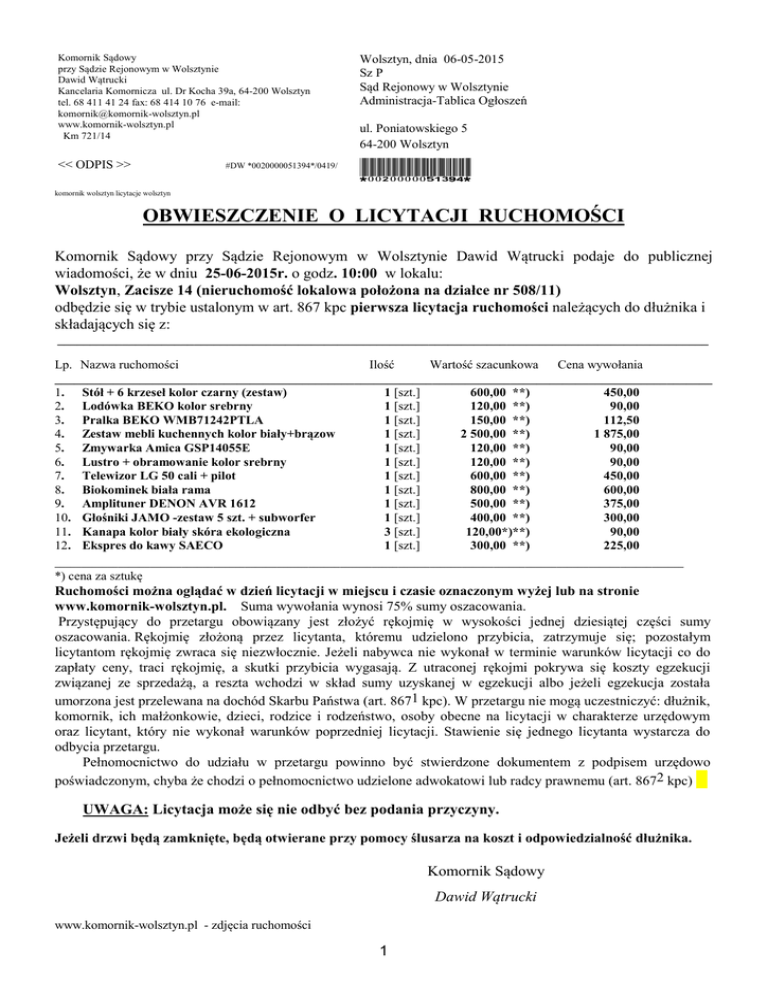 Komornik Sądowy przy Sądzie Rejonowym w Wolsztynie Dawid Wątrucki Kancelaria Komornicza ul. Dr Kocha 39a, 64-200 Wolsztyn tel. 68 411 41 24 fax: 68 414 10 76 e-mail: [email protected] www.komornik-wolsztyn.pl Km 721/14 Wolsztyn, dnia 06-05-2015 Sz P Sąd Rejonowy w Wolsztynie Administracja-Tablica Ogłoszeń << ODPIS >> *0020000051394* #DW *0020000051394*/0419/ ul. Poniatowskiego 5 64-200 Wolsztyn komornik wolsztyn licytacje wolsztyn OBWIESZCZENIE O LICYTACJI RUCHOMOŚCI Komornik Sądowy przy Sądzie Rejonowym w Wolsztynie Dawid Wątrucki podaje do publicznej wiadomości, że w dniu 25-06-2015r. o godz. 10:00 w lokalu: Wolsztyn, Zacisze 14 (nieruchomość lokalowa położona na działce nr 508/11) odbędzie się w trybie ustalonym w art. 867 kpc pierwsza licytacja ruchomości należących do dłużnika i składających się z: ____________________________________________________________________________________________________ Lp. Nazwa ruchomości Ilość Wartość szacunkowa Cena wywołania _____________________________________________________________________________________________________ 1. Stół + 6 krzeseł kolor czarny (zestaw) 1 [szt.] 600,00 **) 450,00 2. Lodówka BEKO kolor srebrny 1 [szt.] 120,00 **) 90,00 3. Pralka BEKO WMB71242PTLA 1 [szt.] 150,00 **) 112,50 4. Zestaw mebli kuchennych kolor biały+brązow 1 [szt.] 2 500,00 **) 1 875,00 5. Zmywarka Amica GSP14055E 1 [szt.] 120,00 **) 90,00 6. Lustro + obramowanie kolor srebrny 1 [szt.] 120,00 **) 90,00 7. Telewizor LG 50 cali + pilot 1 [szt.] 600,00 **) 450,00 8. Biokominek biała rama 1 [szt.] 800,00 **) 600,00 9. Amplituner DENON AVR 1612 1 [szt.] 500,00 **) 375,00 10. Głośniki JAMO -zestaw 5 szt. + subworfer 1 [szt.] 400,00 **) 300,00 11. Kanapa kolor biały skóra ekologiczna 3 [szt.] 120,00*)**) 90,00 12. Ekspres do kawy SAECO 1 [szt.] 300,00 **) 225,00 _______________________________________________________________________________________________________________________ *) cena za sztukę Ruchomości można oglądać w dzień licytacji w miejscu i czasie oznaczonym wyżej lub na stronie www.komornik-wolsztyn.pl. Suma wywołania wynosi 75% sumy oszacowania. Przystępujący do przetargu obowiązany jest złożyć rękojmię w wysokości jednej dziesiątej części sumy oszacowania. Rękojmię złożoną przez licytanta, któremu udzielono przybicia, zatrzymuje się; pozostałym licytantom rękojmię zwraca się niezwłocznie. Jeżeli nabywca nie wykonał w terminie warunków licytacji co do zapłaty ceny, traci rękojmię, a skutki przybicia wygasają. Z utraconej rękojmi pokrywa się koszty egzekucji związanej ze sprzedażą, a reszta wchodzi w skład sumy uzyskanej w egzekucji albo jeżeli egzekucja została umorzona jest przelewana na dochód Skarbu Państwa (art. 8671 kpc). W przetargu nie mogą uczestniczyć: dłużnik, komornik, ich małżonkowie, dzieci, rodzice i rodzeństwo, osoby obecne na licytacji w charakterze urzędowym oraz licytant, który nie wykonał warunków poprzedniej licytacji. Stawienie się jednego licytanta wystarcza do odbycia przetargu. Pełnomocnictwo do udziału w przetargu powinno być stwierdzone dokumentem z podpisem urzędowo poświadczonym, chyba że chodzi o pełnomocnictwo udzielone adwokatowi lub radcy prawnemu (art. 8672 kpc) UWAGA: Licytacja może się nie odbyć bez podania przyczyny. Jeżeli drzwi będą zamknięte, będą otwierane przy pomocy ślusarza na koszt i odpowiedzialność dłużnika. Komornik Sądowy Dawid Wątrucki www.komornik-wolsztyn.pl - zdjęcia ruchomości 1 Adresat oryginału: dłużnik Do wiadomości: 1. Anna Franciszka Gudańska, Poznań, 60-225 Poznań 2. Sąd Rejonowy w Wolsztynie Administracja-Tablica Ogłoszeń, 64-200 Wolsztyn 3. adw. Mariusz Ratajczak, 67-100 Nowa Sól 4. a/a 2