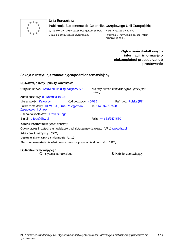 Unia Europejska Publikacja Suplementu do Dziennika Urzędowego Unii Europejskiej 2, rue Mercier, 2985 Luxembourg, Luksemburg Faks: +352 29 29 42 670 E-mail: [email protected] Informacje i formularze on-line: http:// simap.europa.eu Ogłoszenie dodatkowych informacji, informacje o niekompletnej procedurze lub sprostowanie Sekcja I: Instytucja zamawiająca/podmiot zamawiający I.1) Nazwa, adresy i punkty kontaktowe: Oficjalna nazwa: Katowicki Holding Węglowy S.A. Krajowy numer identyfikacyjny: (jeżeli jest znany) _____ Adres pocztowy: ul. Damrota 16-18 Miejscowość: Katowice Kod pocztowy: 40-022 Punkt kontaktowy: KHW S.A., Dział Postępowań Zakupowych i Umów Państwo: Polska (PL) Tel.: +48 32/7573280 Osoba do kontaktów: Elżbieta Fogt E-mail: [email protected] Faks: +48 32/7574560 Adresy internetowe: (jeżeli dotyczy) Ogólny adres instytucji zamawiającej/ podmiotu zamawiającego: (URL) www.khw.pl Adres profilu nabywcy: (URL) _____ Dostęp elektroniczny do informacji: (URL) _____ Elektroniczne składanie ofert i wniosków o dopuszczenie do udziału: (URL) _____ I.2) Rodzaj zamawiającego: Instytucja zamawiająca Podmiot zamawiający PL Formularz standardowy 14 - Ogłoszenie dodatkowych informacji, informacje o niekompletnej procedurze lub sprostowanie 1/5 Sekcja II: Przedmiot zamówienia II.1.1) Nazwa nadana zamówieniu: DOSTAWA RUR DO PODSADZKI HYDRAULICZNEJ DO KHW S.A. W OKRESIE OD DNIA ZAWARCIA UMOWY DO DNIA 31.12.2016R. (CPV: 44164200-9 Przewody rurowe) II.1.2) Krótki opis zamówienia lub zakupu: (podano w pierwotnym ogłoszeniu) - Katowicki Holding Węglowy S.A. II.1.3) Wspólny Słownik Zamówień (CPV) Główny przedmiot Słownik główny 44164200 Słownik uzupełniający (jeżeli dotyczy) PL Formularz standardowy 14 - Ogłoszenie dodatkowych informacji, informacje o niekompletnej procedurze lub sprostowanie 2/5 Sekcja IV: Procedura IV.1)Rodzaj procedury (podano w pierwotnym ogłoszeniu) Otwarta Ograniczona Ograniczona przyspieszona Negocjacyjna Negocjacyjna przyspieszona Dialog konkurencyjny Negocjacyjna z uprzednim ogłoszeniem Negocjacyjna bez uprzedniego ogłoszenia Negocjacyjna z publikacją ogłoszenia o zamówieniu Negocjacyjna bez publikacji ogłoszenia o zamówieniu Udzielenie zamówienia bez uprzedniej publikacji ogłoszenia o zamówieniu w Dzienniku Urzędowym Unii Europejskiej IV.2)Informacje administracyjne IV.2.1)Numer referencyjny: (podano w pierwotnym ogłoszeniu) ZP/M/16A/2016 IV.2.2)Dane referencyjne ogłoszenia w przypadku ogłoszeń przesłanych drogą elektroniczną: Pierwotne ogłoszenie przesłane przez eNotices TED eSender Login: ENOTICES_Adam Dane referencyjne ogłoszenia: 2016-009847 rok i numer dokumentu IV.2.3)Ogłoszenie, którego dotyczy niniejsza publikacja: Numer ogłoszenia w Dz.U.: 2016/S 019-030336 z dnia: 28/01/2016 (dd/mm/rrrr) IV.2.4)Data wysłania pierwotnego ogłoszenia: 25/01/2016 (dd/mm/rrrr) PL Formularz standardowy 14 - Ogłoszenie dodatkowych informacji, informacje o niekompletnej procedurze lub sprostowanie 3/5 Sekcja VI: Informacje uzupełniające VI.1) Ogłoszenie dotyczy: Procedury niepełnej Sprostowania Informacji dodatkowych VI.2) Informacje na temat niepełnej procedury udzielenia zamówienia: Postępowanie o udzielenie zamówienia zostało przerwane Postępowanie o udzielenie zamówienia uznano za nieskuteczne Zamówienia nie udzielono Zamówienie może być przedmiotem ponownej publikacji VI.3) Informacje do poprawienia lub dodania : VI.3.1) Zmiana oryginalnej informacji podanej przez instytucję zamawiającą Publikacja w witrynie TED niezgodna z oryginalną informacją, przekazaną przez instytucję zamawiającą Oba przypadki VI.3.2) W ogłoszeniu pierwotnym W odpowiedniej dokumentacji przetargowej (więcej informacji w odpowiedniej dokumentacji przetargowej) W obu przypadkach (więcej informacji w odpowiedniej dokumentacji przetargowej) VI.3.3) Tekst, który należy poprawić w pierwotnym ogłoszeniu Miejsce, w którym znajduje się Zamiast: zmieniany tekst: CZĘŚĆ 1 RURY PODSADZKOWE II.2.1) Całkowita wielkość lub zakres: TYP A 185x10MM 10MPa L-2000MM CZĘŚĆ 2 RURY PODSADZKOWE TYP A 185x10MM 10MPa L-4000MM CZĘŚĆ 3 RURY PODSADZKOWE TYP A 185x8,8MM 6,4MPa L-4000MM CZĘŚĆ 4 RURY PODSADZKOWE TYP A 185x8,8MM 6,4MPa L-4000MM CZĘŚĆ 5 RURY PODSADZKOWE TYP B 185x8,8MM 6,4MPa L-4000MM CZĘŚĆ 6 RURY PODSADZKOWE TYP B 185x10MM 10MPa L-4000MM CZĘŚĆ 7 RURY PODSADZKOWE TYP B 185x17,5MM 10MPa L-4000MM Miejsce, w którym znajduje się zmieniany tekst: Zamiast: Powinno być: CZĘŚĆ 1 RURY PODSADZKOWE TYP A 185x10MM 10MPa L-2000MM CZĘŚĆ 2 RURY PODSADZKOWE TYP A 185x10MM 10MPa L-4000MM CZĘŚĆ 3 RURY PODSADZKOWE TYP A 185x8,8MM 6,4MPa L-4000MM CZĘŚĆ 4 RURY PODSADZKOWE TYP B 185x10MM 6,4MPa L-4000MM CZĘŚĆ 5 RURY PODSADZKOWE TYP B 185x8,8MM 6,4MPa L-4000MM CZĘŚĆ 6 RURY PODSADZKOWE TYP B 185x10MM 10MPa L-4000MM CZĘŚĆ 7 RURY PODSADZKOWE TYP B 185x17,5MM 10MPa L-4000MM Powinno być: PL Formularz standardowy 14 - Ogłoszenie dodatkowych informacji, informacje o niekompletnej procedurze lub sprostowanie 4/5 sekcji VI informacje uzupełniające Załącznik B część 4 CZĘŚĆ 4 RURY PODSADZKOWE TYP A 185x8,8MM 6,4MPa L-4000MM VI.3.4) Daty, które należy poprawić w pierwotnym ogłoszeniu Miejsce, w którym znajdują się Zamiast: zmieniane daty: Część nr 4 Nazwa CZĘŚĆ 4 RURY PODSADZKOWE TYP B 185x10MM 6,4MPa L-4000MM Powinno być: VI.3.5) Adresy i punkty kontaktowe, które należy poprawić VI.3.6) Tekst, który należy dodać do pierwotnego ogłoszenia Miejsce, w którym należy dodać tekst: Tekst do dodania: VI.4) Inne dodatkowe informacje: _____ VI.5) Data wysłania niniejszego ogłoszenia: 28/01/2016 (dd/mm/rrrr) - ID:2016-011805 PL Formularz standardowy 14 - Ogłoszenie dodatkowych informacji, informacje o niekompletnej procedurze lub sprostowanie 5/5