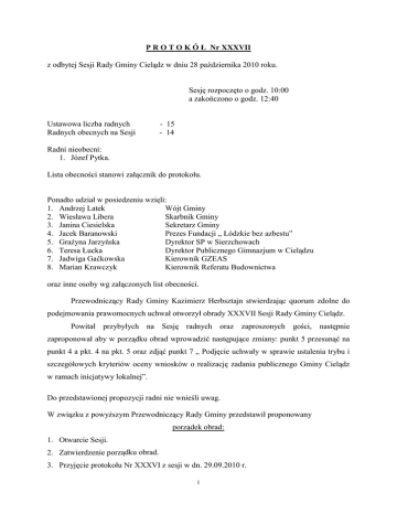 Protokół nr XXXVII z Sesji Rady Gminy Cielądz w dniu 28
