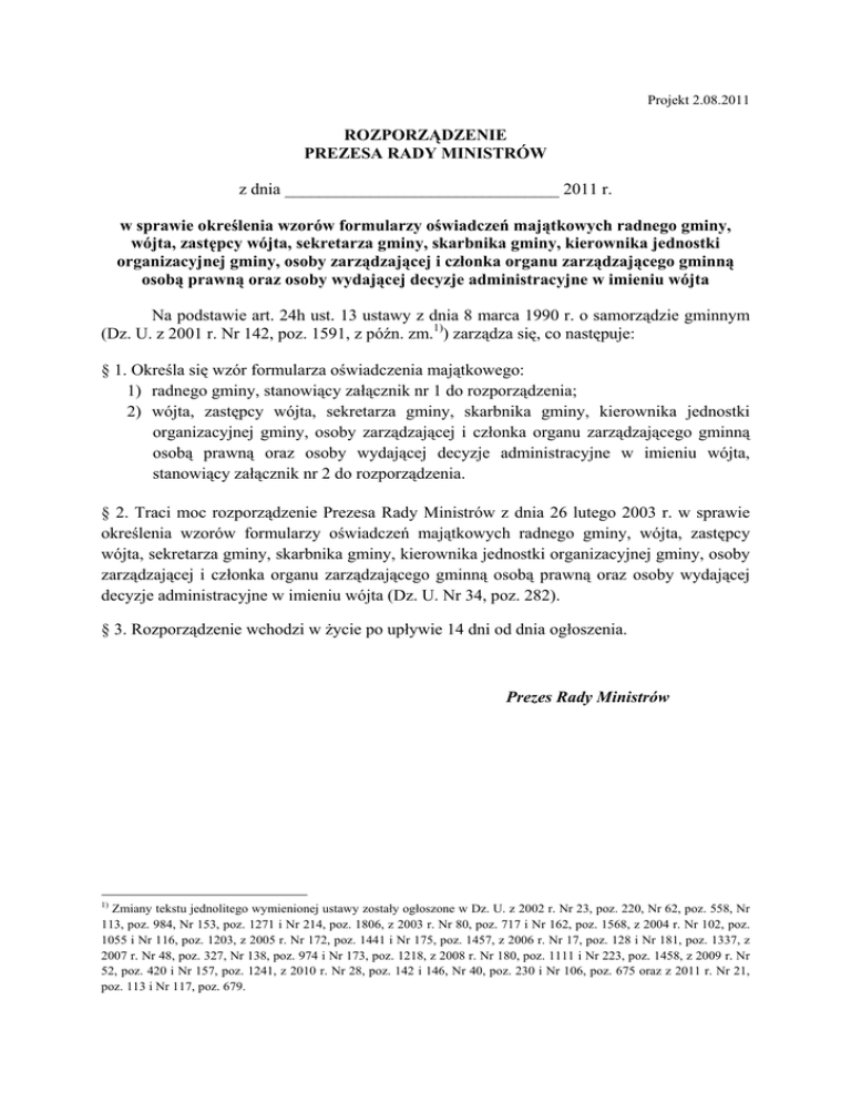 Projekt 2.08.2011 ROZPORZĄDZENIE PREZESA RADY MINISTRÓW z dnia ________________________________ 2011 r. w sprawie określenia wzorów formularzy oświadczeń majątkowych radnego gminy, wójta, zastępcy wójta, sekretarza gminy, skarbnika gminy, kierownika jednostki organizacyjnej gminy, osoby zarządzającej i członka organu zarządzającego gminną osobą prawną oraz osoby wydającej decyzje administracyjne w imieniu wójta Na podstawie art. 24h ust. 13 ustawy z dnia 8 marca 1990 r. o samorządzie gminnym (Dz. U. z 2001 r. Nr 142, poz. 1591, z późn. zm.1)) zarządza się, co następuje: § 1. Określa się wzór formularza oświadczenia majątkowego: 1) radnego gminy, stanowiący załącznik nr 1 do rozporządzenia; 2) wójta, zastępcy wójta, sekretarza gminy, skarbnika gminy, kierownika jednostki organizacyjnej gminy, osoby zarządzającej i członka organu zarządzającego gminną osobą prawną oraz osoby wydającej decyzje administracyjne w imieniu wójta, stanowiący załącznik nr 2 do rozporządzenia. § 2. Traci moc rozporządzenie Prezesa Rady Ministrów z dnia 26 lutego 2003 r. w sprawie określenia wzorów formularzy oświadczeń majątkowych radnego gminy, wójta, zastępcy wójta, sekretarza gminy, skarbnika gminy, kierownika jednostki organizacyjnej gminy, osoby zarządzającej i członka organu zarządzającego gminną osobą prawną oraz osoby wydającej decyzje administracyjne w imieniu wójta (Dz. U. Nr 34, poz. 282). § 3. Rozporządzenie wchodzi w Ŝycie po upływie 14 dni od dnia ogłoszenia. Prezes Rady Ministrów 1) Zmiany tekstu jednolitego wymienionej ustawy zostały ogłoszone w Dz. U. z 2002 r. Nr 23, poz. 220, Nr 62, poz. 558, Nr 113, poz. 984, Nr 153, poz. 1271 i Nr 214, poz. 1806, z 2003 r. Nr 80, poz. 717 i Nr 162, poz. 1568, z 2004 r. Nr 102, poz. 1055 i Nr 116, poz. 1203, z 2005 r. Nr 172, poz. 1441 i Nr 175, poz. 1457, z 2006 r. Nr 17, poz. 128 i Nr 181, poz. 1337, z 2007 r. Nr 48, poz. 327, Nr 138, poz. 974 i Nr 173, poz. 1218, z 2008 r. Nr 180, poz. 1111 i Nr 223, poz. 1458, z 2009 r. Nr 52, poz. 420 i Nr 157, poz. 1241, z 2010 r. Nr 28, poz. 142 i 146, Nr 40, poz. 230 i Nr 106, poz. 675 oraz z 2011 r. Nr 21, poz. 113 i Nr 117, poz. 679. Załączniki do rozporządzenia Prezesa Rady Ministrów z dnia _____________ (poz. ___) Załącznik nr 1 WZÓR POUCZENIE 1. Osoba składająca oświadczenie majątkowe jest zobowiązana do zgodnego z prawdą starannego i zupełnego wypełnienia kaŜdej z rubryk. 2. JeŜeli poszczególne rubryki nie znajdują w konkretnym przypadku zastosowania naleŜy wpisać „nie posiadam” albo skreślić niewłaściwe sformułowanie w cz. II-IV. OŚWIADCZENIE O STANIE MAJĄTKOWYM radnego gminy .................................................................... (miejscowość i data) Ja niŜej podpisany(a), …………………………………………………………………………………………………... (imiona i nazwisko, nazwisko rodowe) urodzony(a) ………………..…………………….. w …………………………………………. (data urodzenia) (miejsce urodzenia) PESEL zamieszkały(a) …………………………………………………………………………………. ...................................................................................................................................................... (adres zamieszkania – miejscowość, kod pocztowy, ulica, nr domu, nr lokalu) zatrudniony(a) ………………………………………………………………………………….. ………………………………………………………………………………………………….. (miejsce zatrudnienia/pełnienia funkcji – nazwa lub firma i adres oraz stanowisko lub funkcja) po zapoznaniu się z przepisami ustawy z dnia 8 marca 1990 r. o samorządzie gminnym (Dz. U. z 2001 r. Nr 142, poz. 1591, z późn. zm.), zgodnie z art. 24h tej ustawy, świadomy(a) odpowiedzialności za podanie nieprawdy lub zatajenie prawdy, składając oświadczenie1): 1) Właściwe zaznaczyć X i uzupełnić, wpisując w poszczególnych punktach odpowiednie dane. 1 / 12 □ w związku z objęciem mandatu radnego …………............................................................... (naleŜy podać datę ślubowania) □ według stanu na dzień 31 grudnia roku poprzedniego, tj. ……………………….……......… (naleŜy podać rok, za który składane jest oświadczenie majątkowe) □ 2 miesiące przed upływem kadencji ....................................................................................... (naleŜy wskazać datę upływu kadencji) oświadczam, Ŝe na wskazany dzień posiadałem(am) naleŜące do2): □ majątku odrębnego i/lub □ majątku objętego małŜeńską wspólnością majątkową niŜej wskazane składniki majątku. I 1. DOMY/MIESZKANIA/INNE NIERUCHOMOŚCI (nie dotyczy gospodarstwa rolnego – informacje w tym zakresie naleŜy podać w pkt 2). NaleŜy podać: • opis nieruchomości (np. dom, mieszkanie, lokal uŜytkowy, plac, działka - rodzaj zabudowy, garaŜ, hala, magazyn, inne), • adres nieruchomości, • powierzchnię nieruchomości w m2, • wskazanie, czy nieruchomość naleŜy do majątku odrębnego, czy majątku objętego małŜeńską wspólnością majątkową, • właściciela nieruchomości oraz tytuł prawny do władania nieruchomością (własność, współwłasność: małŜeńska lub z osobą trzecią - wielkość udziału, udział we wspólnocie gruntowej, spółdzielcze własnościowe prawo, inny tytuł - podać jaki), • formę nabycia (kupno, spadek, darowizna, zamiana, zniesienie współwłasności, zasiedzenie, inna forma), • datę nabycia, • dane podmiotu, od którego nieruchomość nabyto (nazwa i adres, w przypadku osób fizycznych naleŜy wpisać: „nabyto od osoby fizycznej”), • cenę nabycia, wartość nieruchomości z aktu notarialnego, a w przypadku jego braku — z inneg