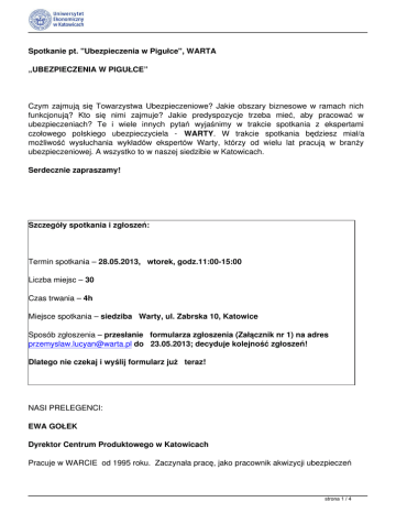 Spotkanie pt. "Ubezpieczenia w Pigułce", WARTA „UBEZPIECZENIA W PIGUŁCE” Czym zajmują się Towarzystwa Ubezpieczeniowe? Jakie obszary biznesowe w ramach nich funkcjonują? Kto się nimi zajmuje? Jakie predyspozycje trzeba mieć, aby pracować w ubezpieczeniach? Te i wiele innych pytań wyjaśnimy w trakcie spotkania z ekspertami czołowego polskiego ubezpieczyciela - WARTY. W trakcie spotkania będziesz miał/a możliwość wysłuchania wykładów ekspertów Warty, którzy od wielu lat pracują w branży ubezpieczeniowej. A wszystko to w naszej siedzibie w Katowicach. Serdecznie zapraszamy! Szczegóły spotkania i zgłoszeń: Termin spotkania – 28.05.2013, wtorek, godz.11:00-15:00 Liczba miejsc – 30 Czas trwania – 4h Miejsce spotkania – siedziba Warty, ul. Zabrska 10, Katowice Sposób zgłoszenia – przesłanie formularza zgłoszenia (Załącznik nr 1) na adres [email protected] do 23.05.2013; decyduje kolejność zgłoszeń! Dlatego nie czekaj i wyślij formularz już teraz! NASI PRELEGENCI: EWA GOŁEK Dyrektor Centrum Produktowego w Katowicach Pracuje w WARCIE od 1995 roku. Zaczynała pracę, jako pracownik akwizycji ubezpieczeń strona 1 / 4 mieszkaniowych i osobowych zajmowała się również likwidacją szkód. Od roku 2005 pracuje w Centrum Produktowym w Katowicach. Od 5 lat jest Dyrektorem Centrum Produktowego w Katowicach ( w roku 2011 również CP w Krakowie). Jej pasją są produkty mieszkaniowe i osobowe jest współautorką OWU WARTA DOM i WARTA DOM KOMFORT. Podczas swojego wystąpienia : Wyjaśni, czym zajmuje się Centrum Produktowe; Ogólnie przybliży zakres ubezpieczeń mieszkaniowych WARTY; Omówi usługi Assistance WDK+ – najlepszy na rynku bezpłatny pakiet usług zapewniający ochronę w domu i poza nim; Zaprezentuje zakres ochrony PAKIET TOREBKA. MARIUSZ MŁOCZEK Kierujący Zespołem Negocjacyjnym w Centrum Obsługi Klientów Korporacyjnych w Katowicach Absolwent Specjalności Ubezpieczenia na Akademii Ekonomicznej w Katowicach. Ukończył także studia podyplomowe specjalność „Wycena nieruchomości”. Od dziesięciu lat zajmuje się obsługą klientów korporacyjnych w zakresie ubezpieczeń majątkowych oraz komunikacyjnych. Od lipca 2007 r. pracuje w Warcie, najpierw jako Negocjator Ubezpieczeń Korporacyjnych, następnie jako Menedżer Zespołu Negocjacyjnego. Do jego zadań należy obsługa kluczowych Klientów Warty z sektora średnich oraz dużych przedsiębiorstw oraz koordynacja pracy zespołu negocjatorów oferujących kompleksową ofertę dla sektora korporacyjnego. Podczas swojego wystąpienia: Przybliży kwestię zarządzania ryzykiem dla podmiotów gospodarczych; Omówi proces tworzenia i aranżowania programów ubezpieczeniowych gospodarczych; Wyjaśni na czym polega praca underwritera i kto może nim zostać. dla podmiotów JUSTYNA SZPAK Trener w Departamencie Contact Center strona 2 / 4 Z wykształcenia psycholog oraz absolwentka Pedagogiki resocjalizacyjnej. Trenerka z kilkuletnim doświadczeniem, w Warcie od stycznia 2012 r. Specjalizuje się w szkoleniach miękkich, obejmujących m.in. komunikację interpersonalną, asertywność, radzenie sobie ze stresem. Towarzyszy konsultantom w codziennej pracy, prowadząc również szkolenia merytoryczne, monitorując jakość pracy oraz wspierając podczas coachingów. Merytorycznie odpowiada za wiedzę związaną ze zgłoszeniami szkód osobowych, czyli połamane ręce na nartach lub bóle zęba w Egipcie. Dodatkowo angażuje się w procesy rekrutacyjne konsultantów. W trakcie spotkania: Przedstawi rolę oraz zadania konsultanta w Departamencie Contact Center ; „Nie taki klient straszny, jak go malują”, czyli ćwiczenie warsztatowe dotyczącego obsługi klienta. Przybliży sylwetkę trenera. Prowadzący spotkanie: JAN ENGLISZ Koordynator Rekrutacji i Oceny Potencjału Absolwent Wydziału Psychologii Uniwersytetu Warszawskiego. Z obszarem HR związany od 2006 roku. Pracował dla koncernów należących do światowej czołówki branży farmaceutycznej: Sandoz, Novartis, Quintiles. W styczniu 2012 dołączył do Biura Rozwoju Zasobów Ludzkich w HDI-Asekuracja. Obecnie członek Zespołu Rekrutacji i Ocen Warty. Posiada siedmioletnie doświadczenie w prowadzeniu projektów rekrutacyjnych na stanowiska specjalistyczne i menedżerskie w różnych obszarach, w tym sprzedaży. Specjalizuje się w złożonych technikach diagnozy kompetencji (Assessment/Development Center, wywiad ukierunkowany). Certyfikowany asesor współpracujący z firmami doradztwa personalnego: Point, HR Support. Prywatnie zapalony muzyk: perkusista formacji Lostbone, TMS oraz dziennikarz magazynu „Perkusista”. www.warta.pl/kariera strona 3 / 4 strona 4 / 4